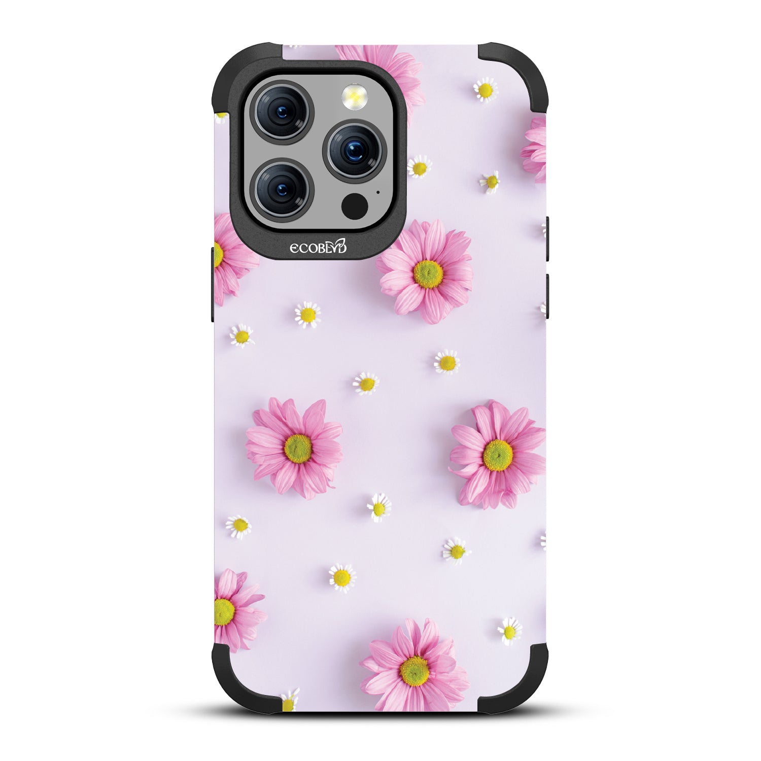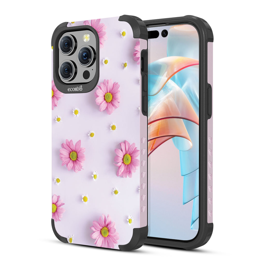 Our Whoopsie Daisy design on our Mojave rugged and compostable iPhone 15 Pro Max case. is the perfect surprise element. Delicate white and pink daisies playfully emerge from our Pastel Lilac canvas, reminding you that beauty often sprouts from unexpected moments. Let each 'whoops' be a chance to grow and find joy in the little mishaps of life.