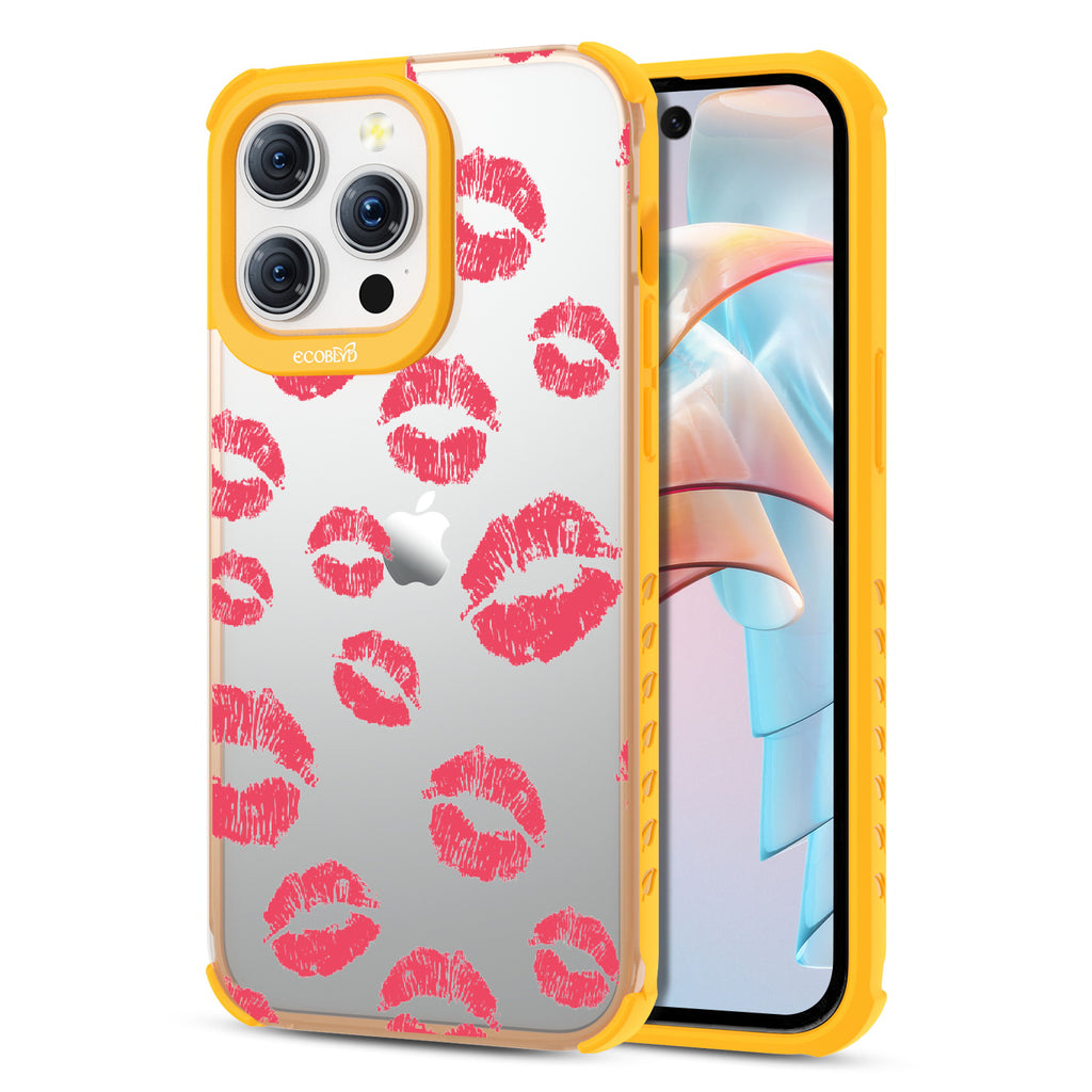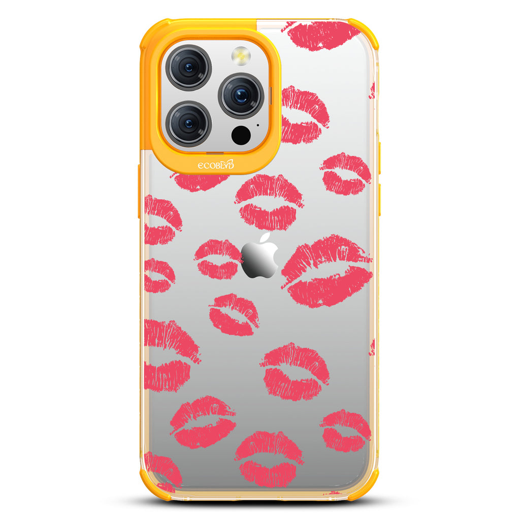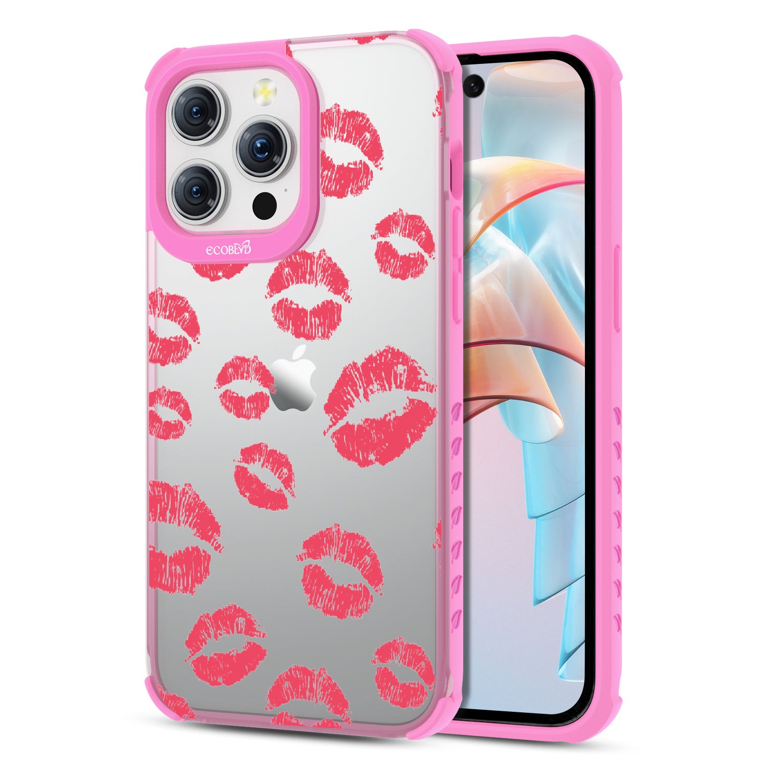 Put on your best flirt with our Bisou design on our Laguna clear compostable iPhone 15 Pro Max case, featuring an array of playful red lipstick kisses that are sure to make any head turn and a touch of je ne sais quoi to your phone on five fierce colorways: Midnight Black, Cascade Blue, Pastel Lilac, Illuminating Yellow, and Wildflower Pink.