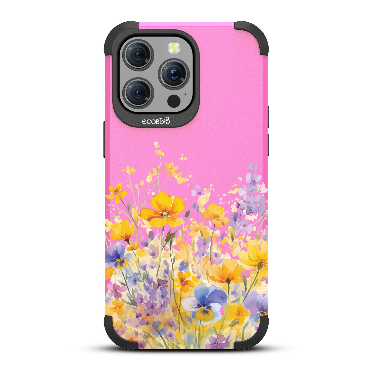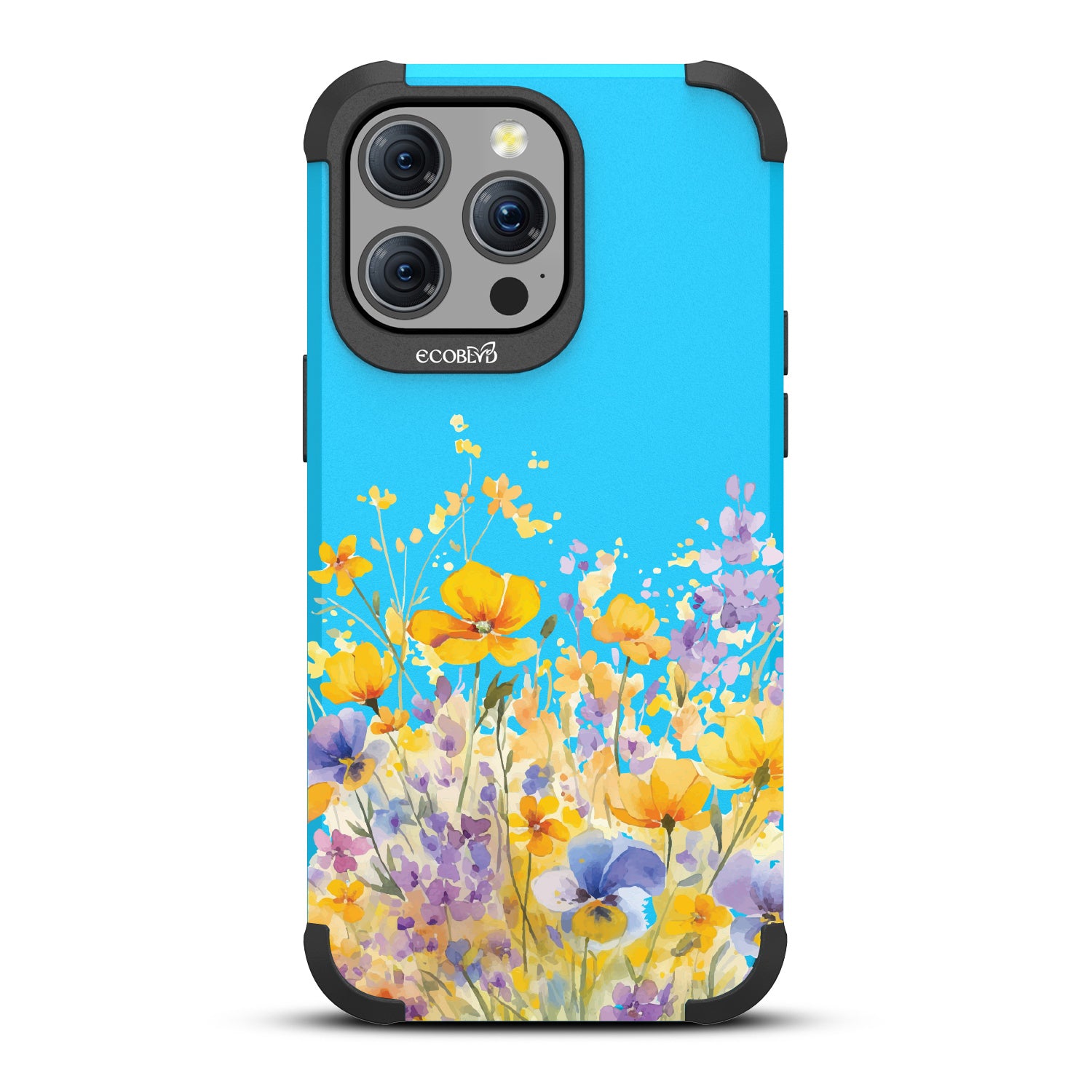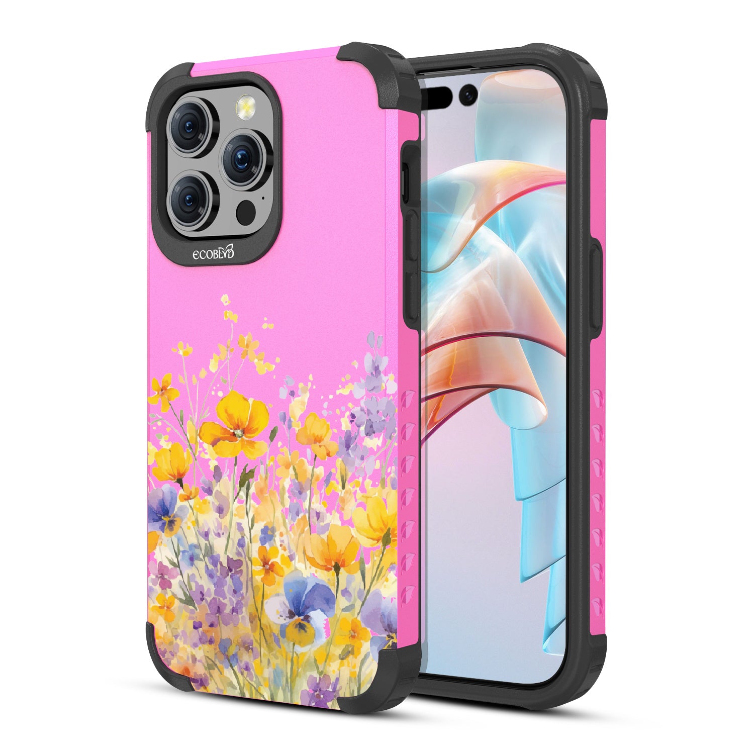 A moment in the light never looked so wild. The Meadowlight design on our Mojave rugged and compostable iPhone 15 Pro Max case lets soft florals run free in a watercolor wash of gold and lavender. A design that glows like a field at its most unfiltered.