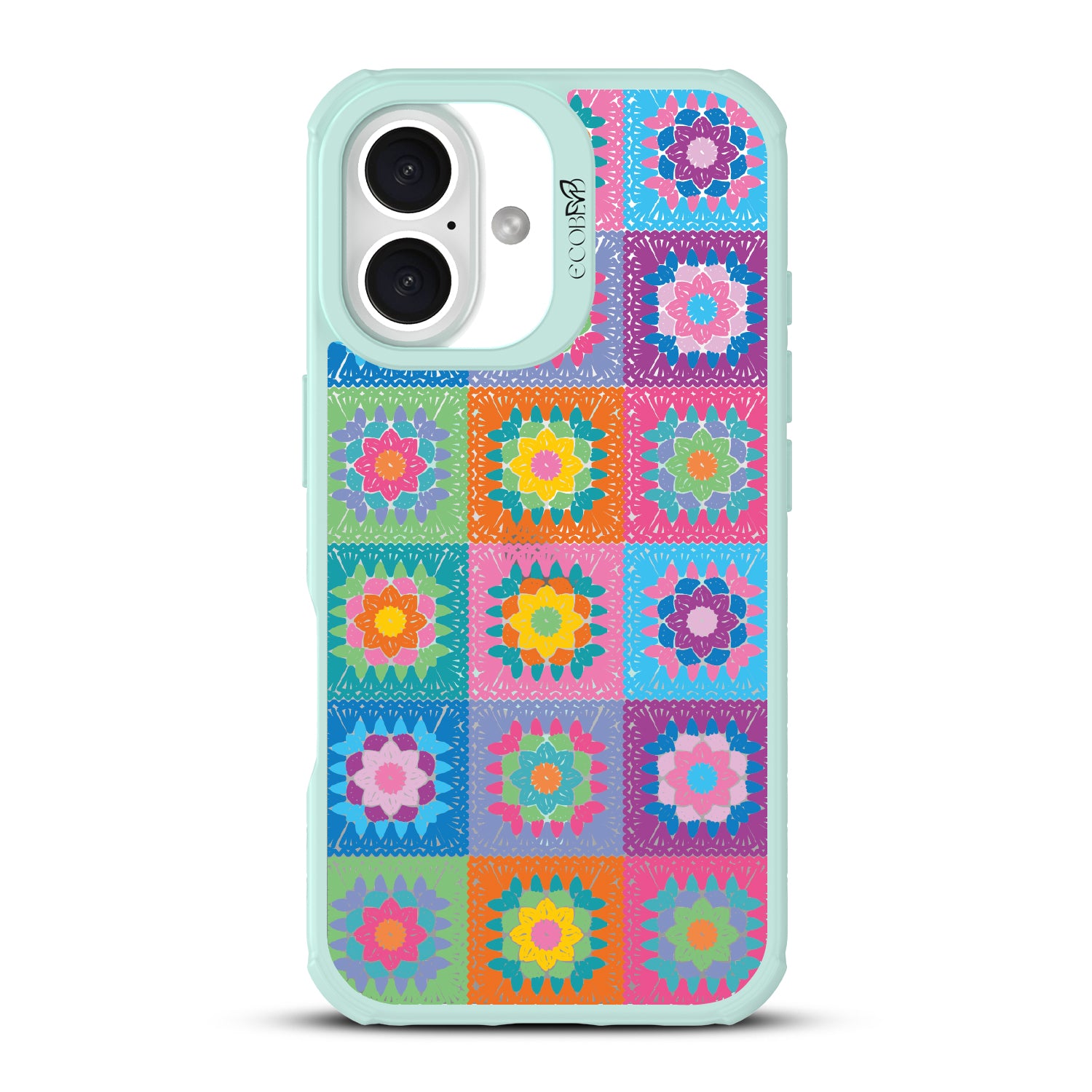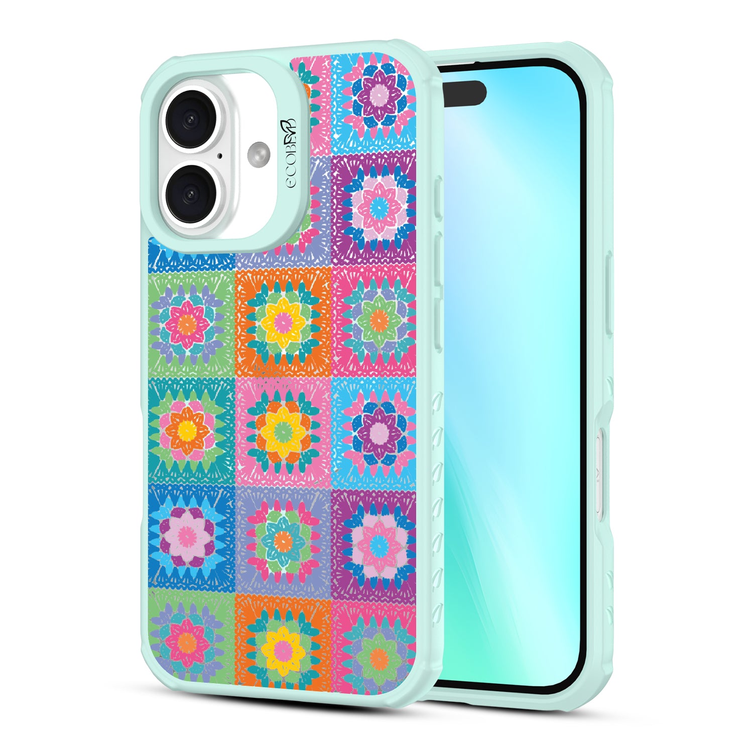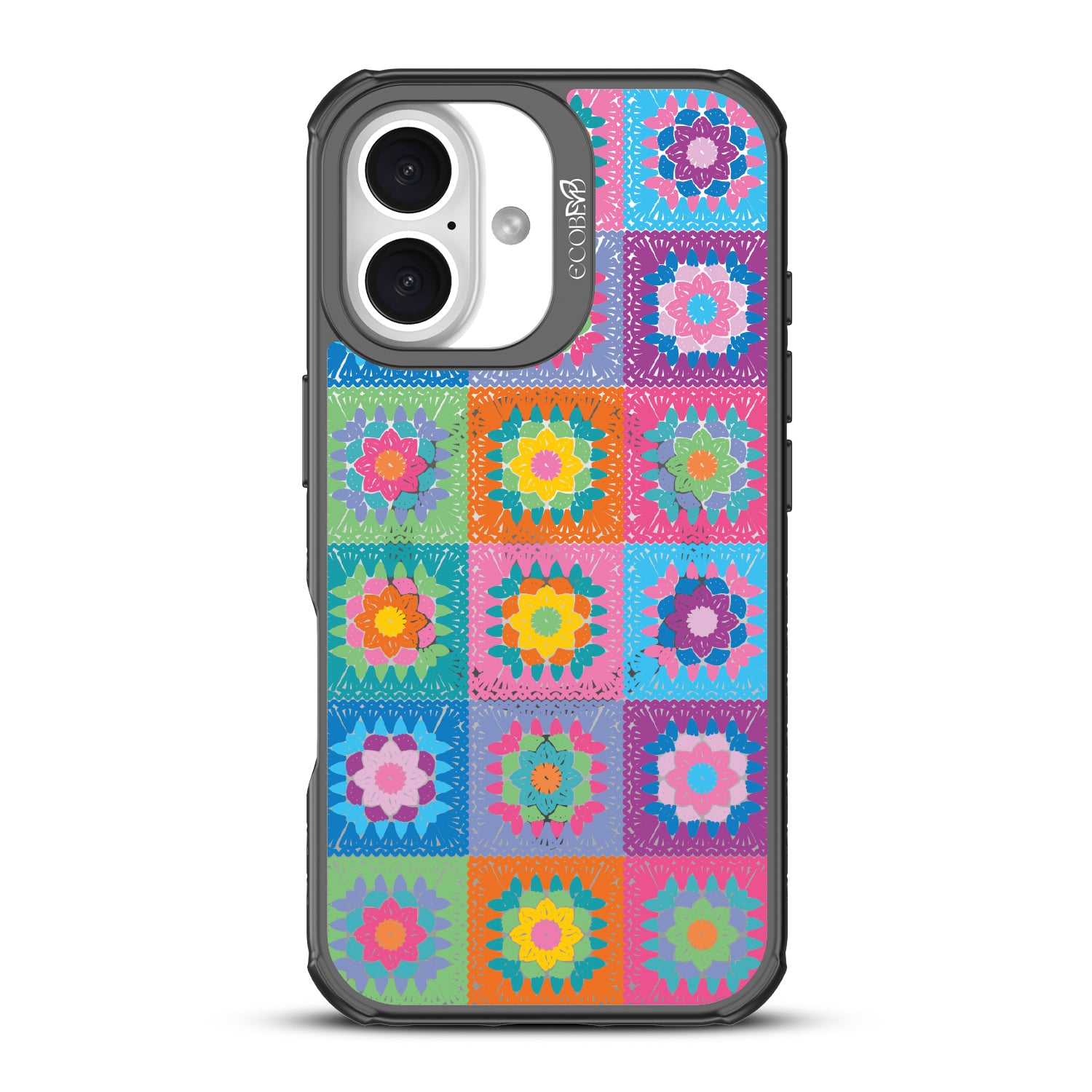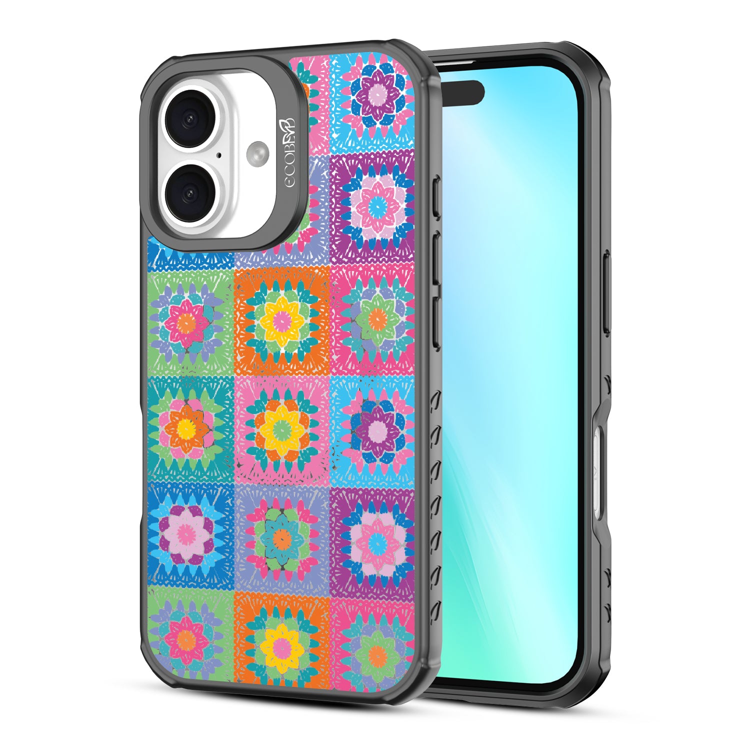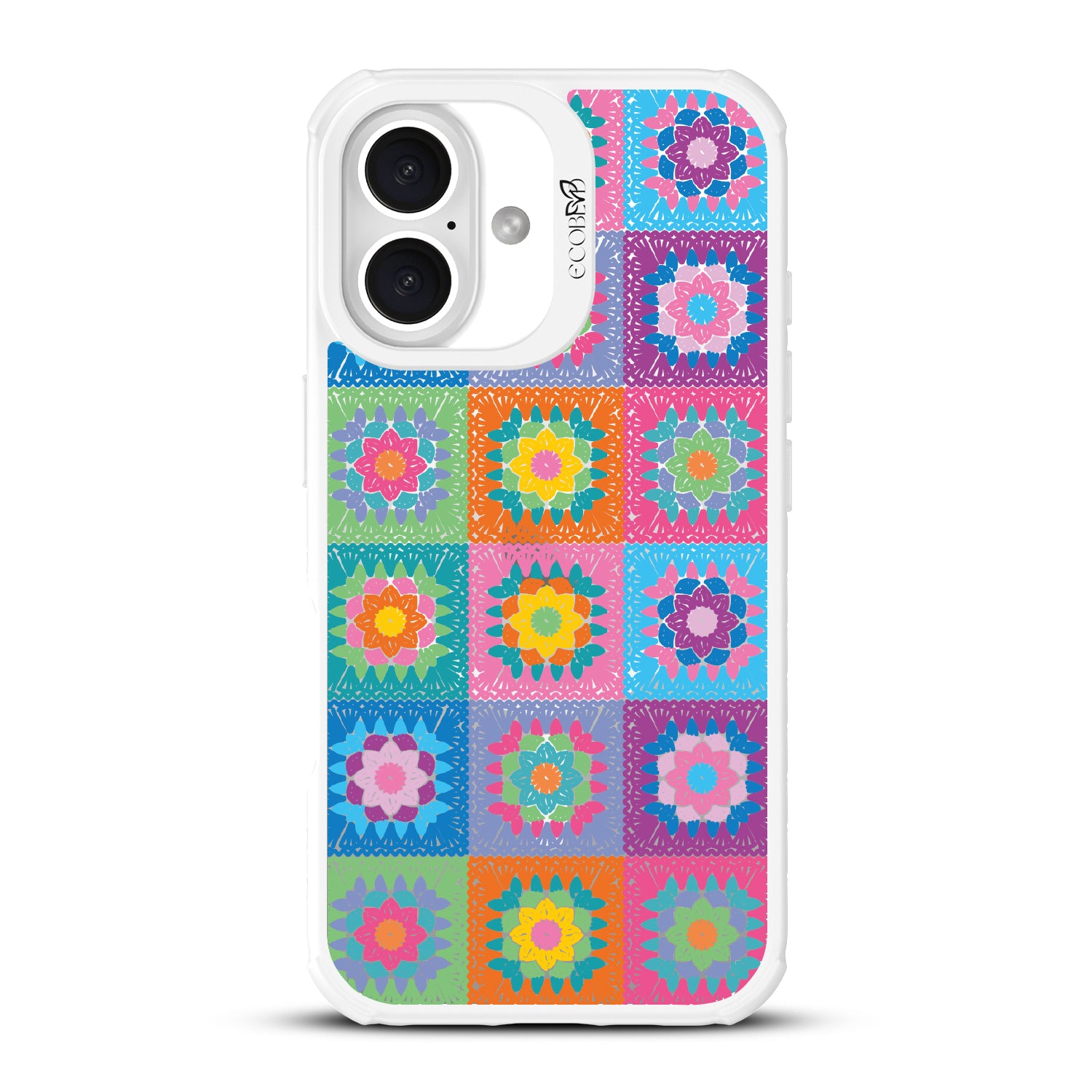 Let the All Squared Away design on our Revive clear iPhone 16 phone case be your constant companion for Spring Break and music fests, giving you a warm and inviting look with its quilt-like design of vintage granny squares and intricate flowers.