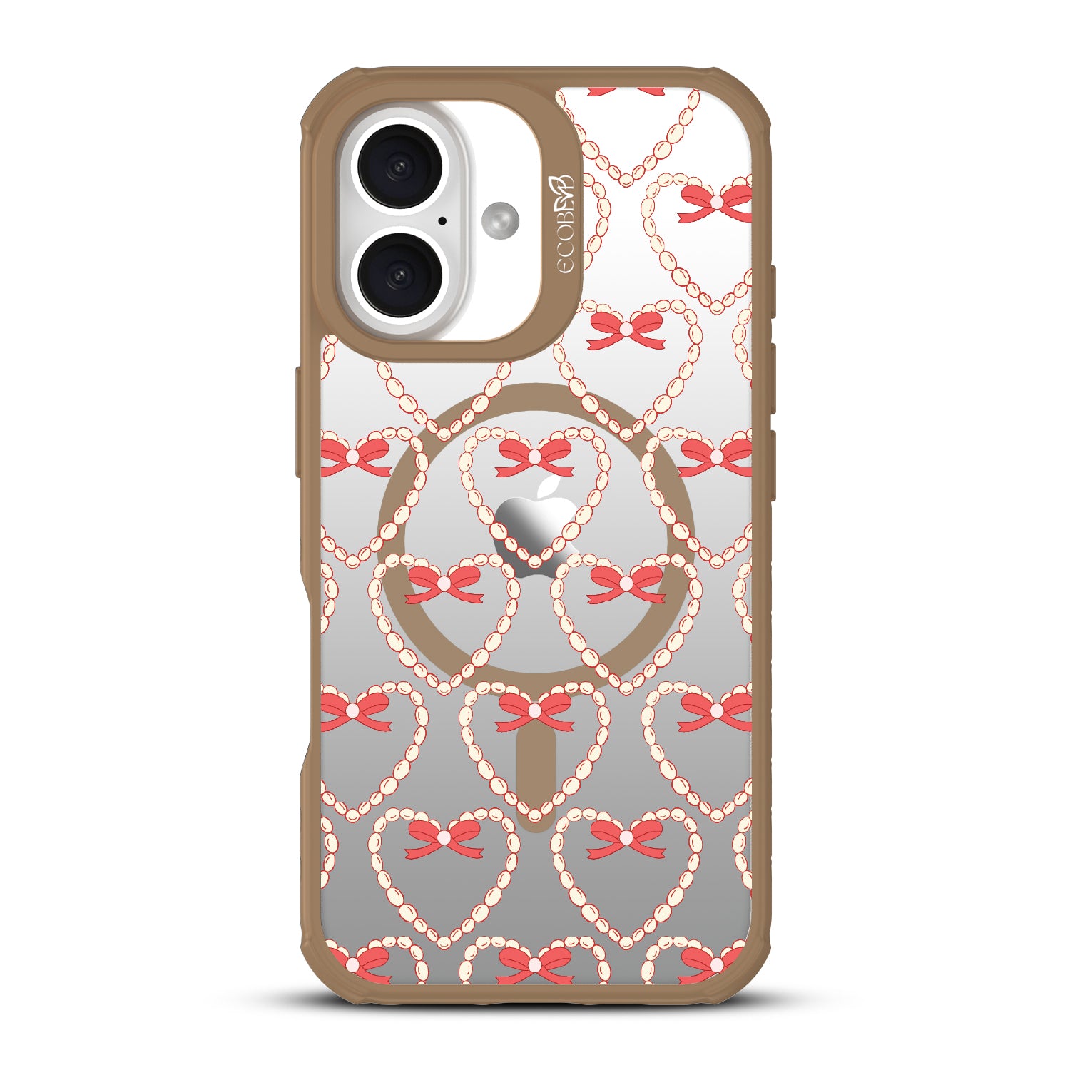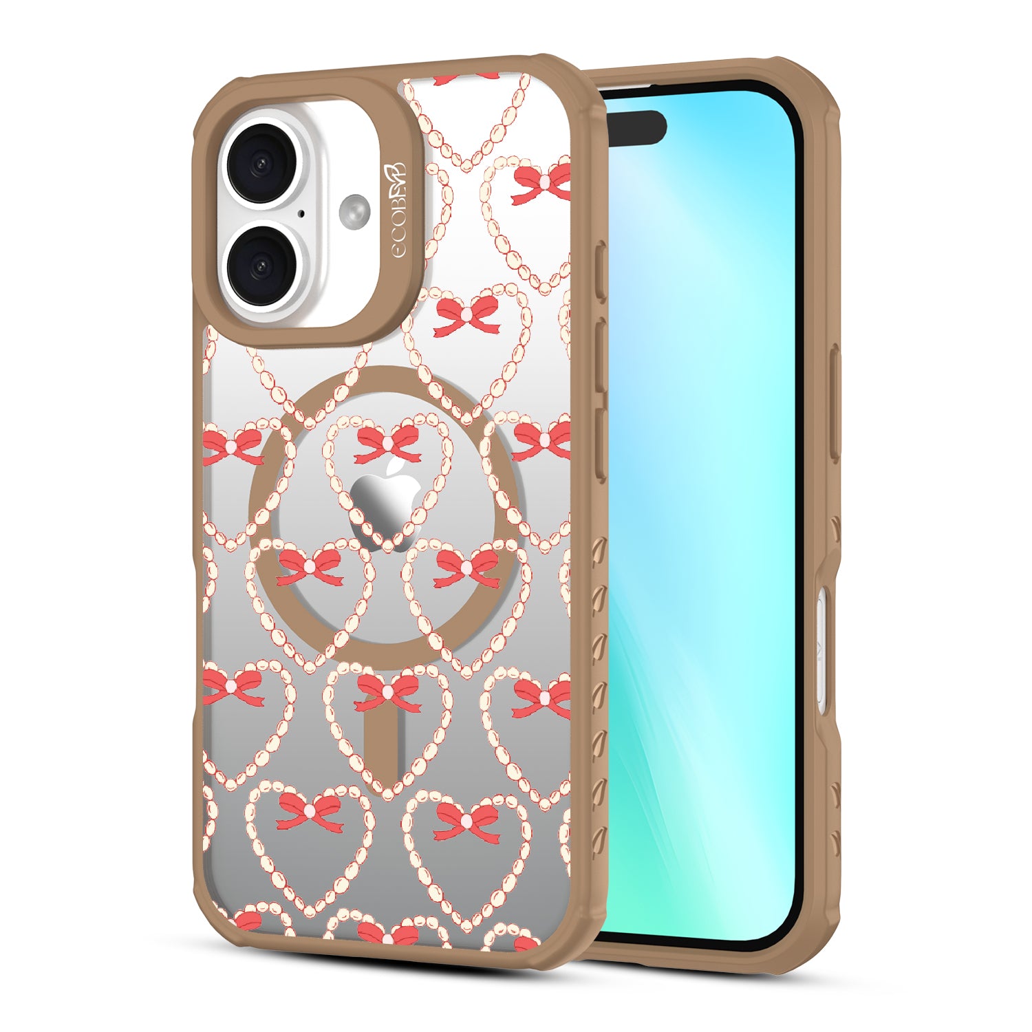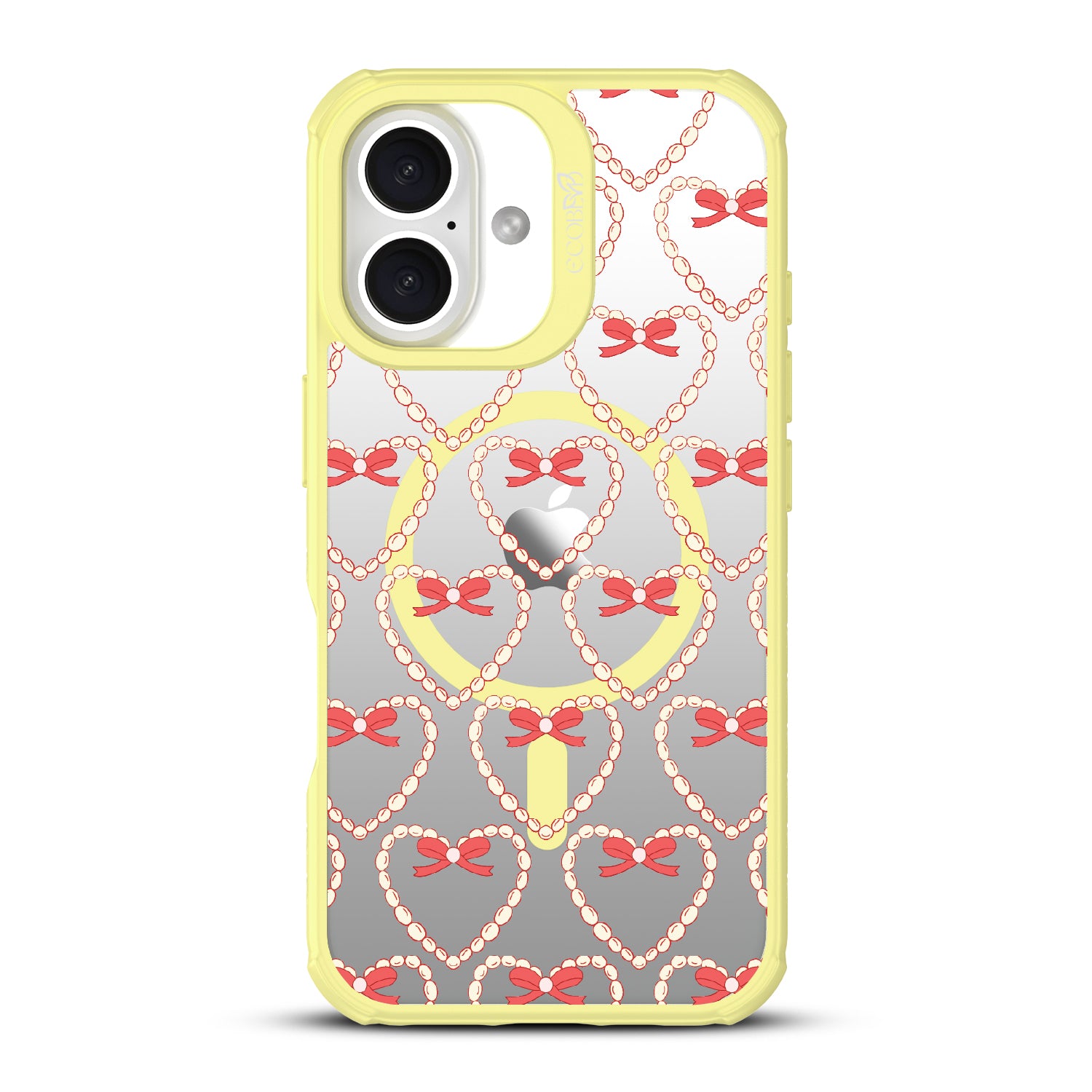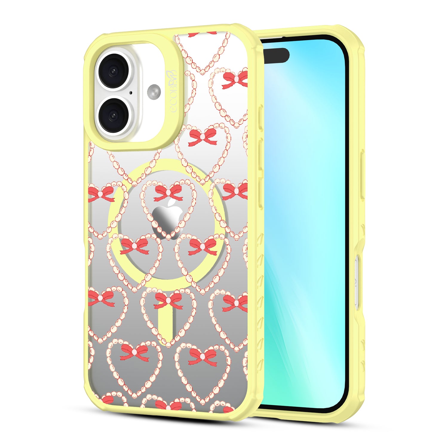 Tug at your Heart Strings with this beautifully crafted design on Revive clear iPhone 16 phone case, featuring delicate pearls and coquettish bows arranged in heart shapes. Let your phone strum the chords of elegance with this captivating pattern. Each heart-shaped detail will make your style sing in love songs.