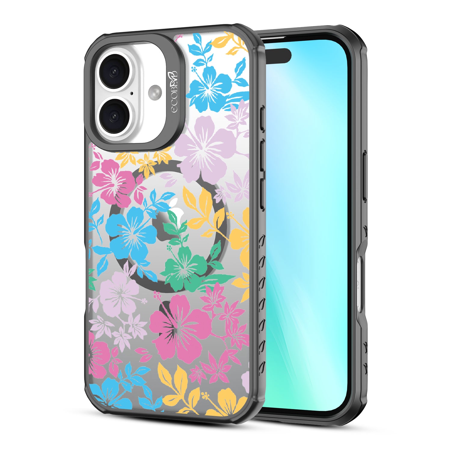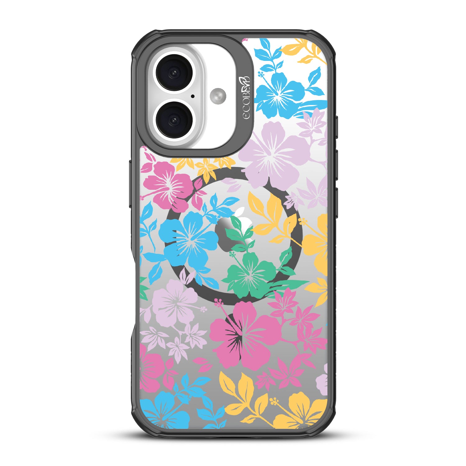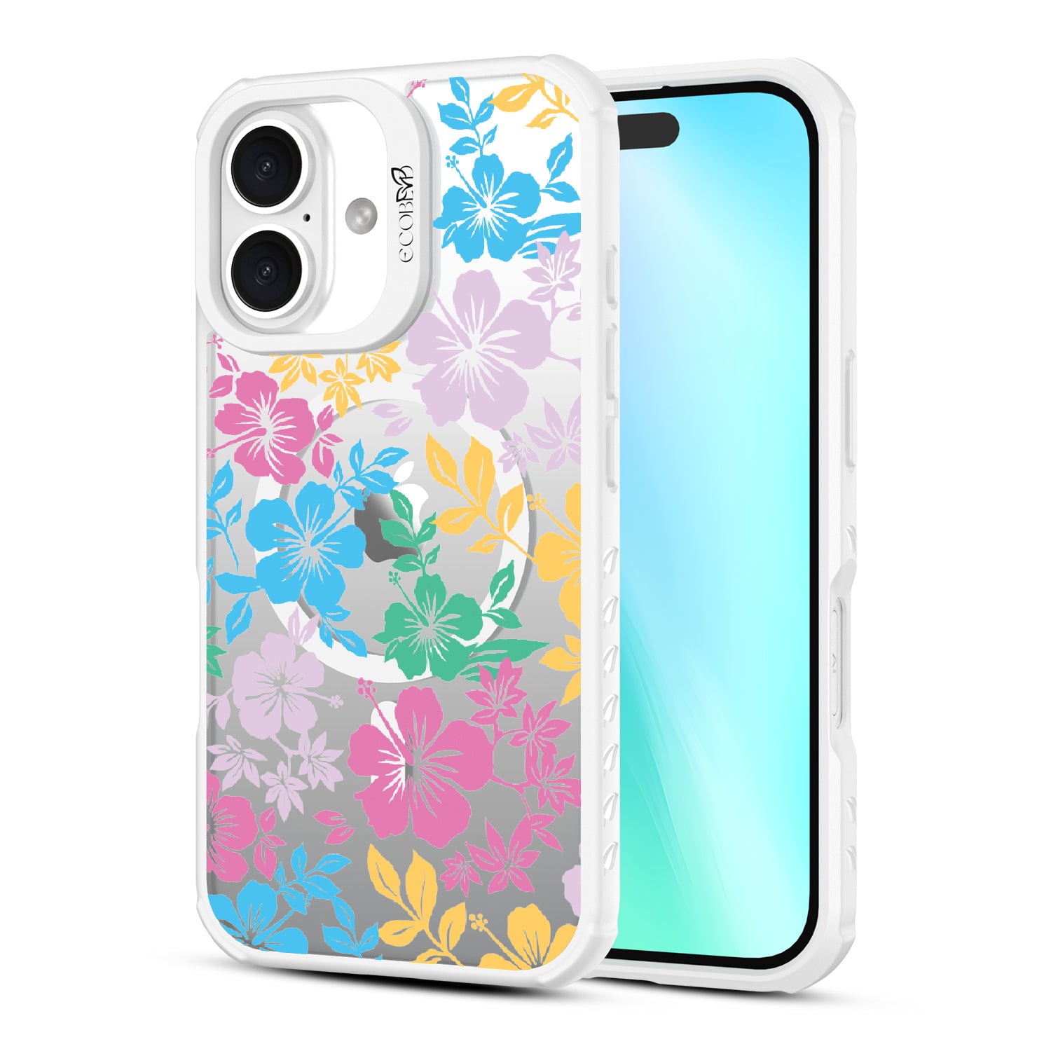 Experience the laid-back vibes of the tropics with our Lei'd Back design on our Revive clear iPhone 16 phone case, a colorful homage to the vibrant beauty of Hawaiian leis. his design showcases an array of tropical hibiscus flowers in yellow, pink, green, and blue, reminiscent of traditional lei arrangements. Enjoy the relaxed lifestyle of an island as you escape to the spirit of aloha.