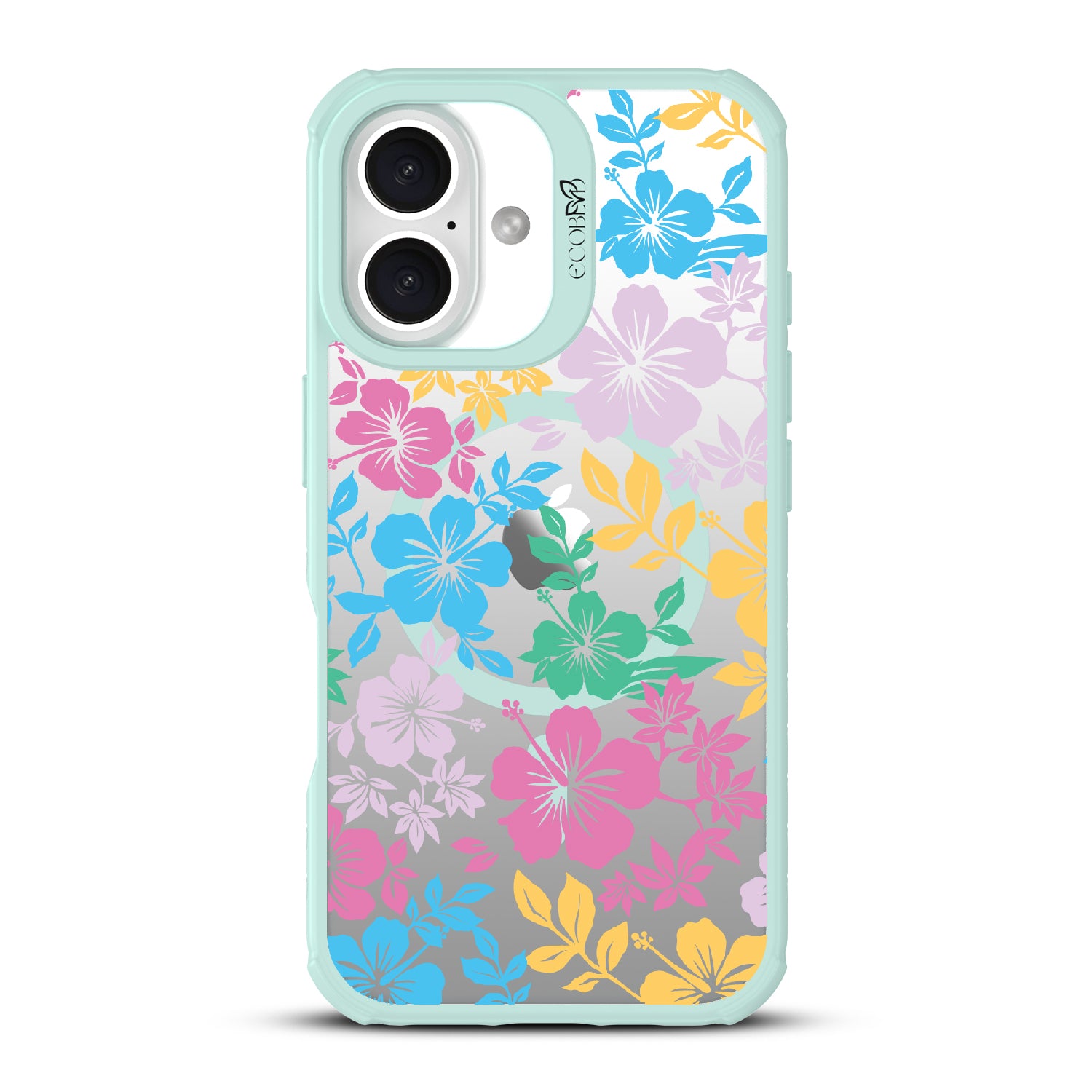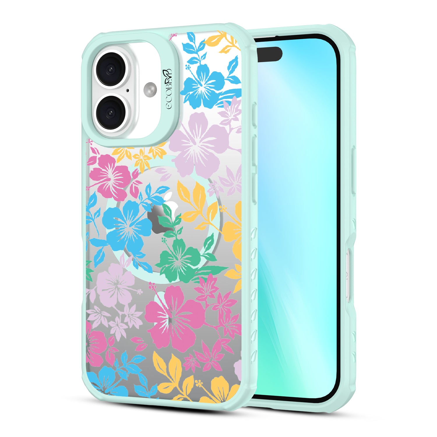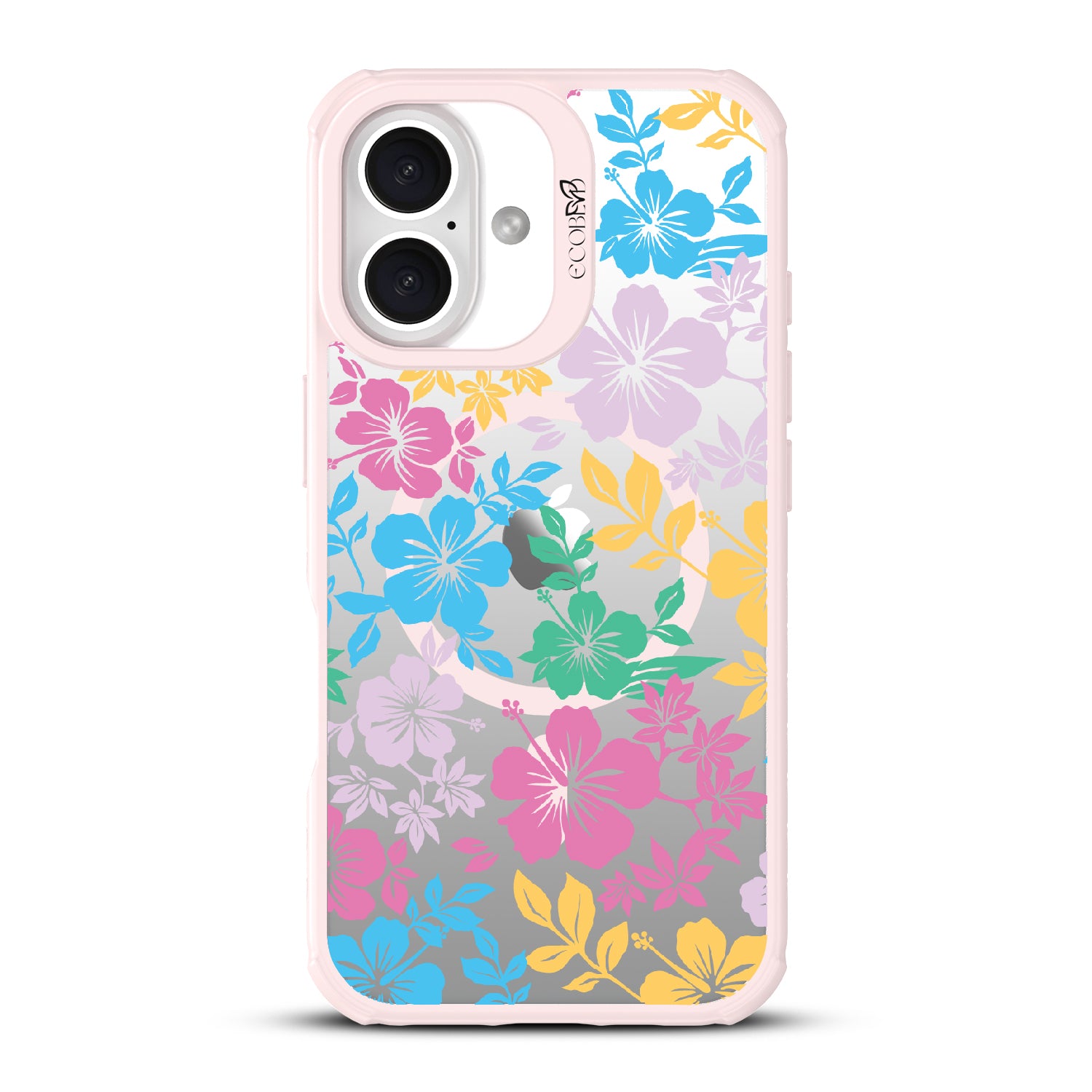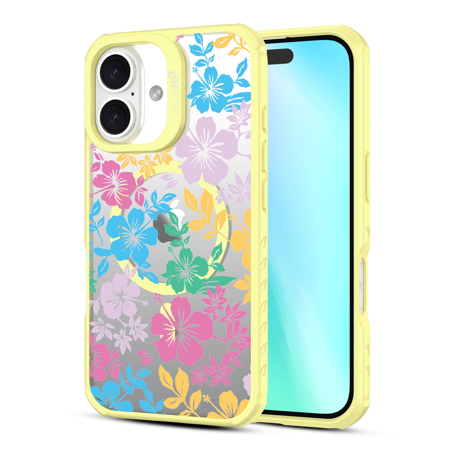 Experience the laid-back vibes of the tropics with our Lei'd Back design on our Revive clear iPhone 16 phone case, a colorful homage to the vibrant beauty of Hawaiian leis. his design showcases an array of tropical hibiscus flowers in yellow, pink, green, and blue, reminiscent of traditional lei arrangements. Enjoy the relaxed lifestyle of an island as you escape to the spirit of aloha.