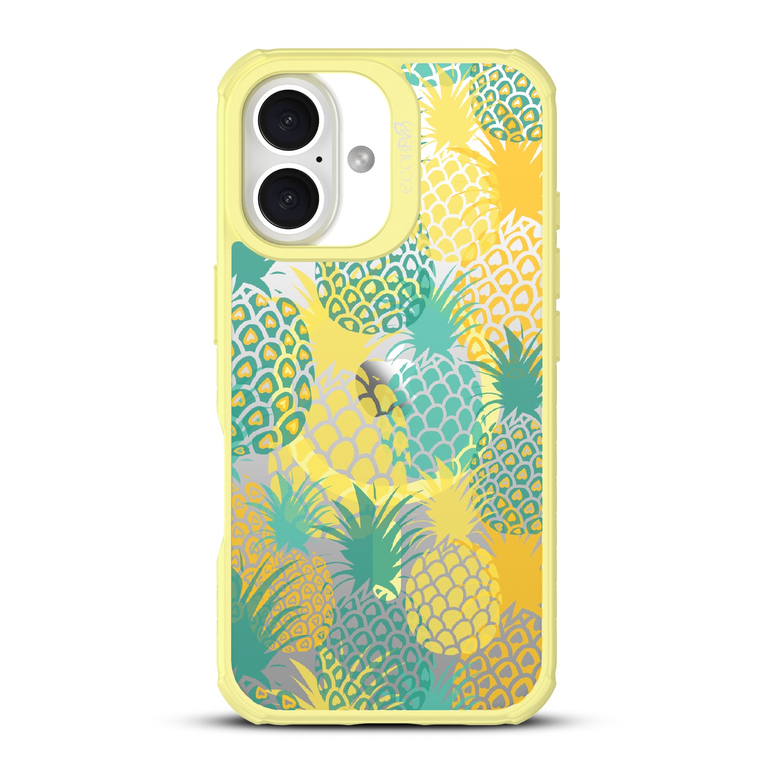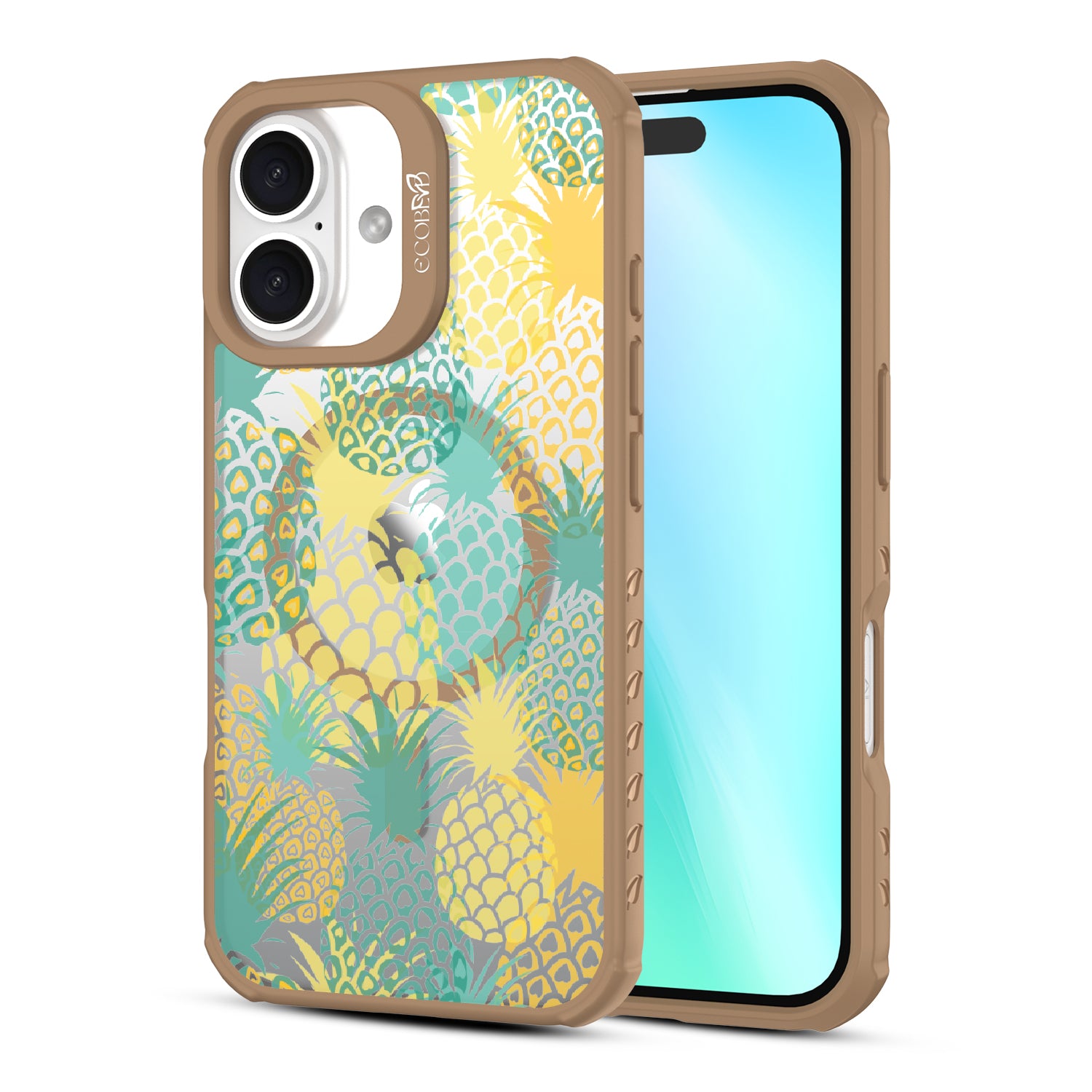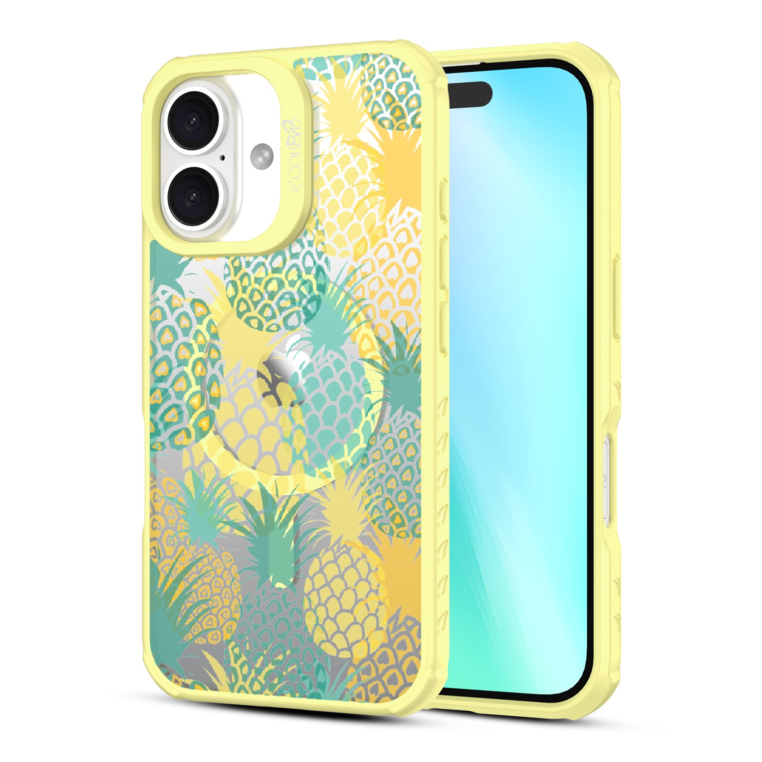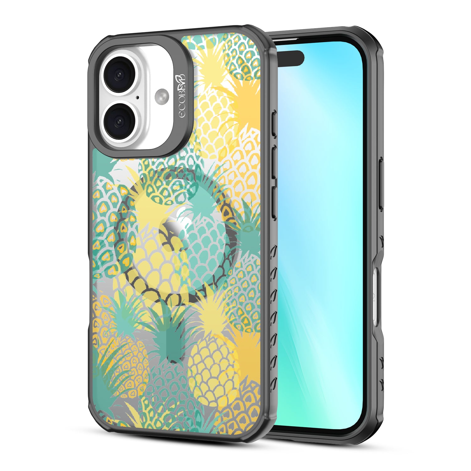 If you like Pina Coladas and getting caught in the sun, then this design on our Revive clear iPhone 16 phone case is for you! Pineapple Breeze is a refreshing phone case that embodies the spirit of tropical relaxation. Its vibrant array of ripe pineapples will transport you to exotic shores, where the golden rays of the sun dance upon your skin.