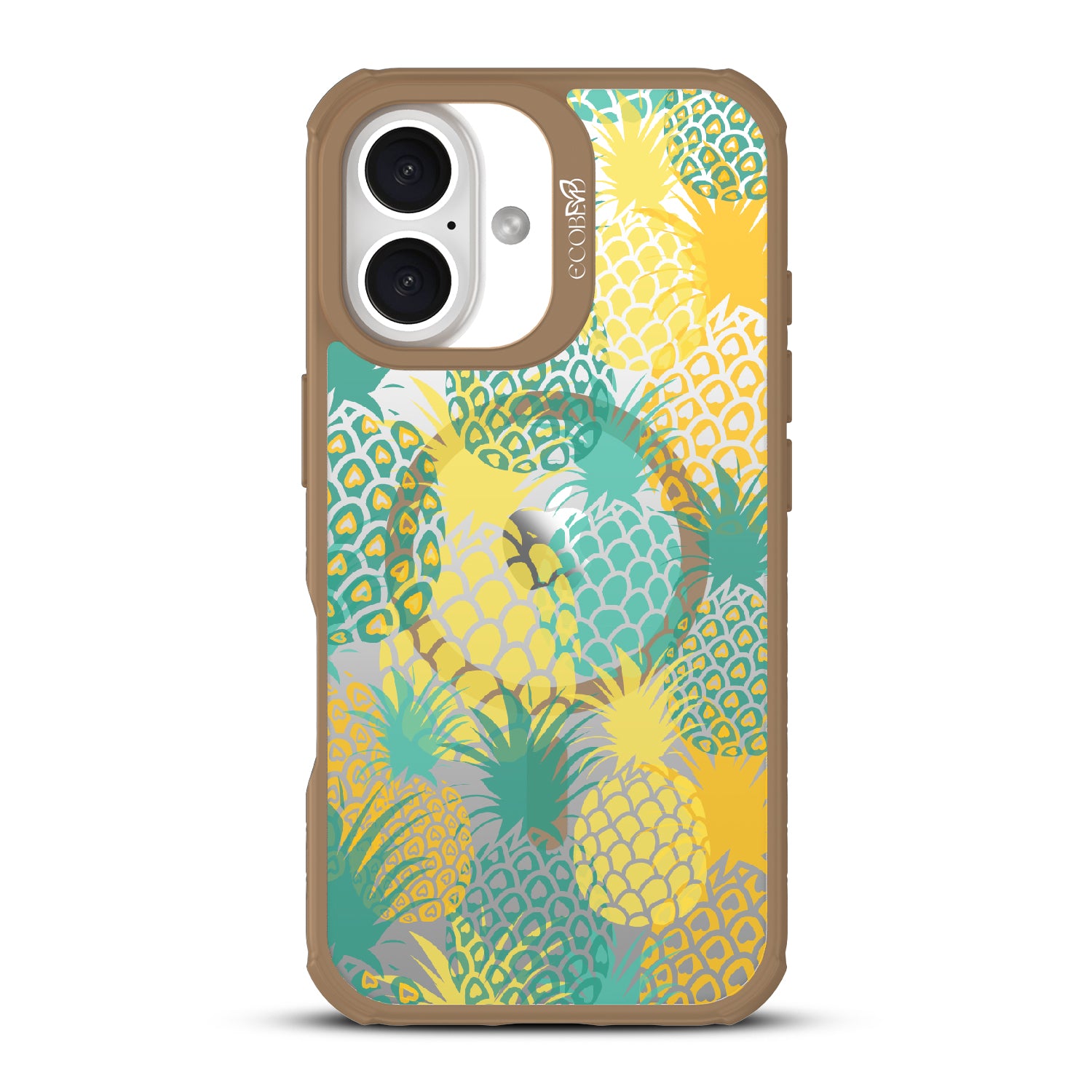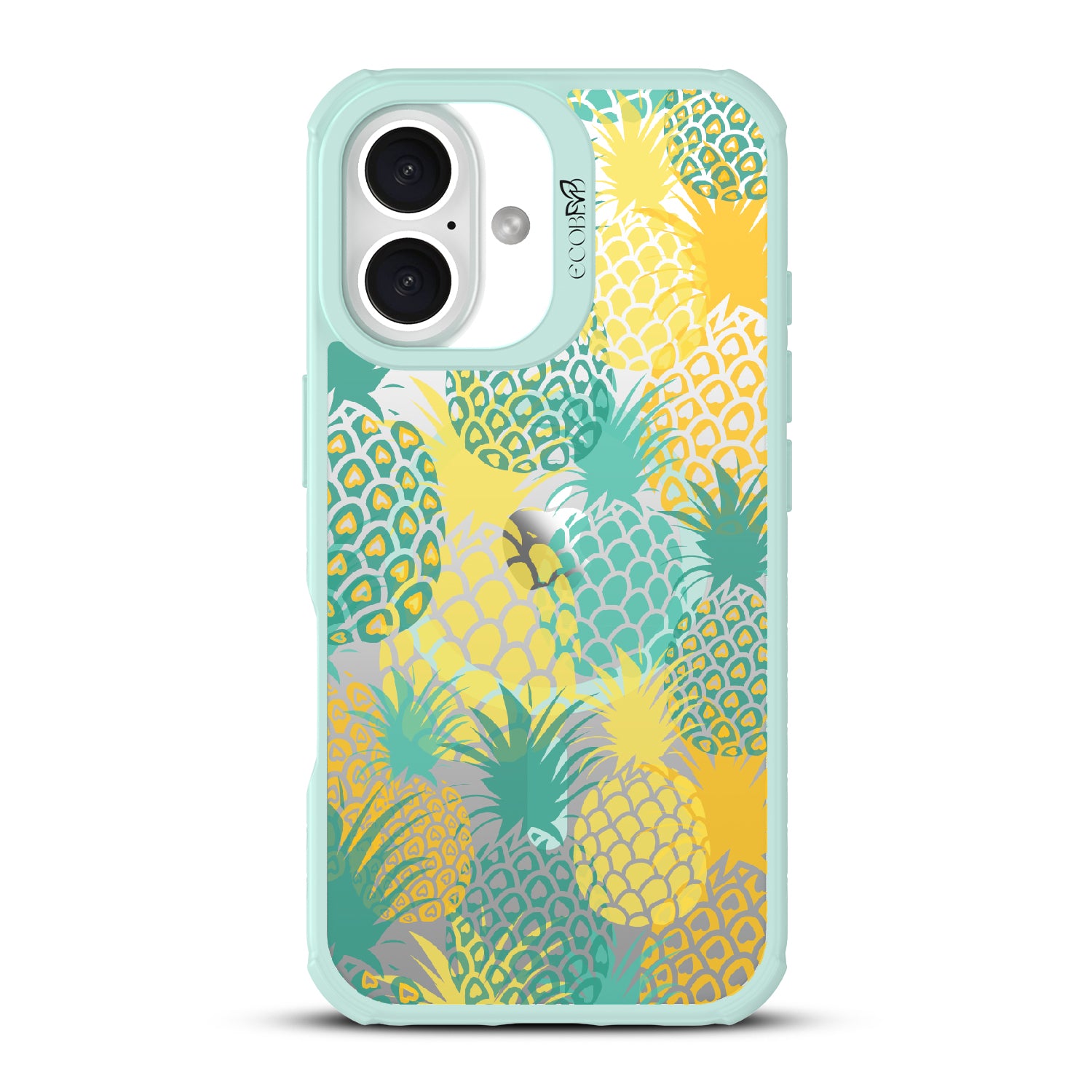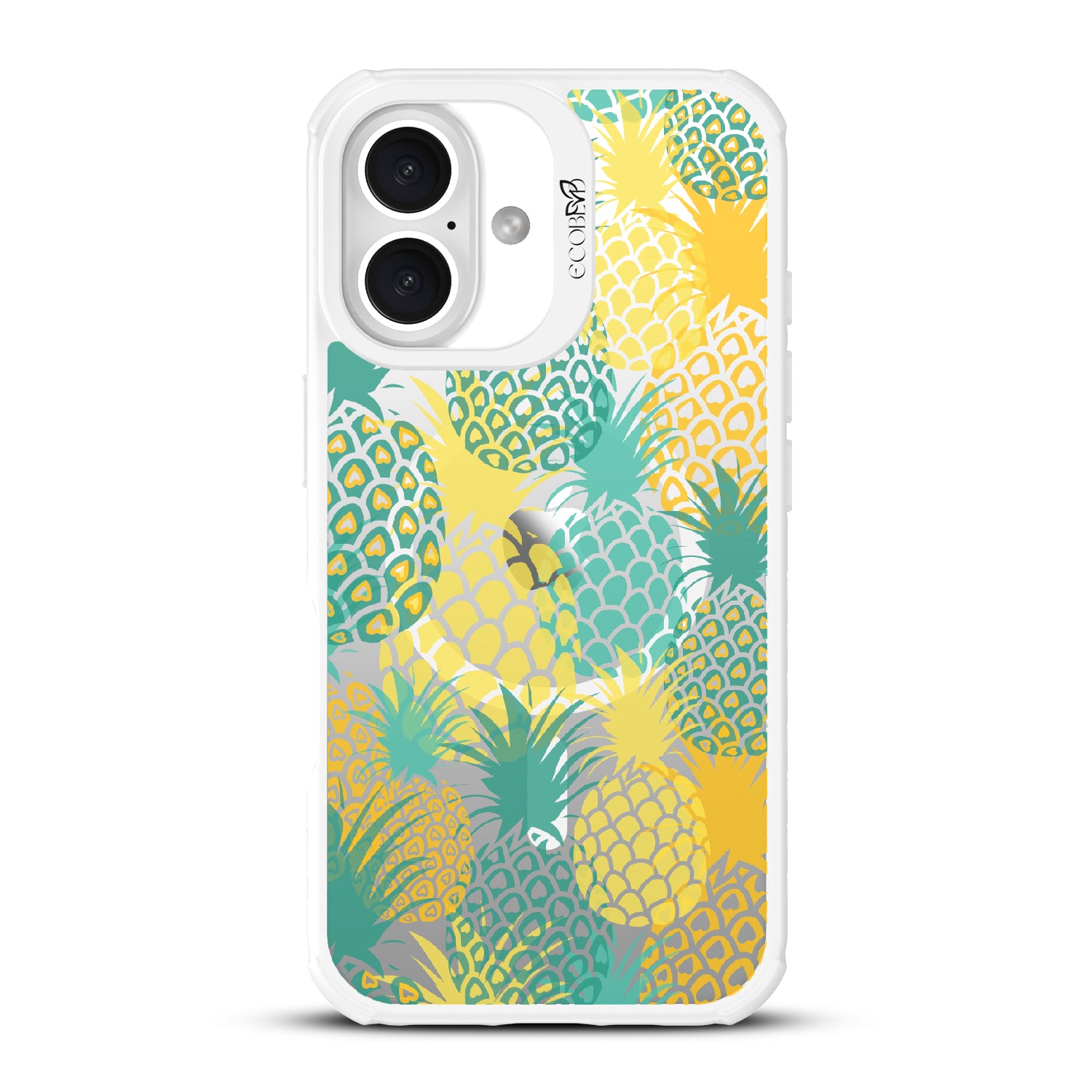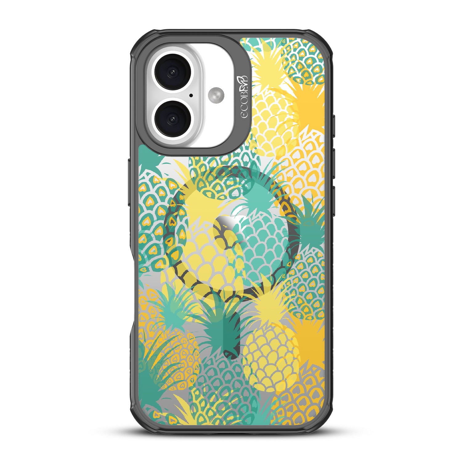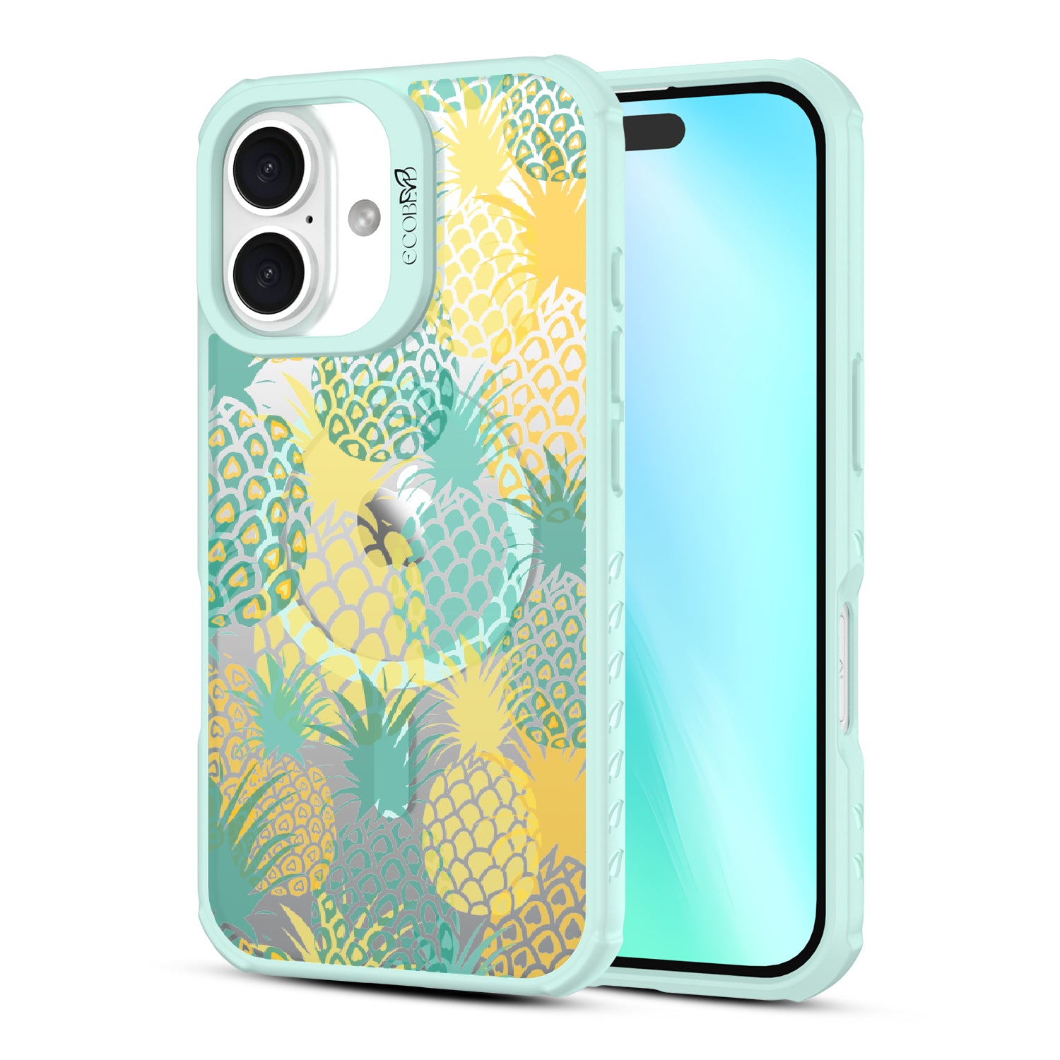 If you like Pina Coladas and getting caught in the sun, then this design on our Revive clear iPhone 16 phone case is for you! Pineapple Breeze is a refreshing phone case that embodies the spirit of tropical relaxation. Its vibrant array of ripe pineapples will transport you to exotic shores, where the golden rays of the sun dance upon your skin.