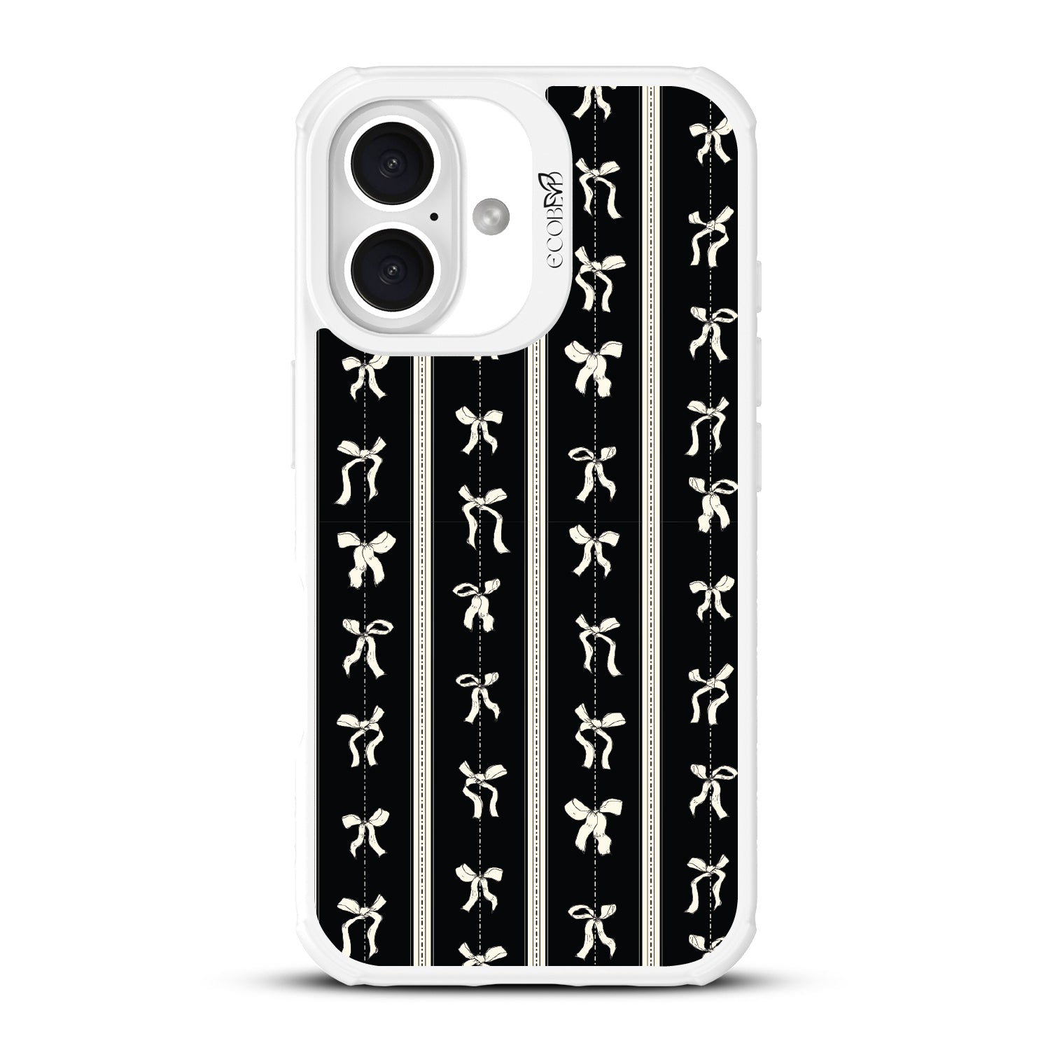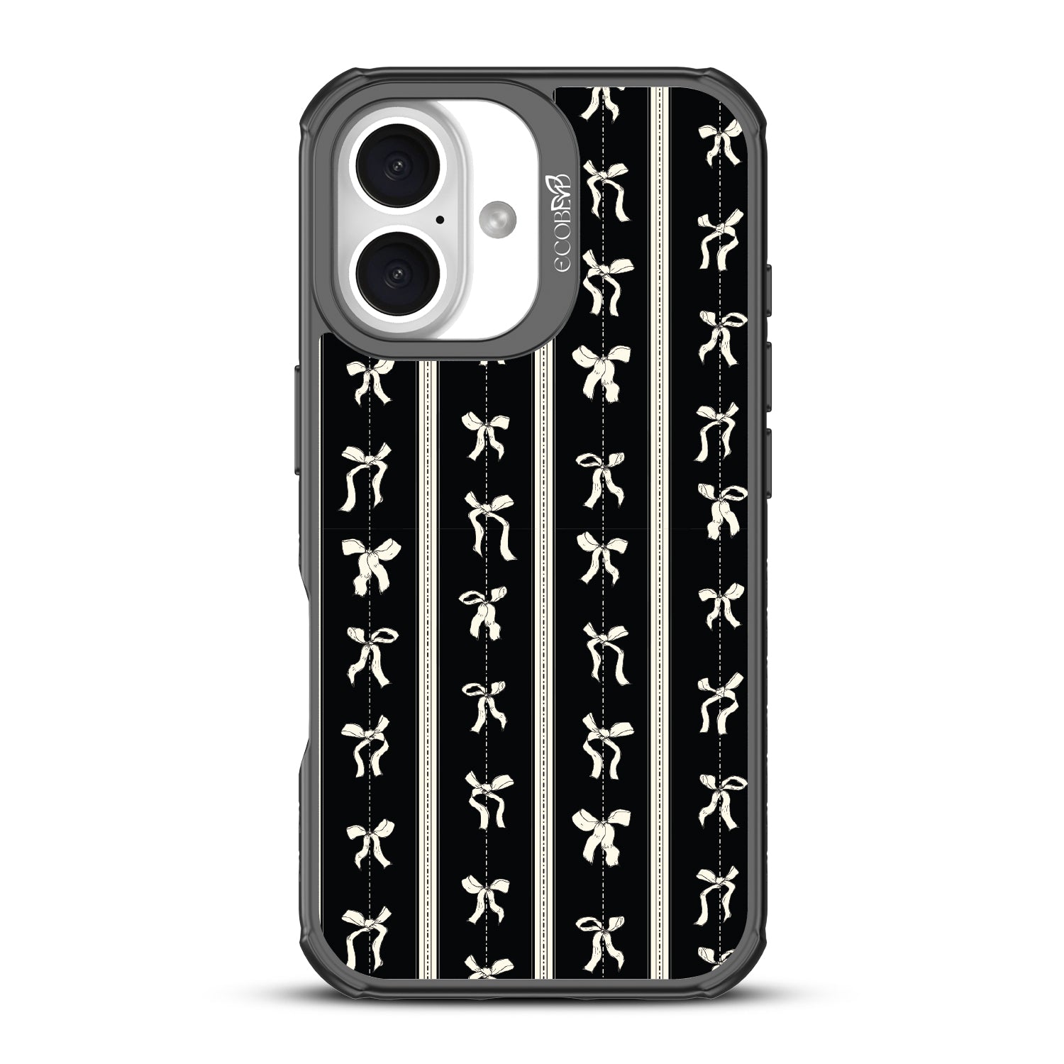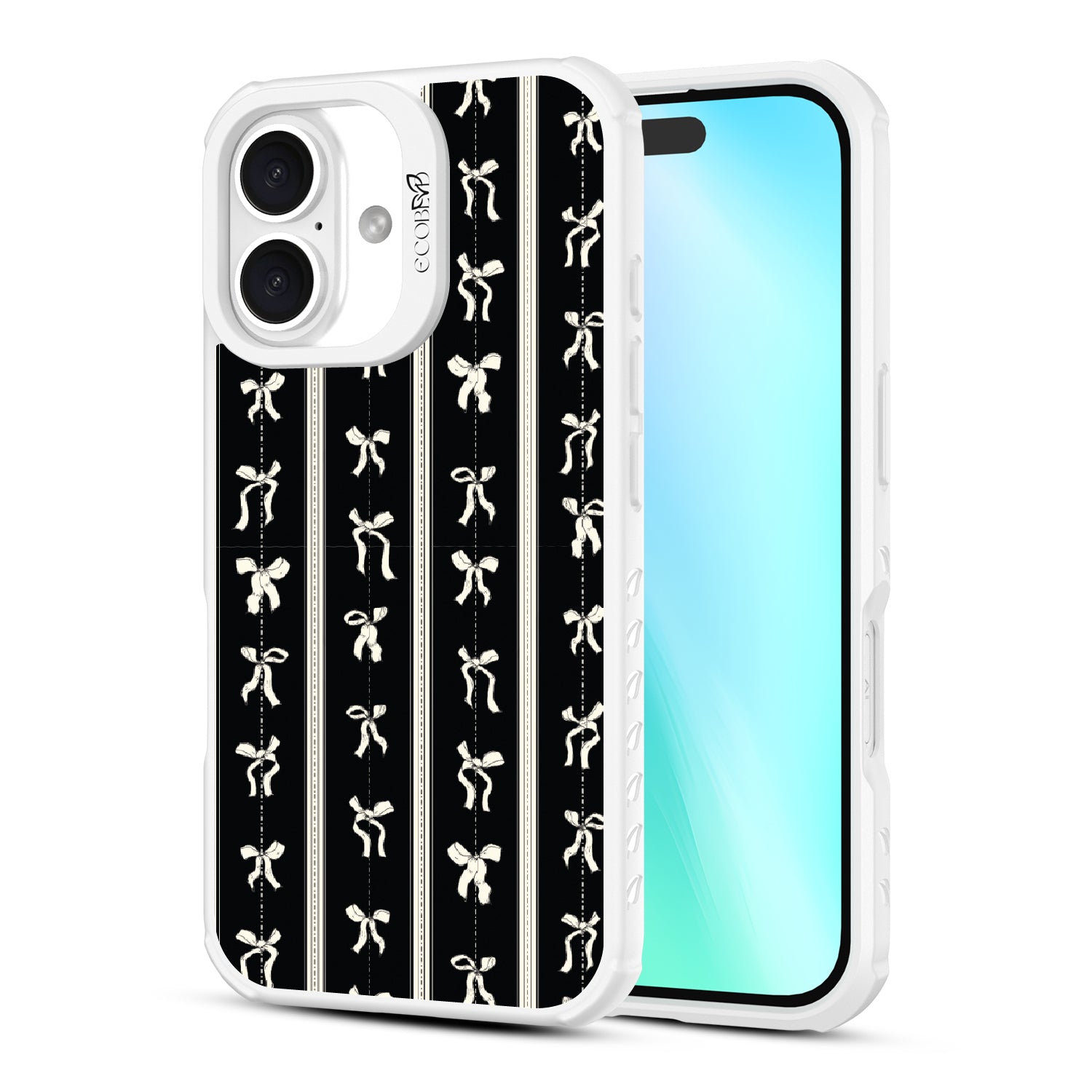 Twirl like no one¡¯s watching with the Ribbon Twirl design on our Revive clear iPhone 16 phone case. Ribbons gracefully swirl on a sleek black lace backdrop, infusing your look with dainty sophistication. These twirling ribbons will make every step feel like a stylish dance.