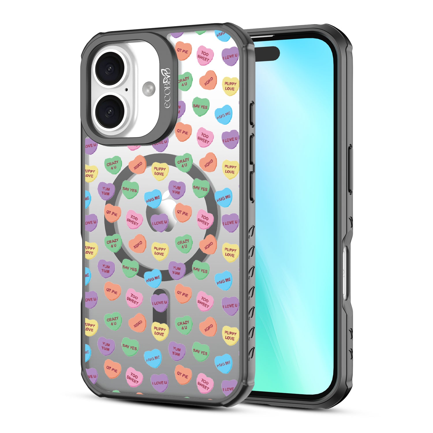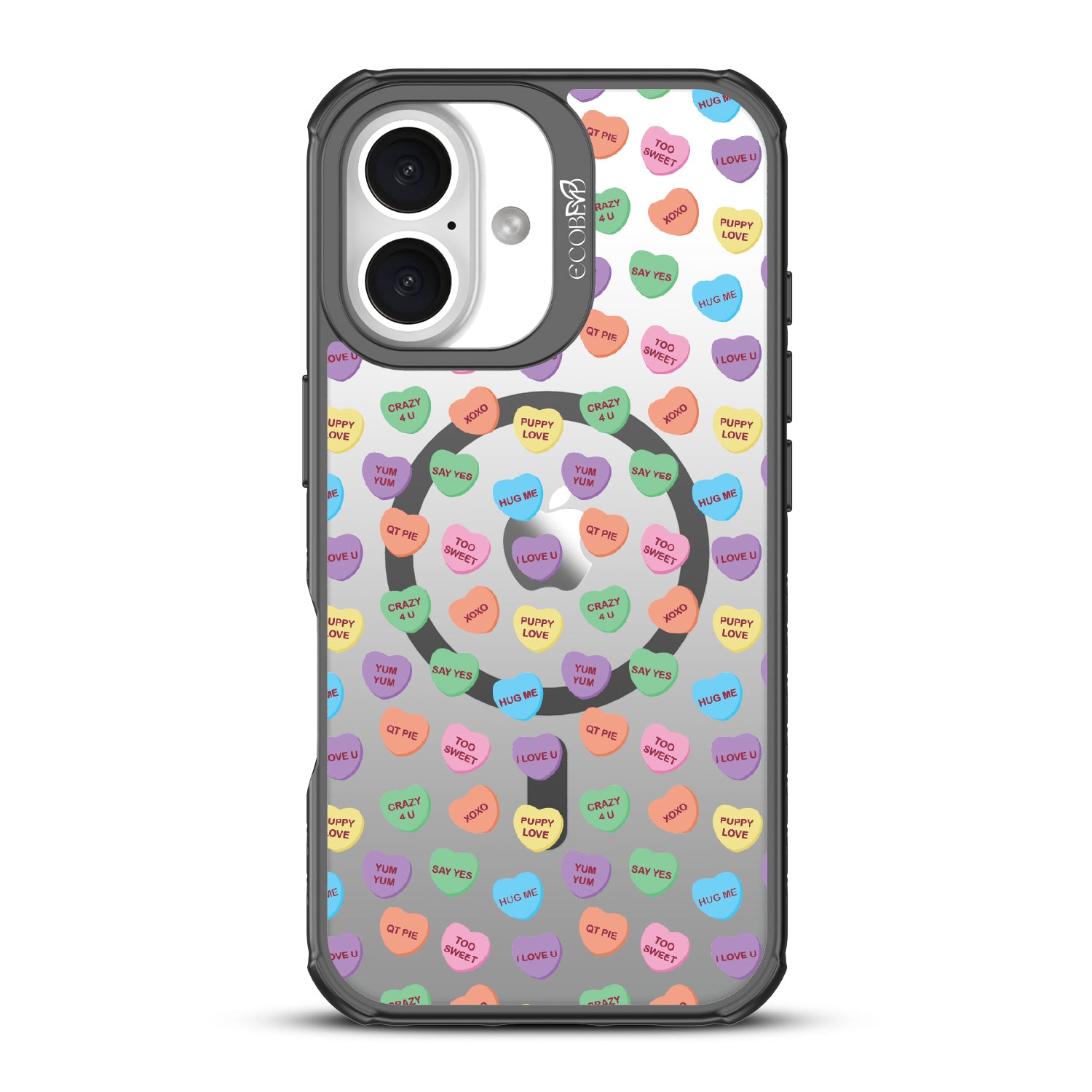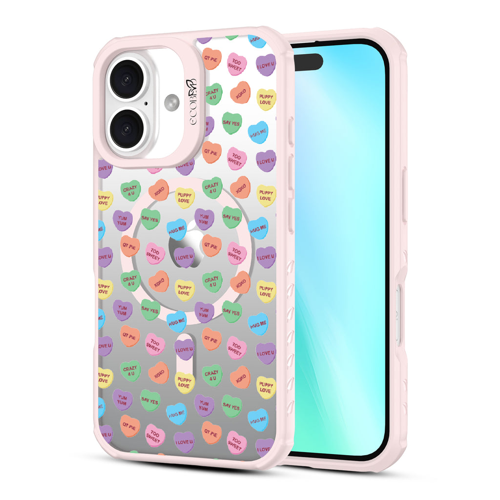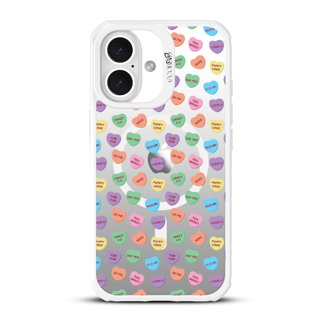 You'll be a real 'QT Pie' with the Sweethearts design on our Revive clear iPhone 16 phone case's playful candy conversation hearts on your phone that show you're "too sweet".