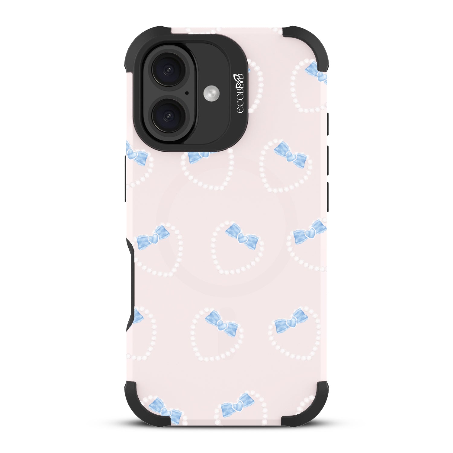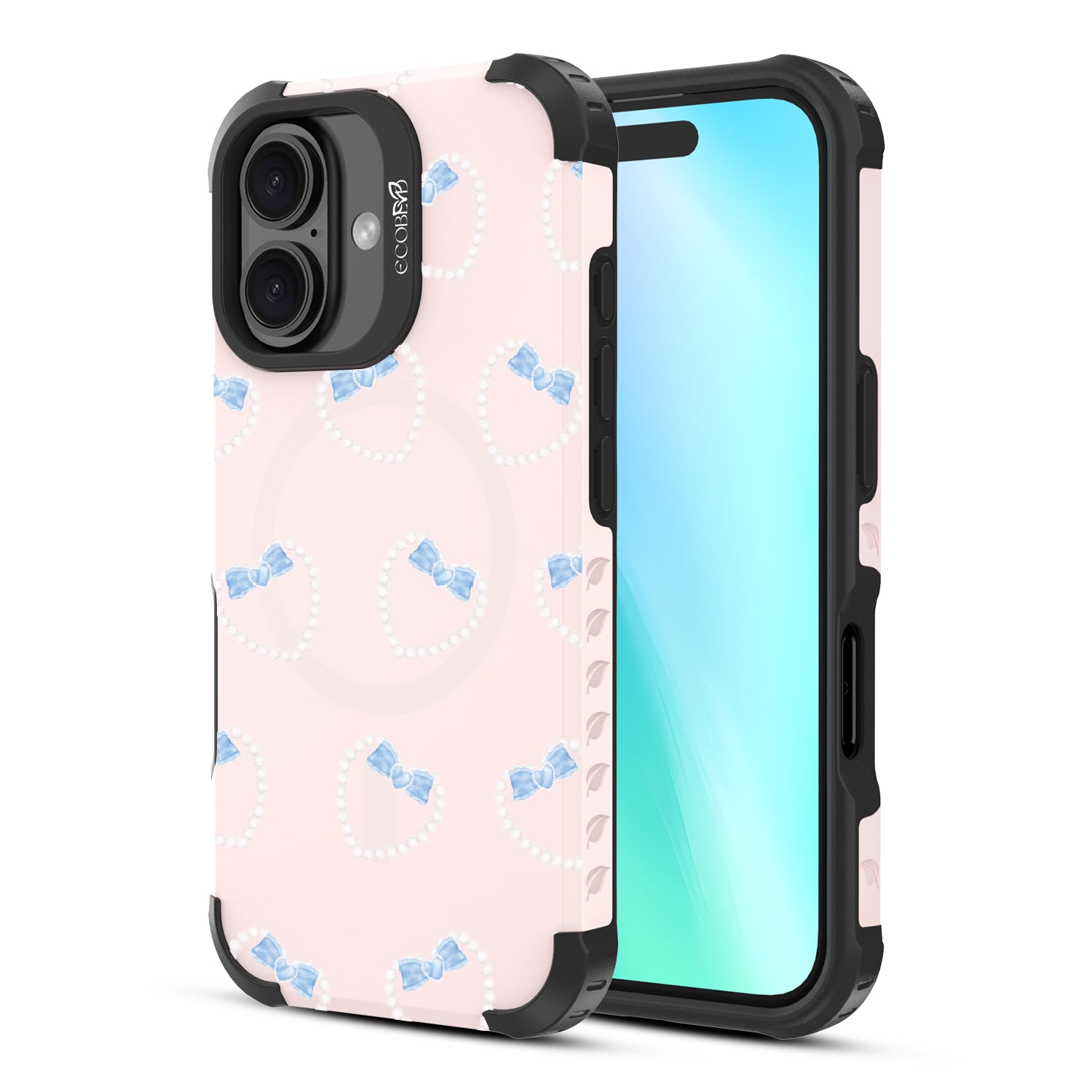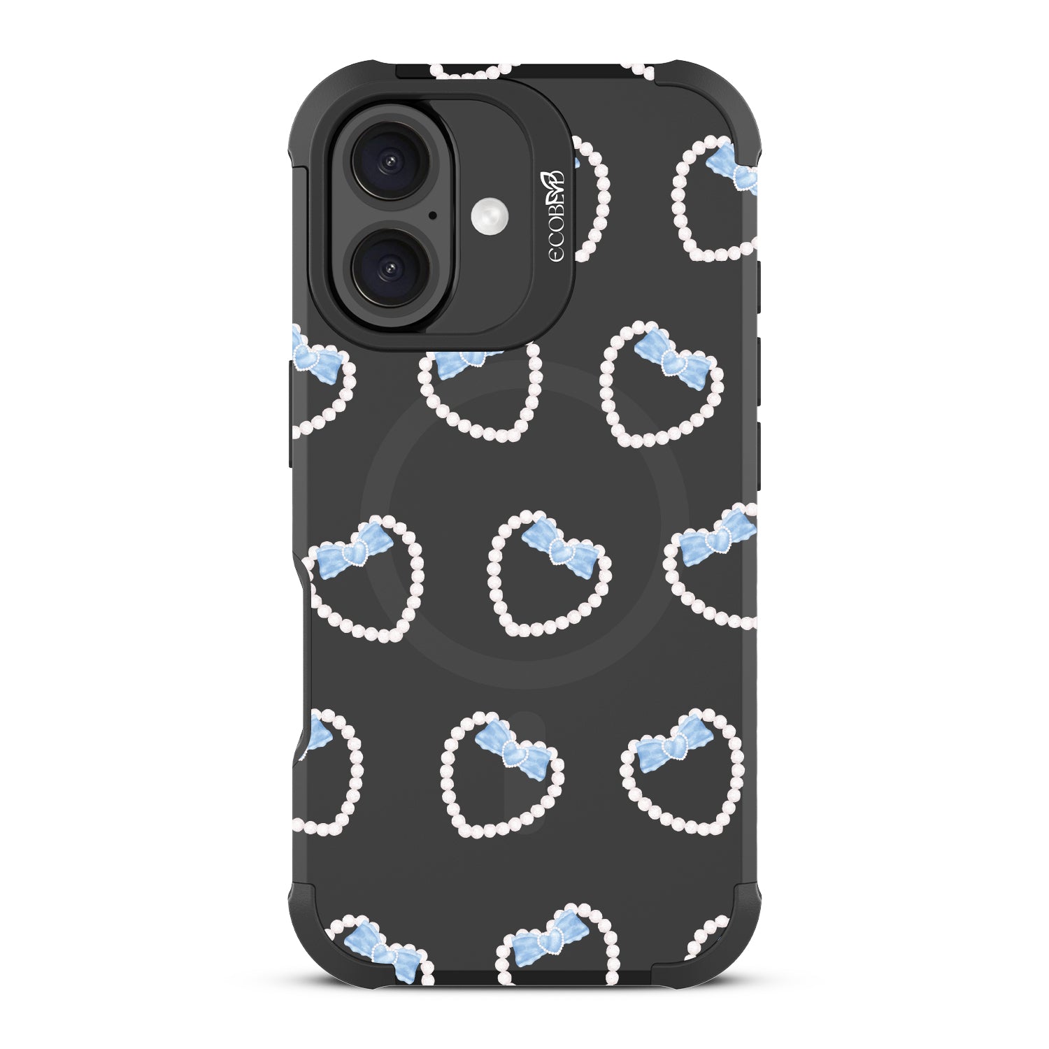 Pure bliss is found in the details, so find yours in the Pearl Bliss design on our Reforge rugged iPhone 16 phone case. Luminous pearls and delicate blue bows weave together in intricate heart shapes, crafting an irresistibly dreamy look that captivates. Every detail is meticulously crafted to make those around you want more and more.