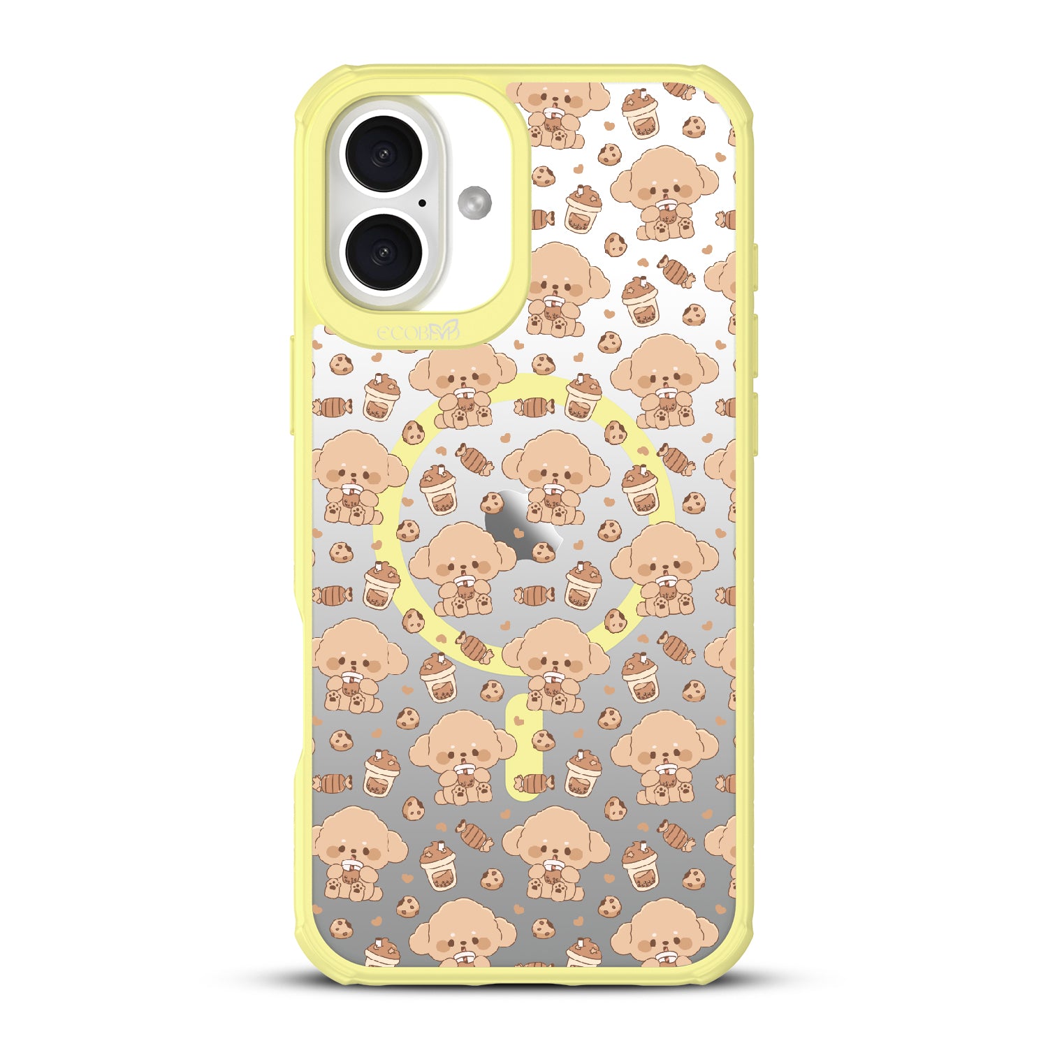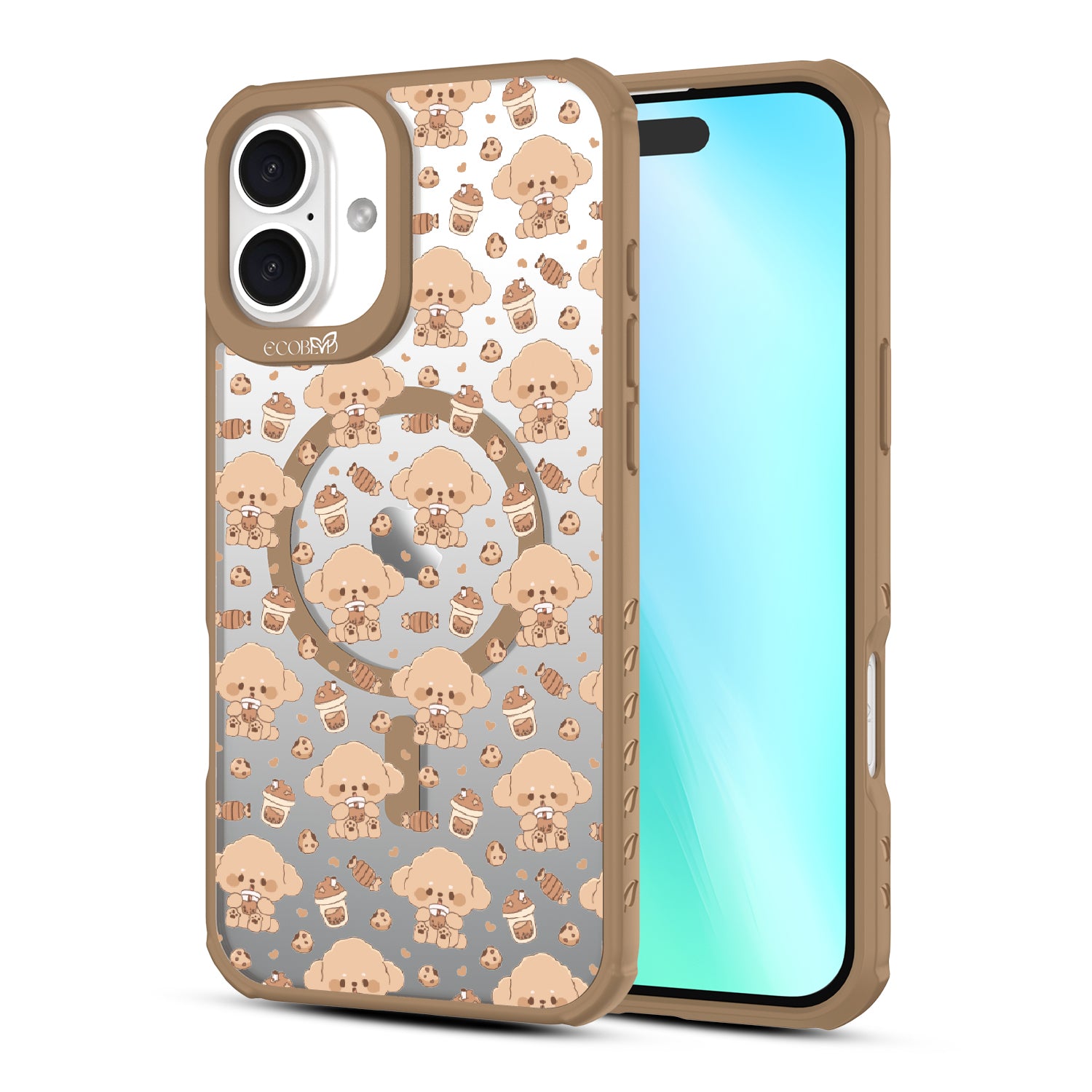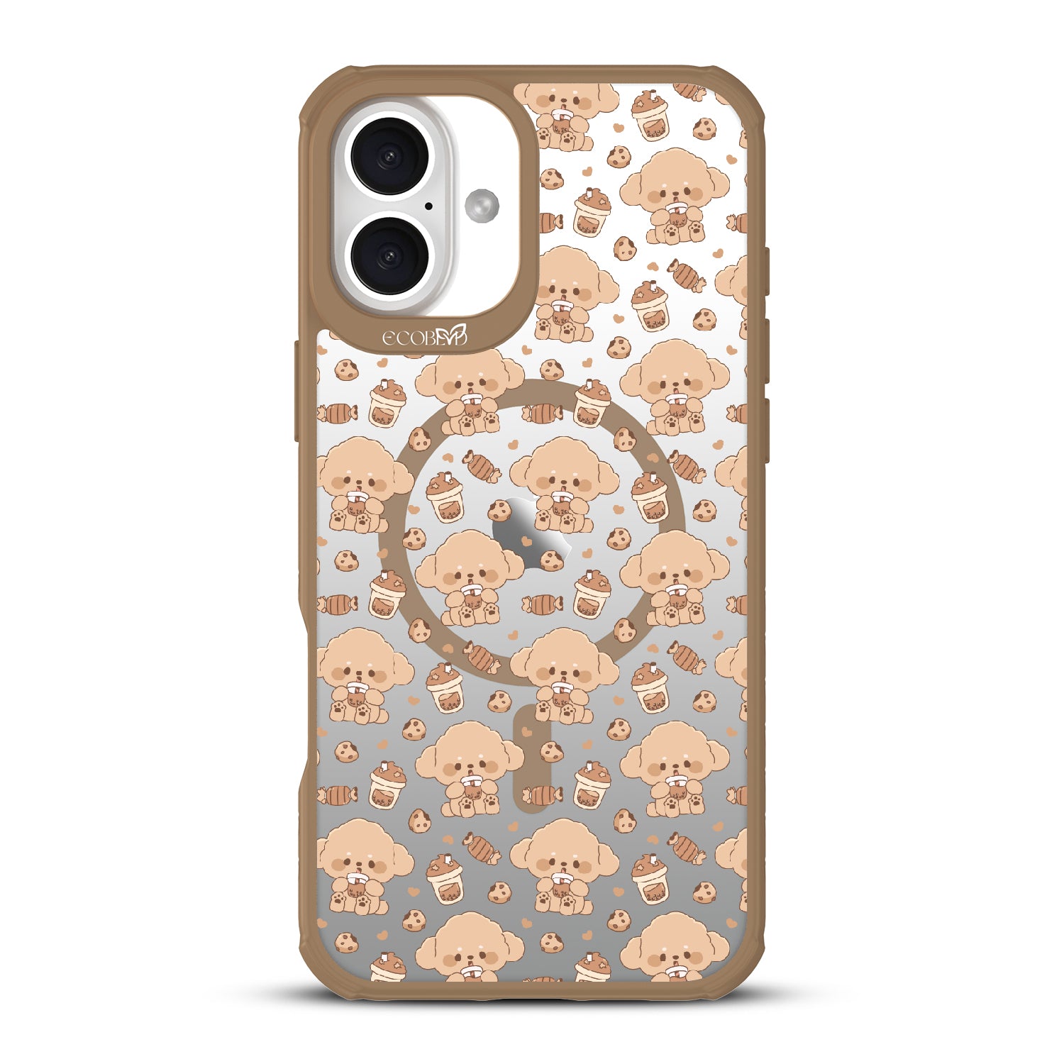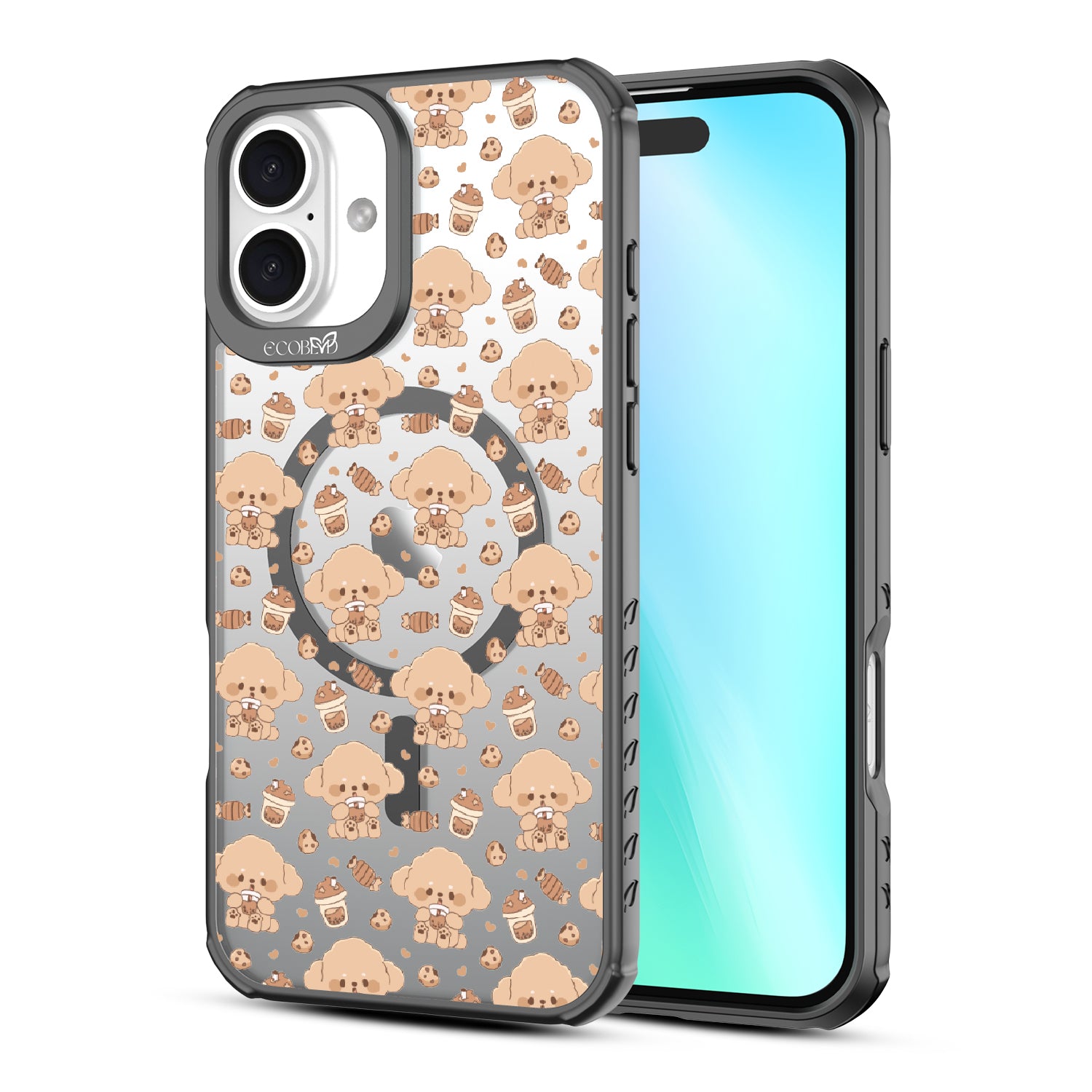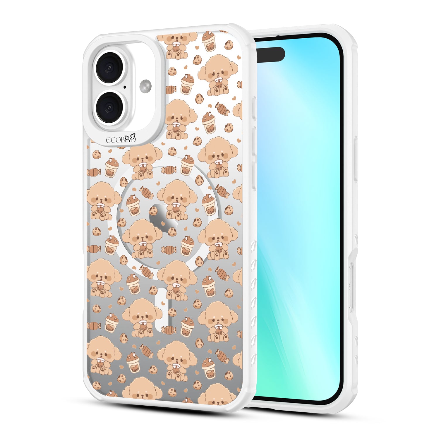 A pup cup for them, a coffee for you. The Pupaccino design on our Revive clear iPhone 16 Plus case captures the joy of coffee runs with your furry best friend, blending happy pups, frothy drinks, and pastries into one delightful look. Perfect for dog lovers who never skip a treat.