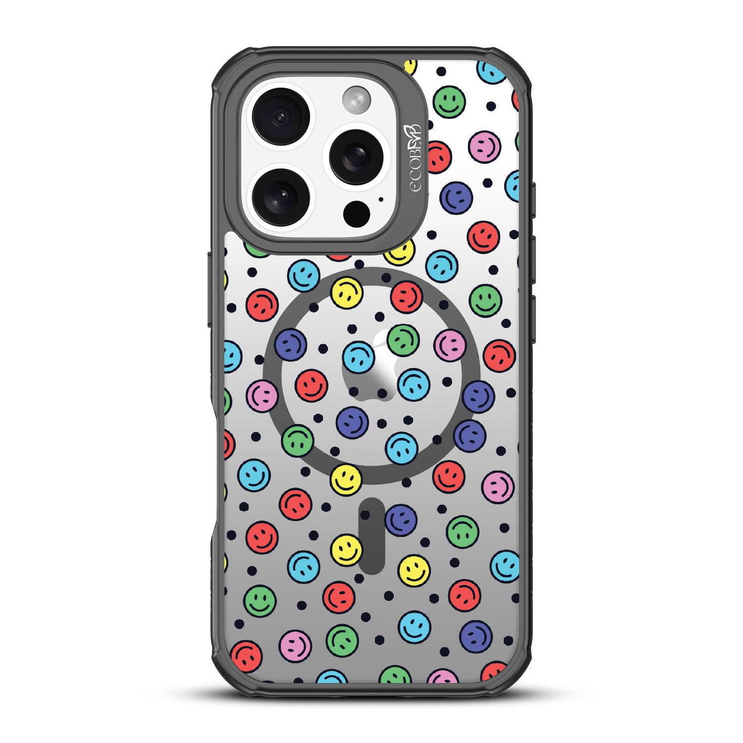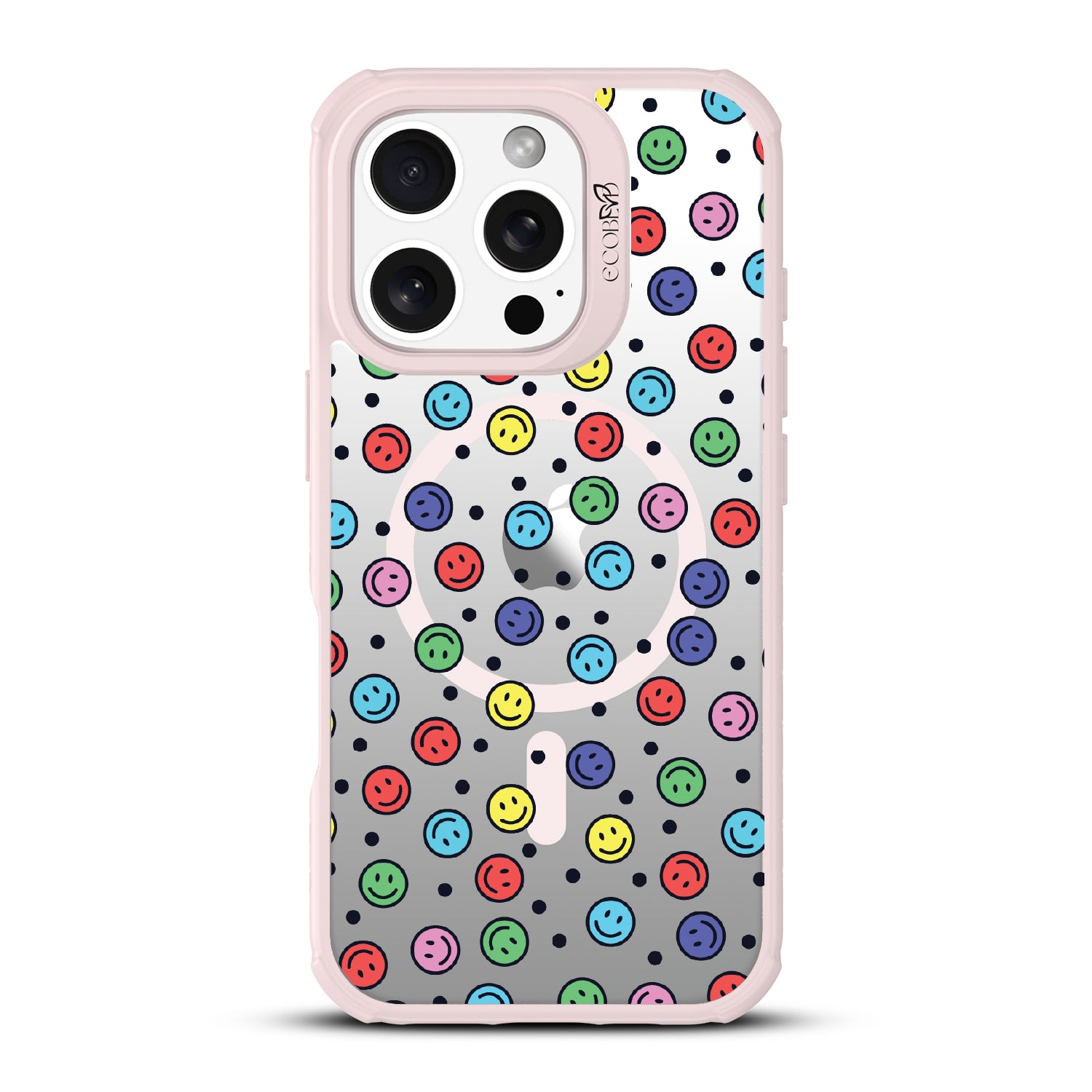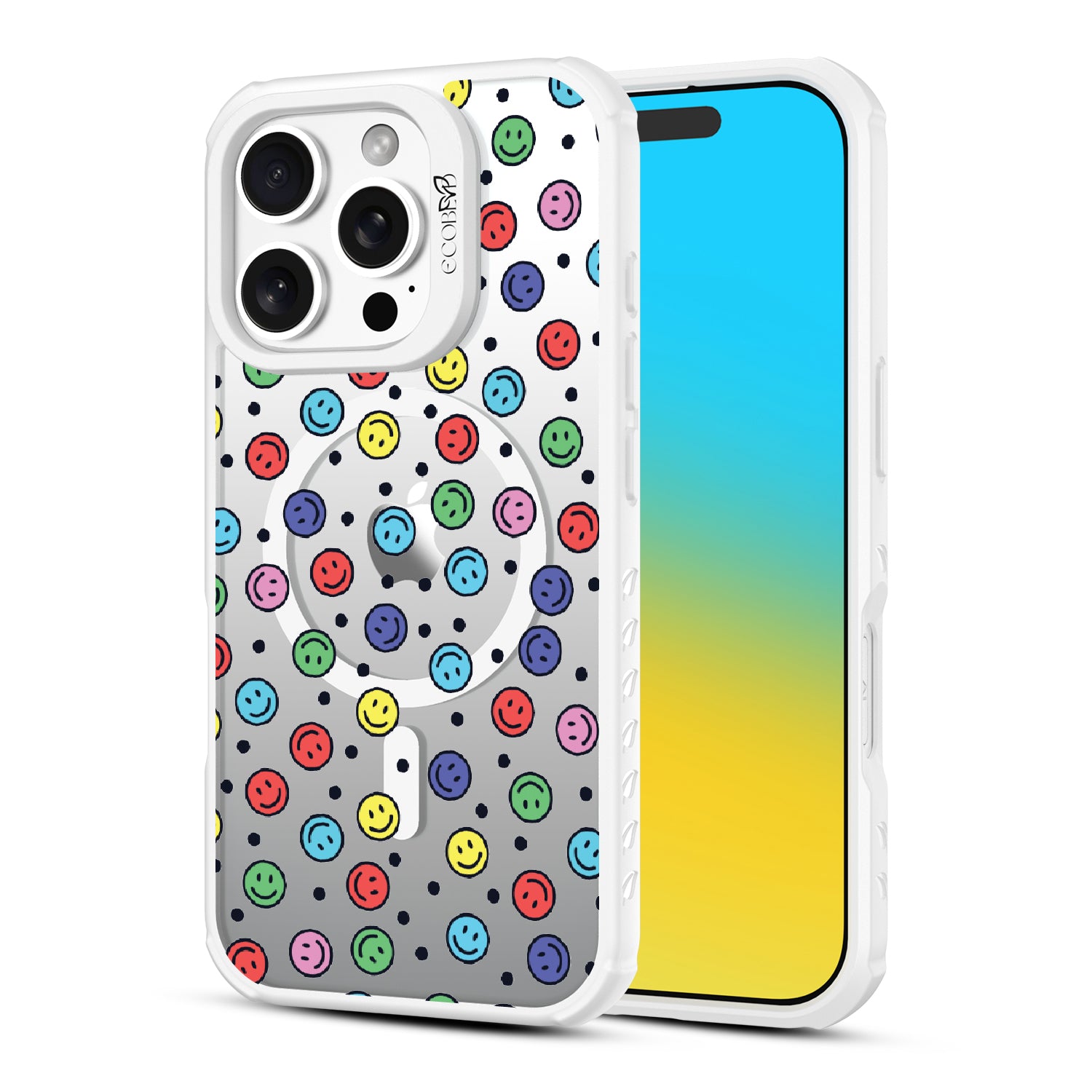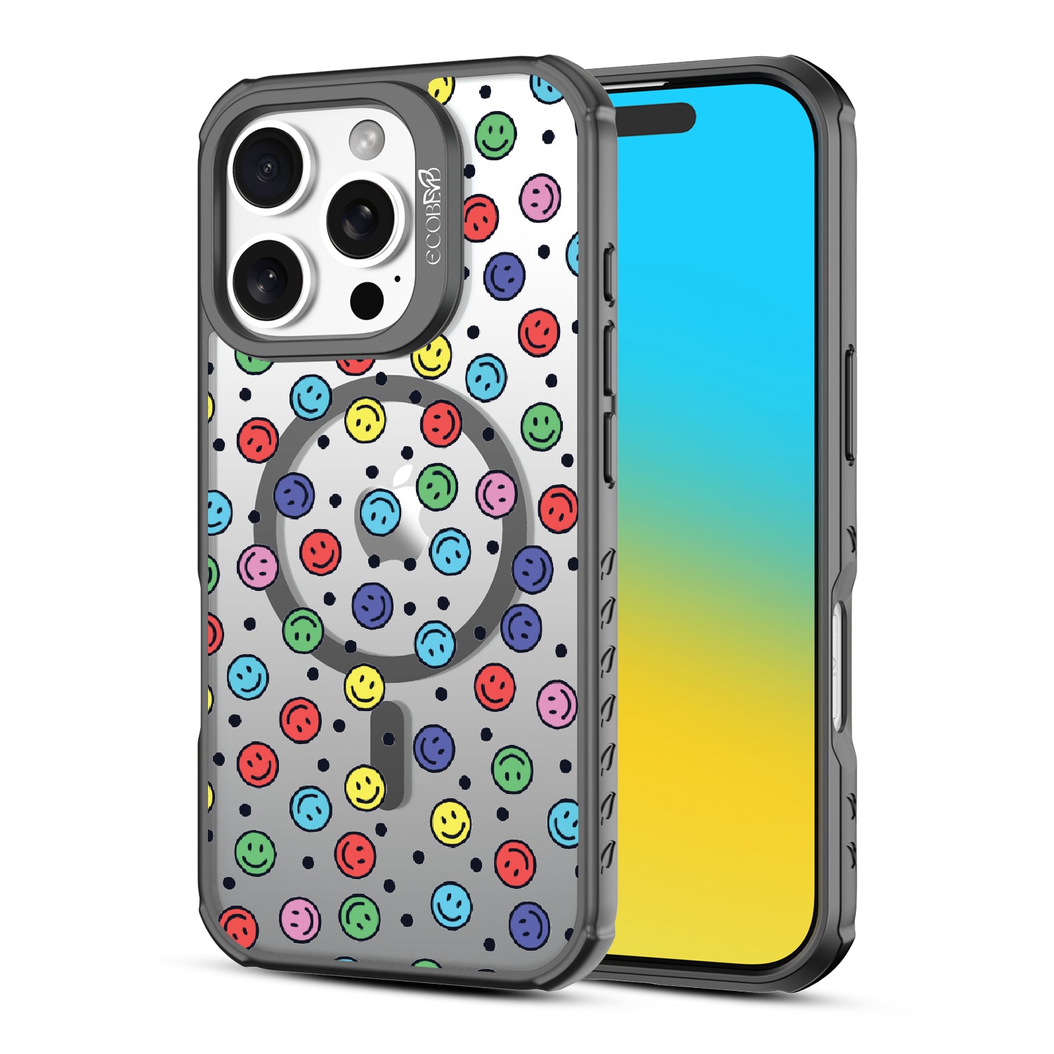 Let the All Smiles design on our Revive clear iPhone 16 ProĀ phone case set your mood for the day as its multi-colored smiley faces surround your phone in happiness.