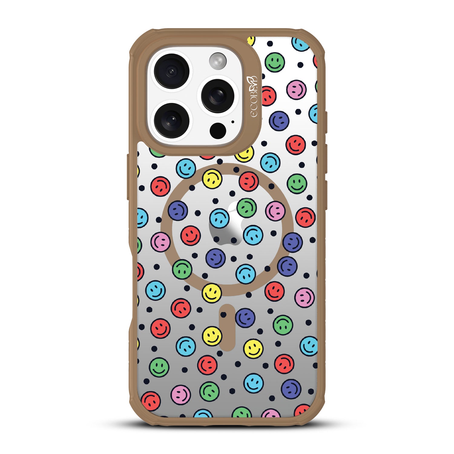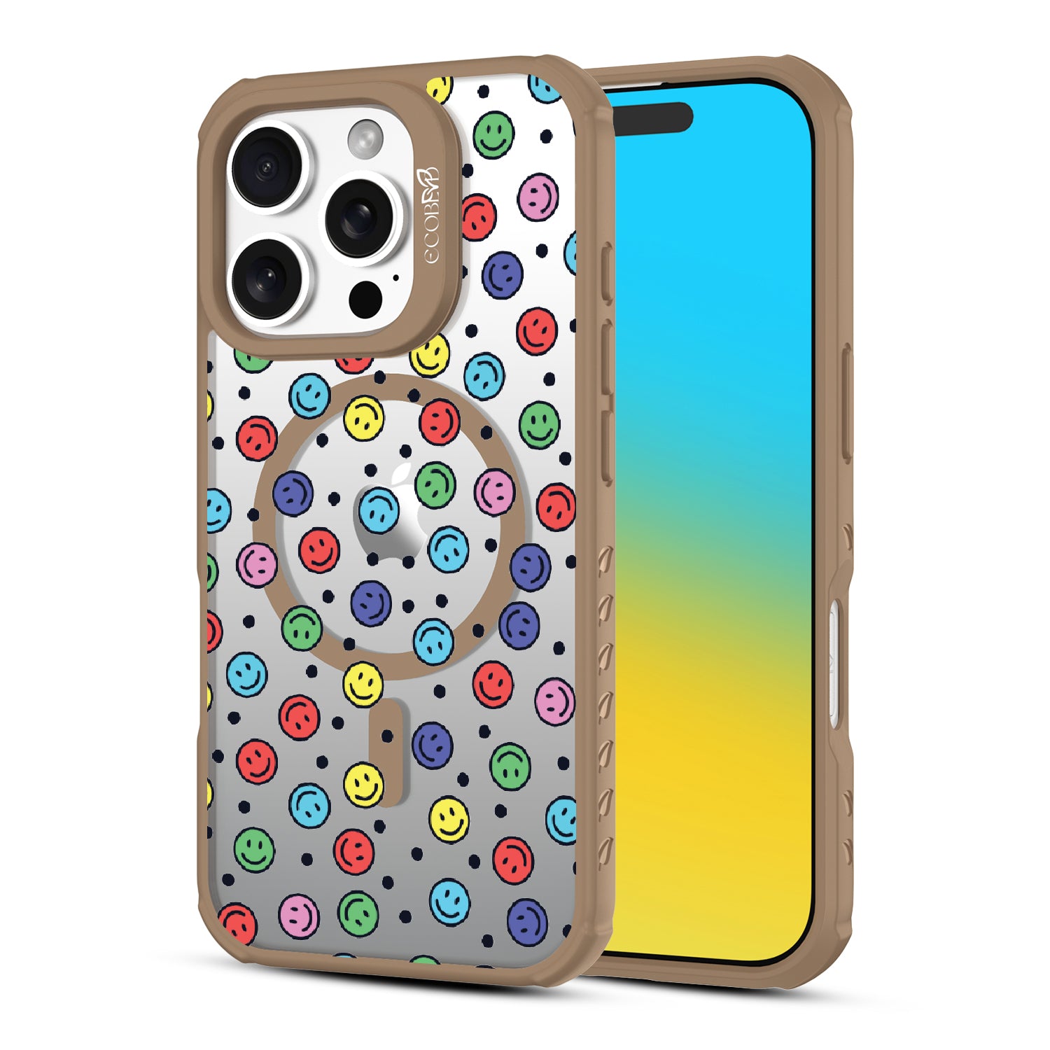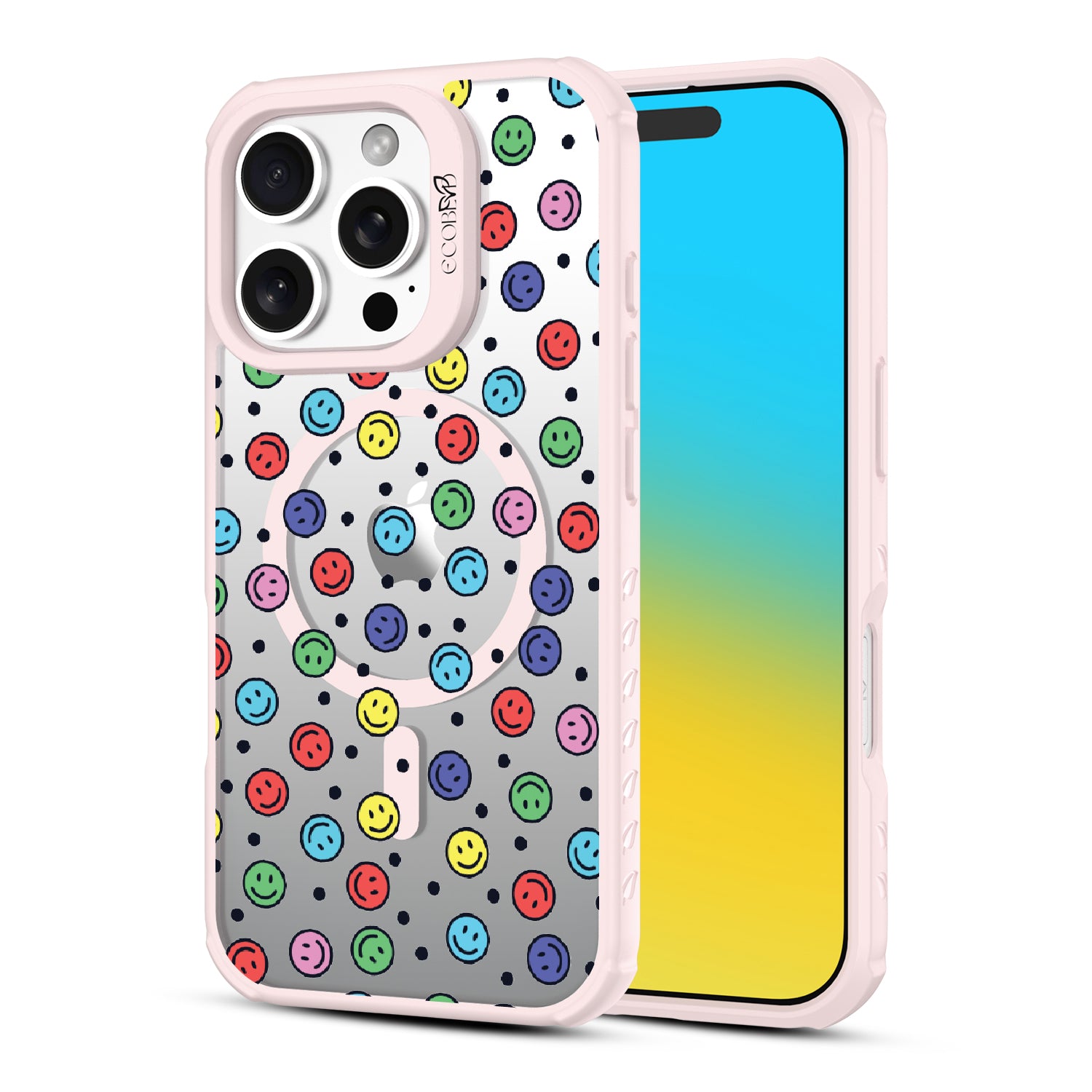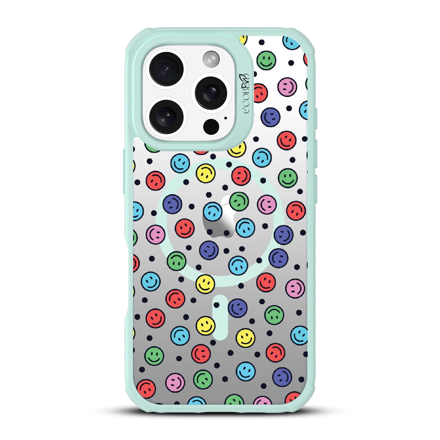 Let the All Smiles design on our Revive clear iPhone 16 ProĀ phone case set your mood for the day as its multi-colored smiley faces surround your phone in happiness.