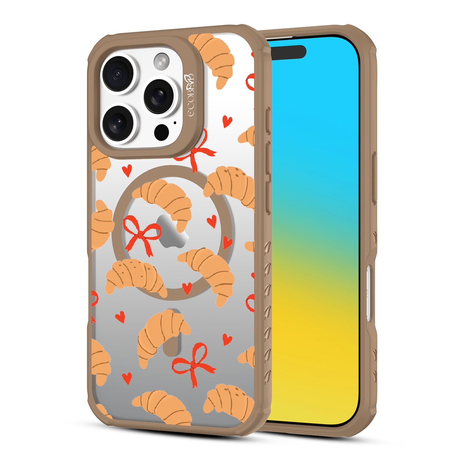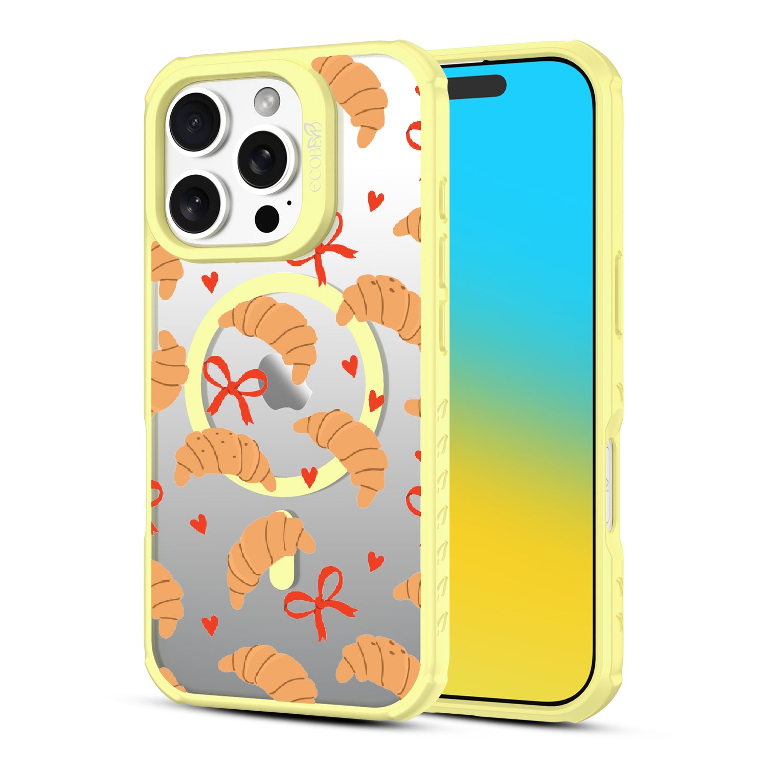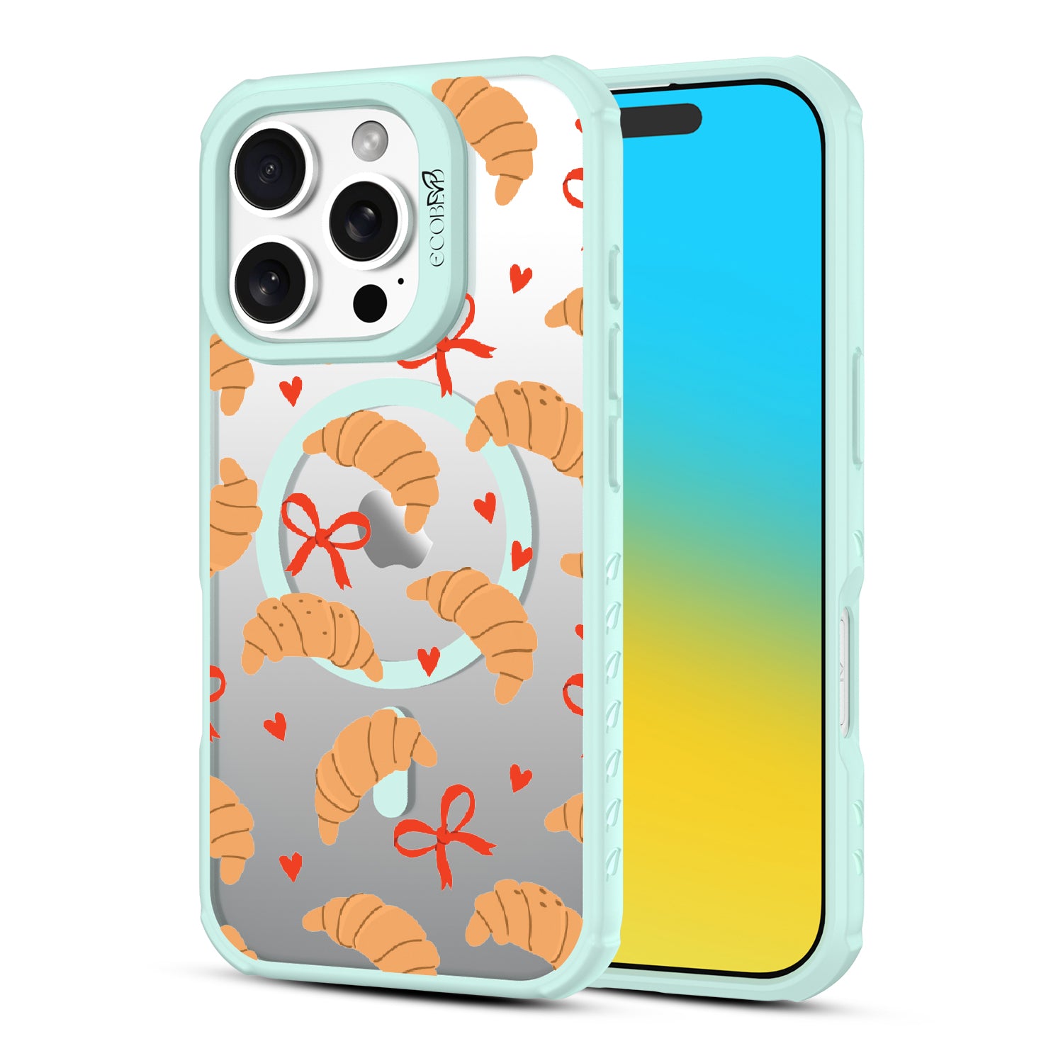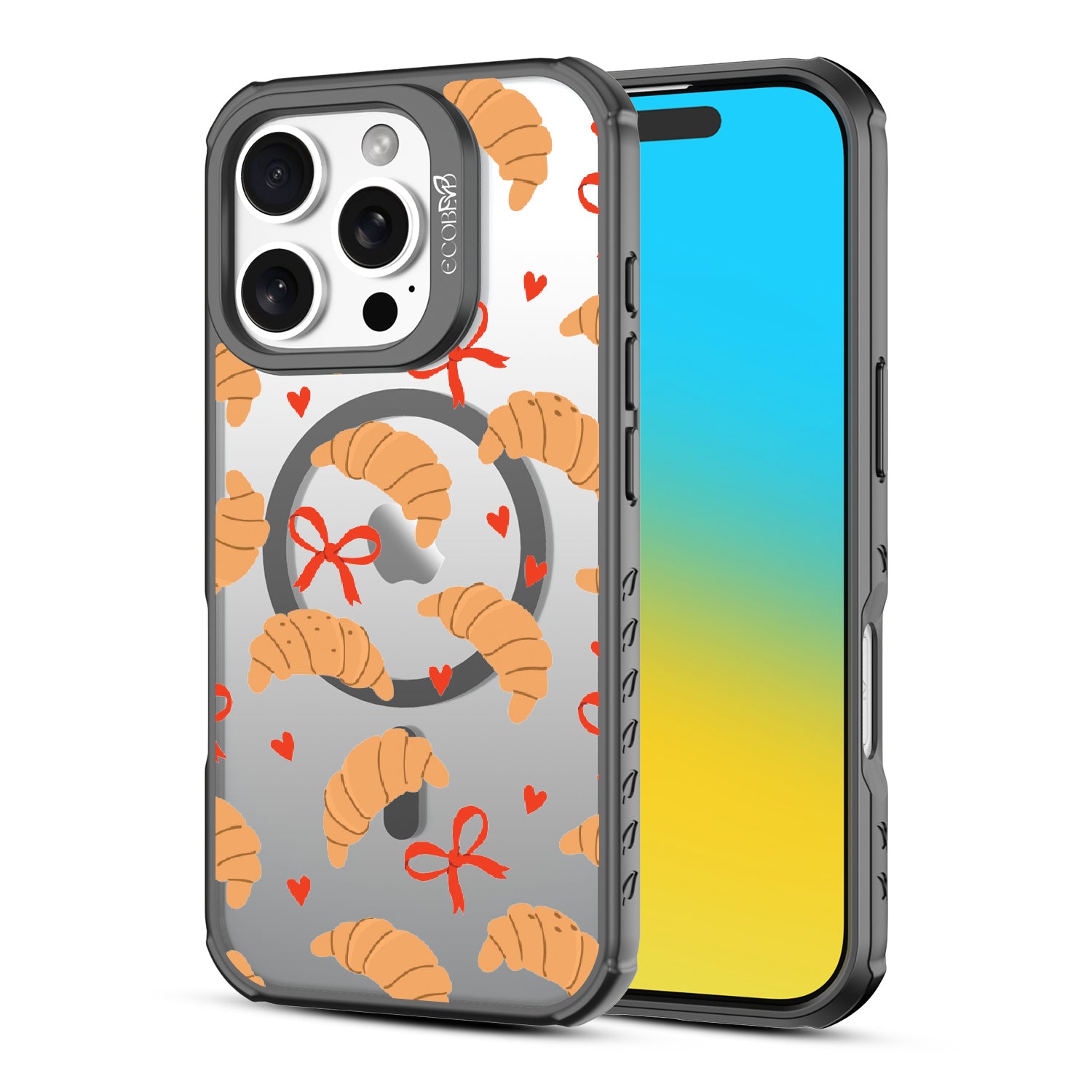 Good taste deserves the perfect recipe like the Croissant Couture design on our Revive clear iPhone 16 Pro case! Softly folded croissants, tied with dainty red bows and sprinkled with sweet hearts, evoke the lightness and care of a true delicacy.
