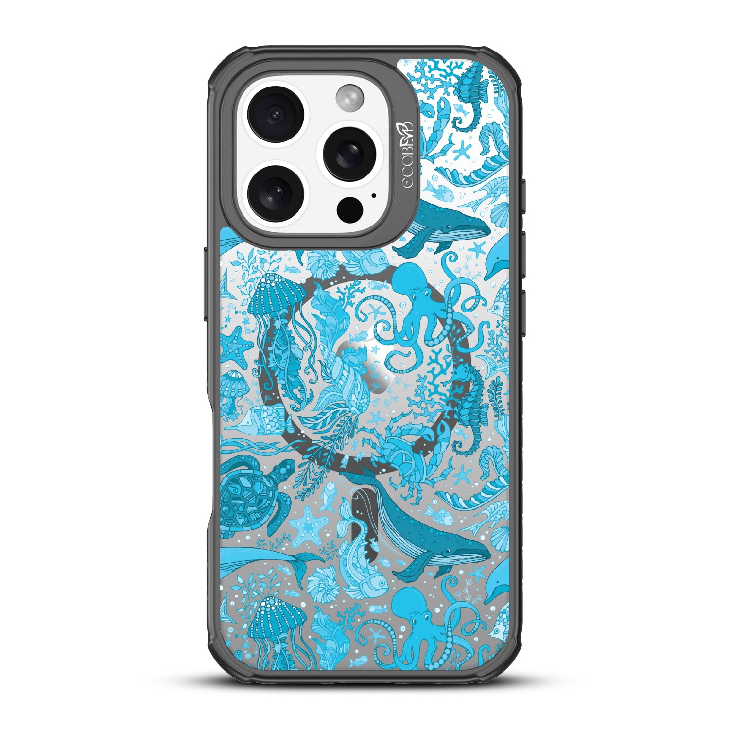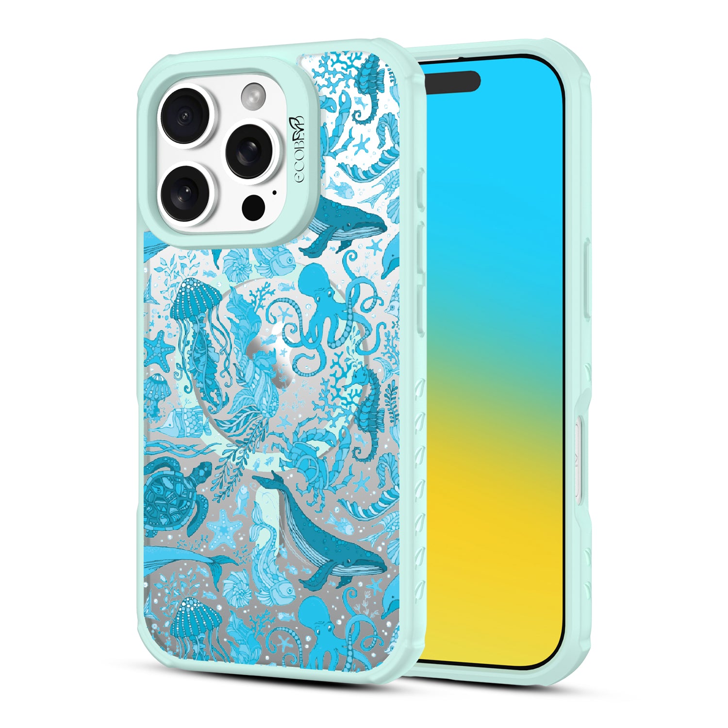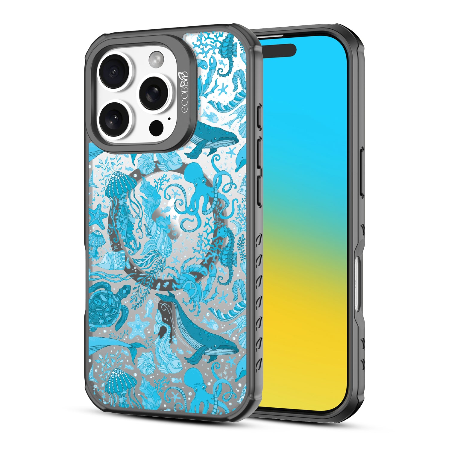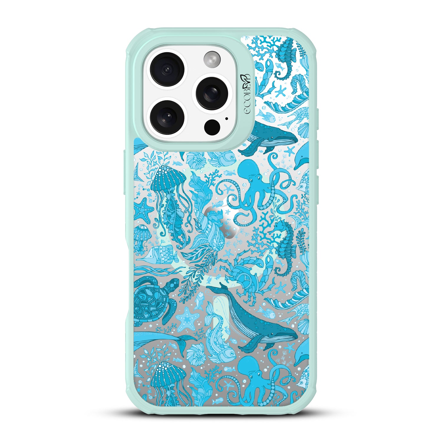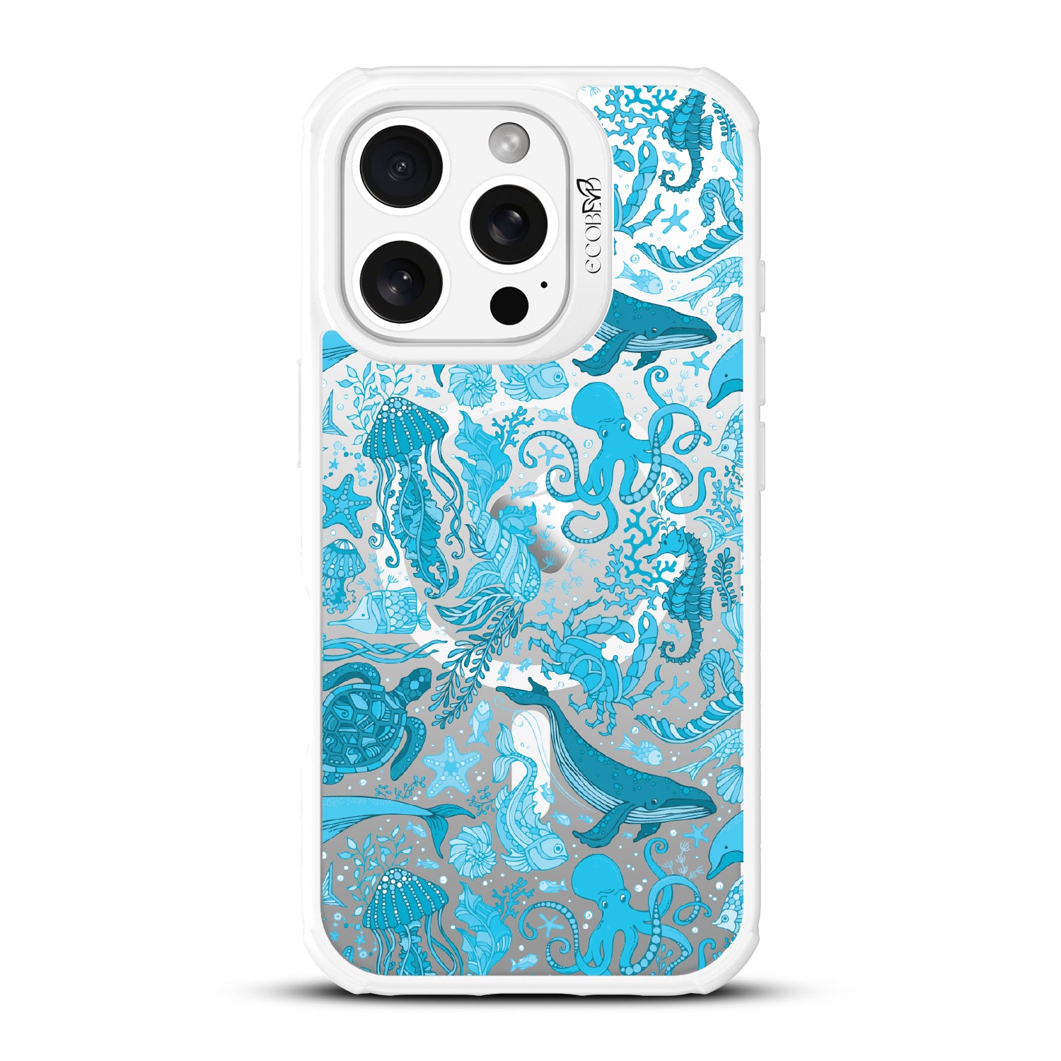 The ocean is a world of its own, and so is the Life Aquatic design on our Revive clear iPhone 16 Pro case. This design transforms your phone into a vibrant aquatic display, featuring whales, jellyfish, octopi, and colorful coral in a dynamic underwater scene. It’s like having a personal aquarium where the diversity of sea life comes alive.