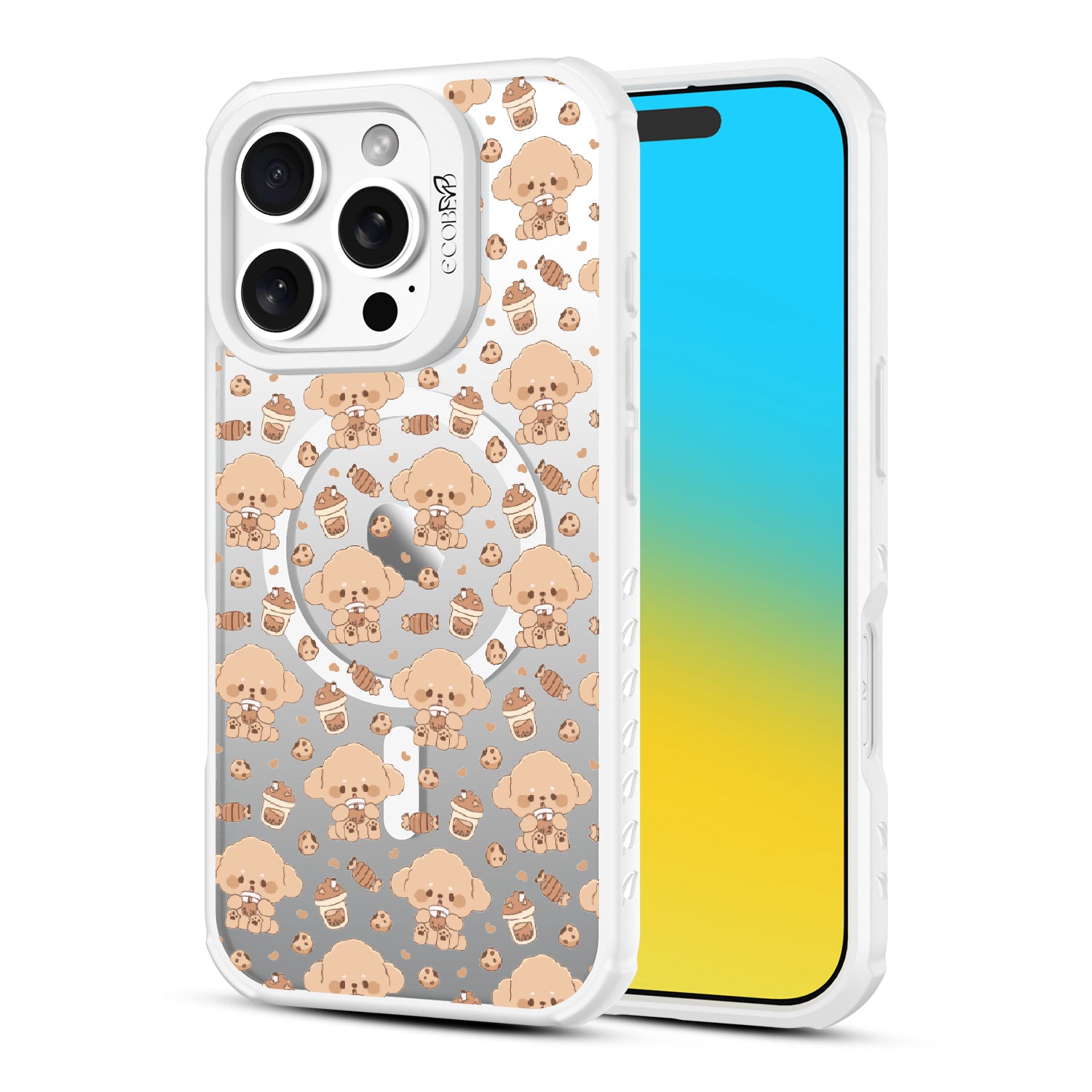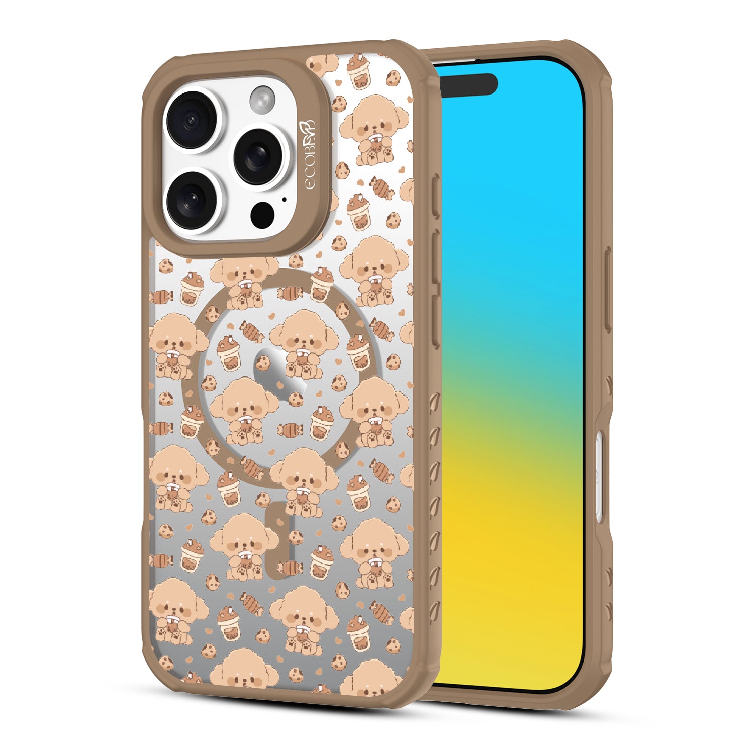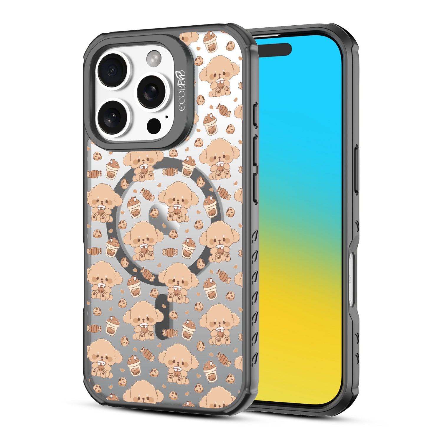 A pup cup for them, a coffee for you. The Pupaccino design on our Revive clear iPhone 16 Pro case captures the joy of coffee runs with your furry best friend, blending happy pups, frothy drinks, and pastries into one delightful look. Perfect for dog lovers who never skip a treat.