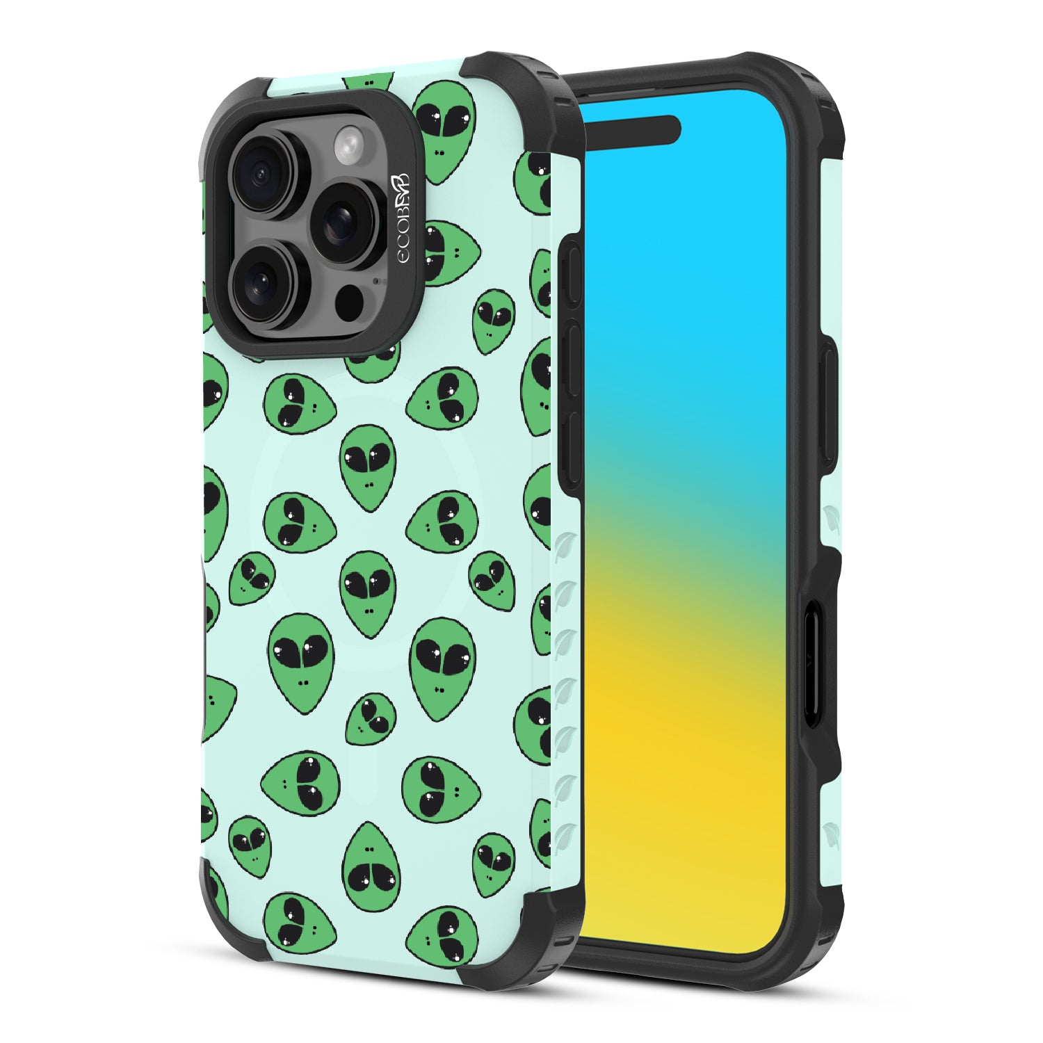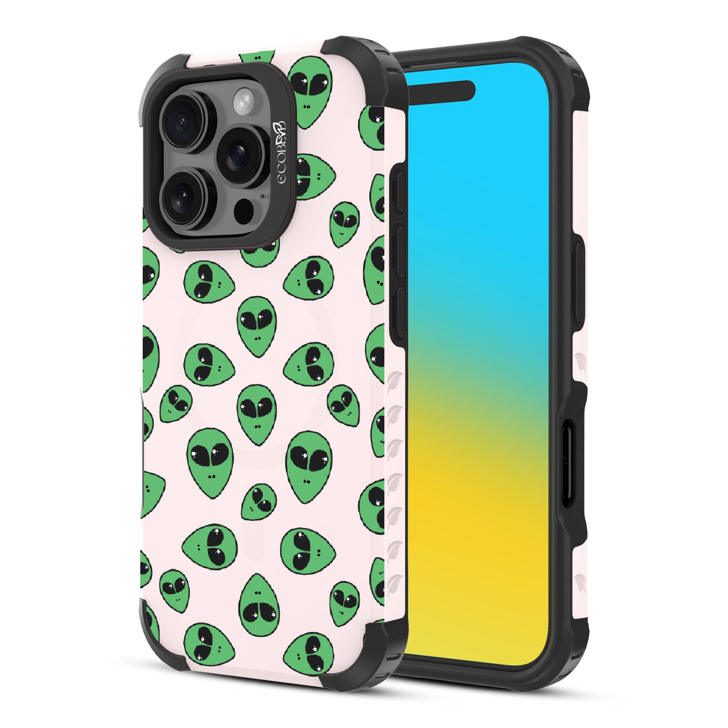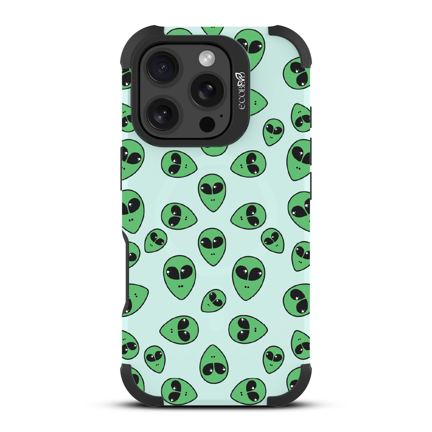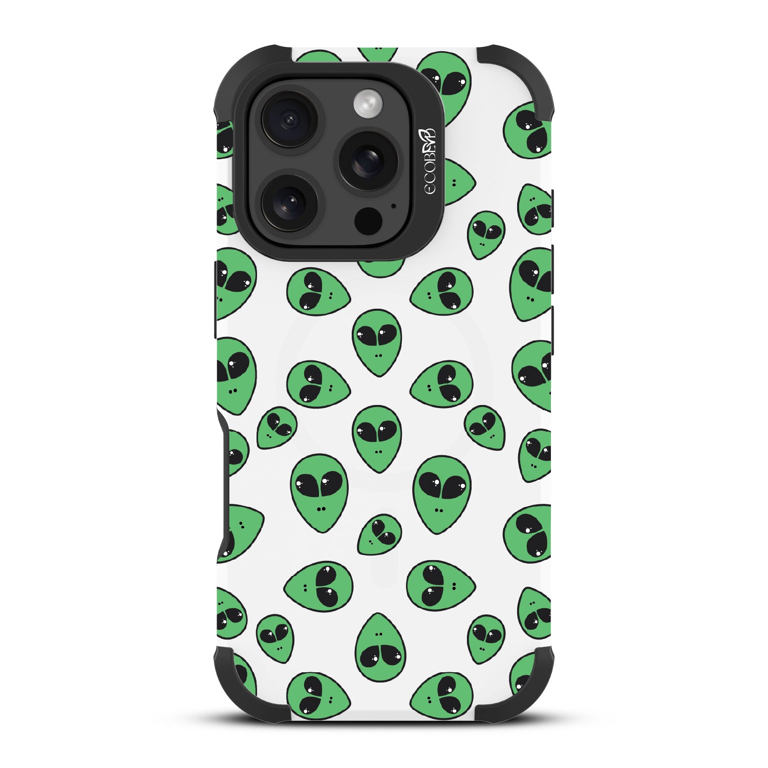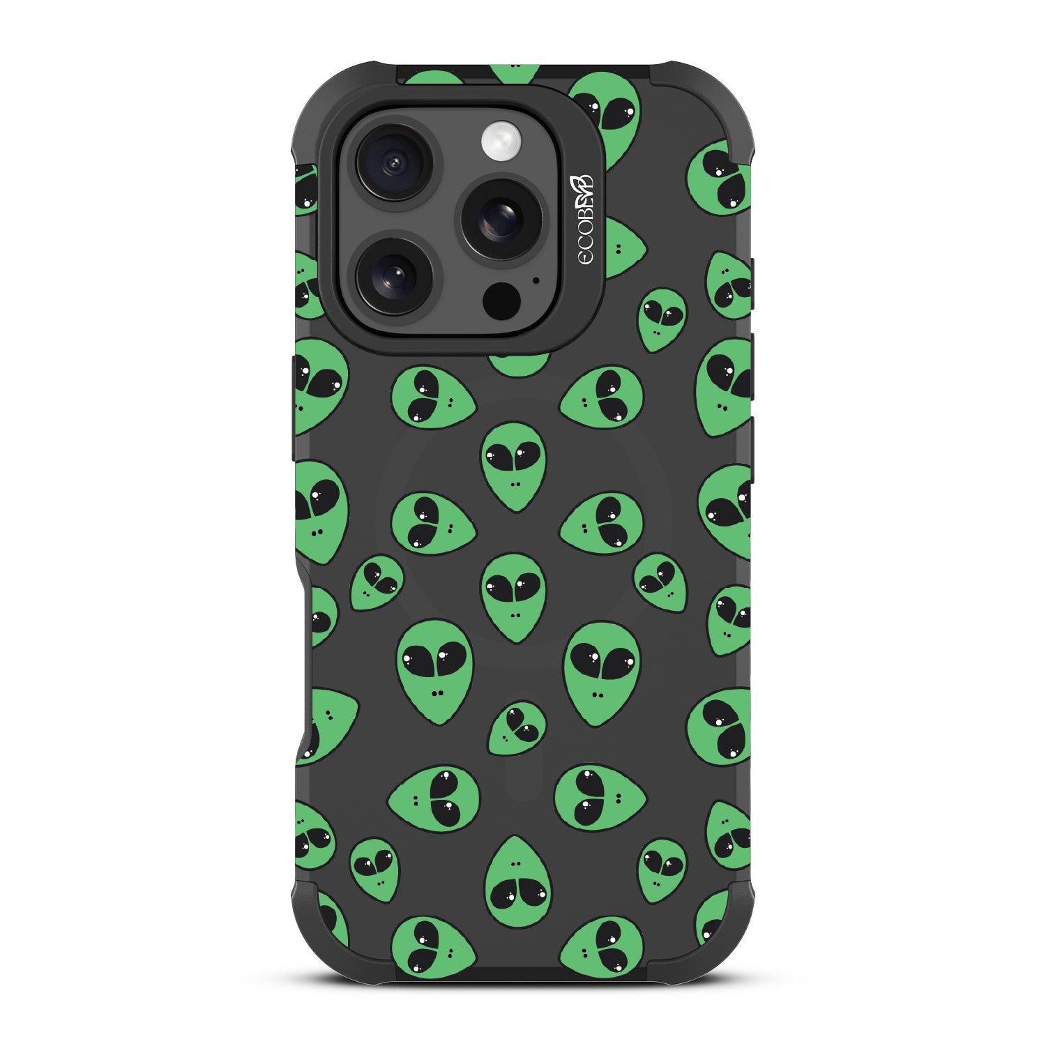 "We come in peace," the Aliens design on our Reforge rugged iPhone 16 Pro phone case announces as classic green extraterrestrial alien emojis decorate your phone's surface, offering an out-of-this-world look.