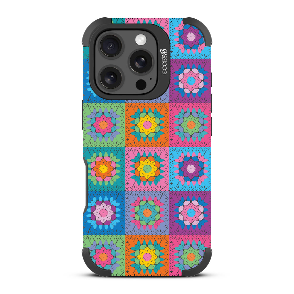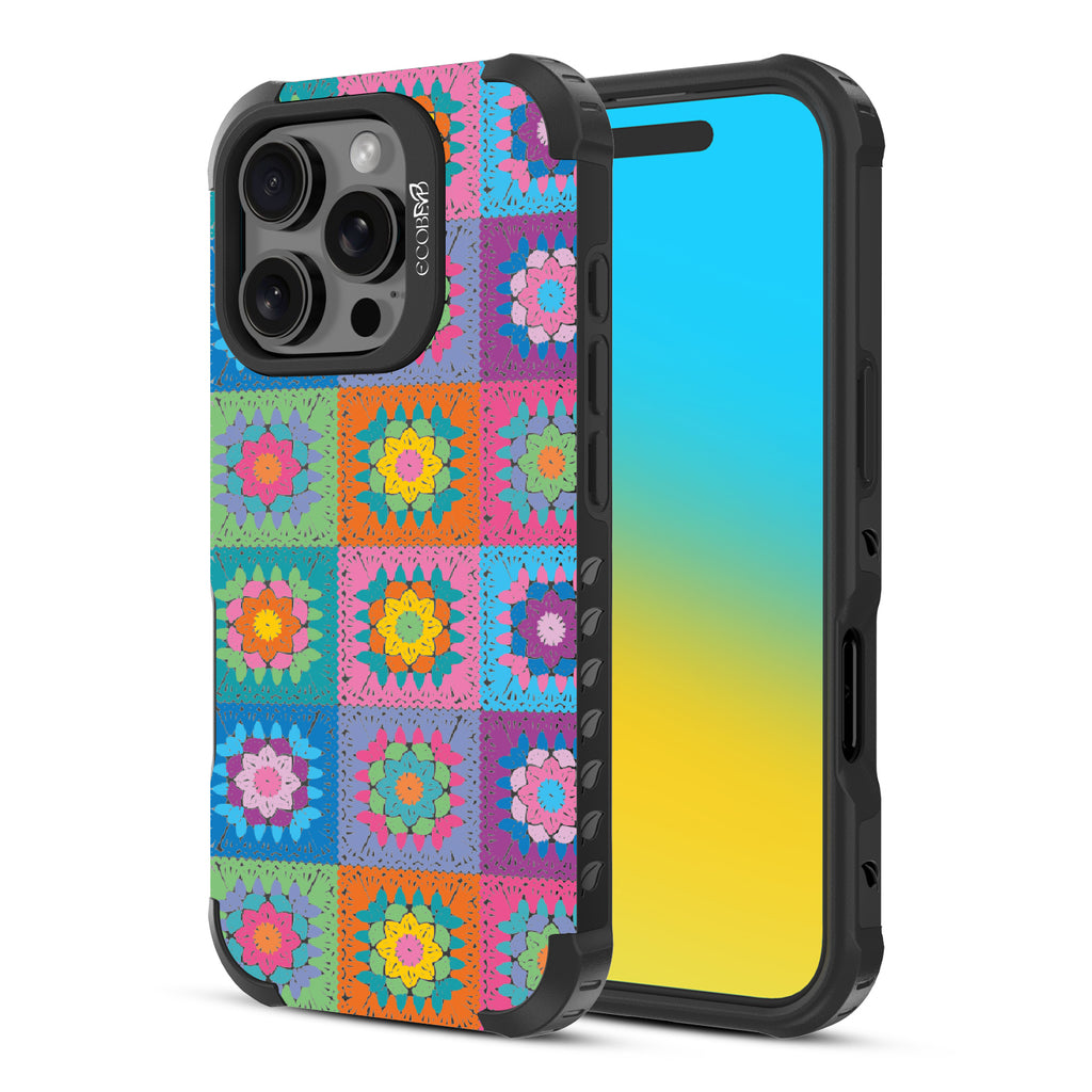 Let the All Squared Away design on our Reforge rugged iPhone 16 Pro phone case be your constant companion for Spring Break and music fests, giving you a warm and inviting look with its quilt-like design of vintage granny squares and intricate flowers.