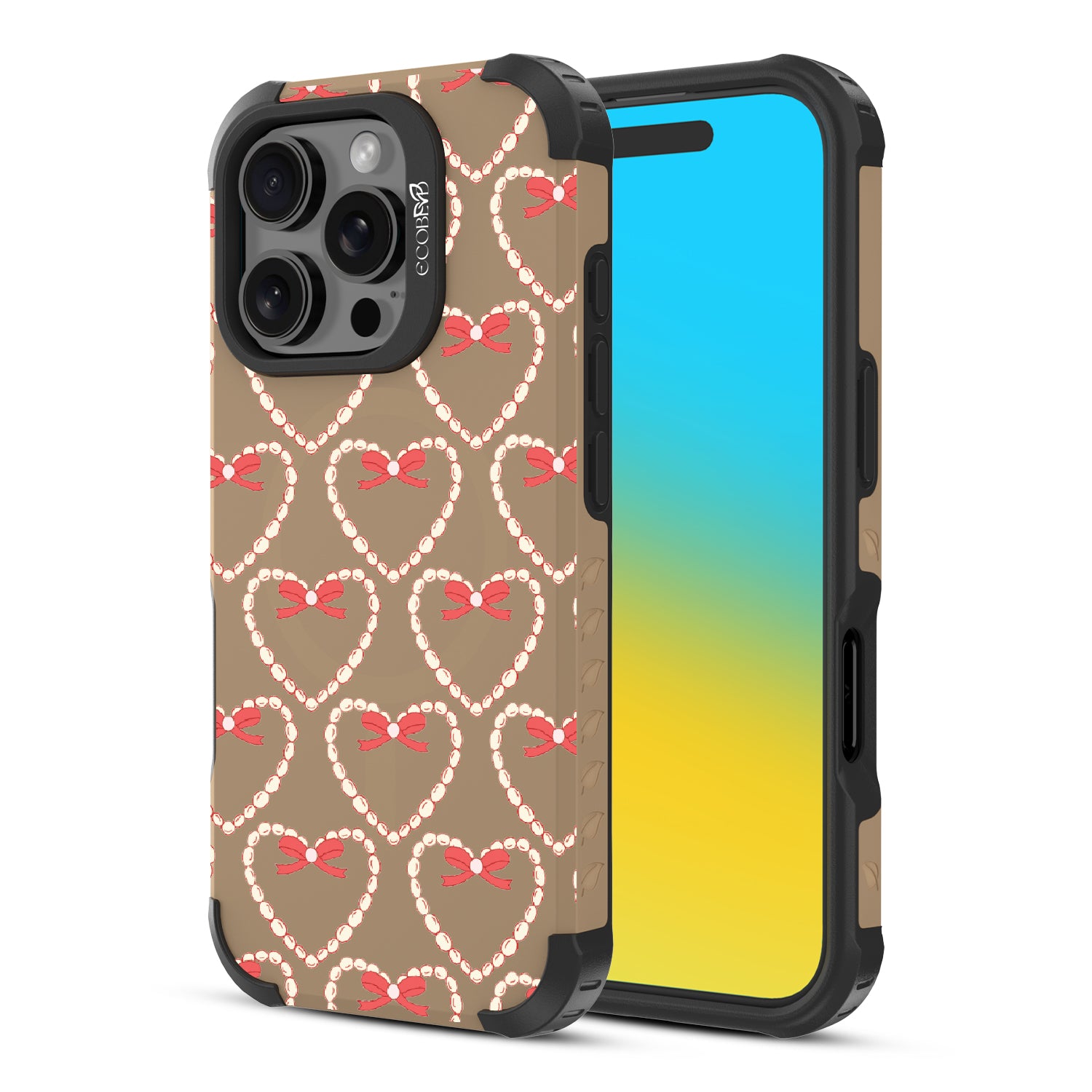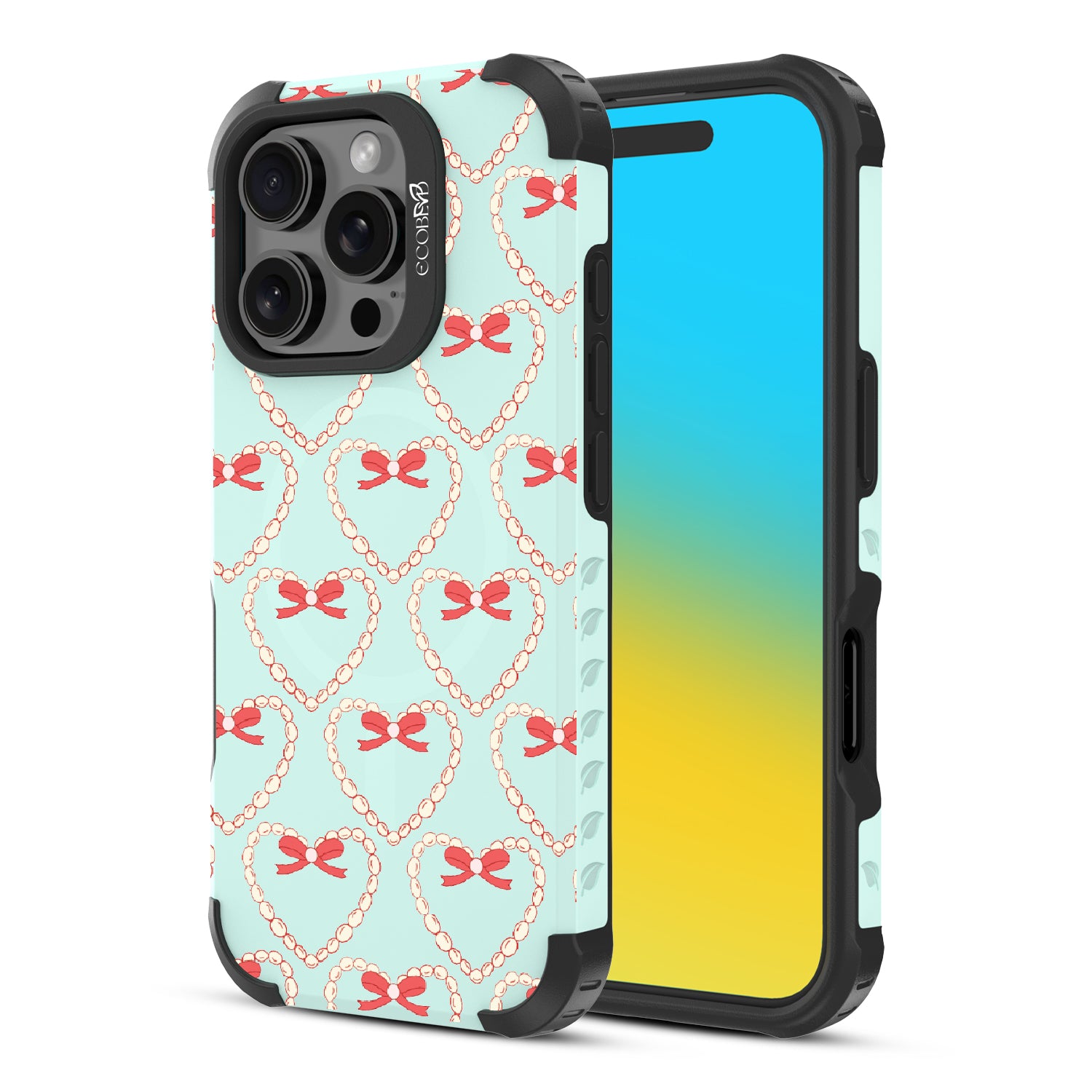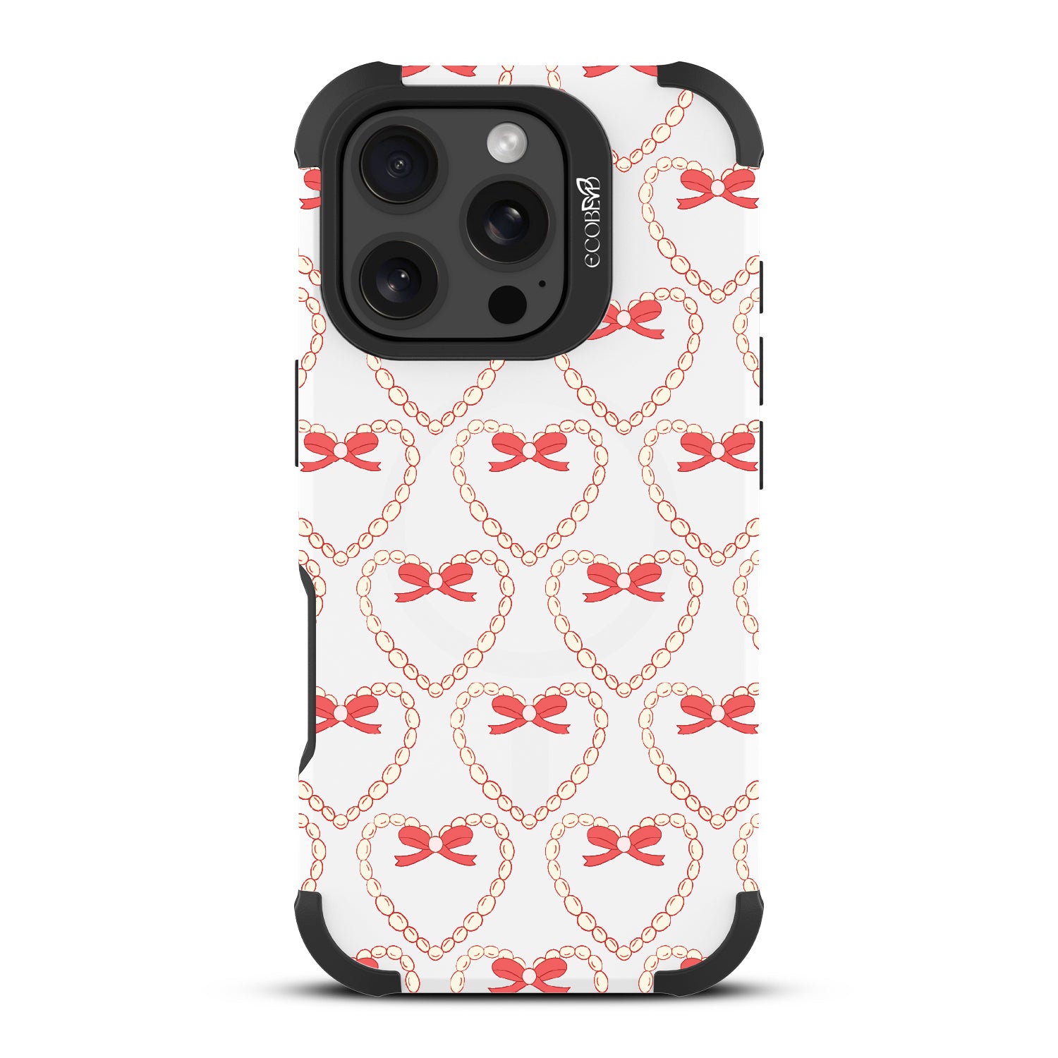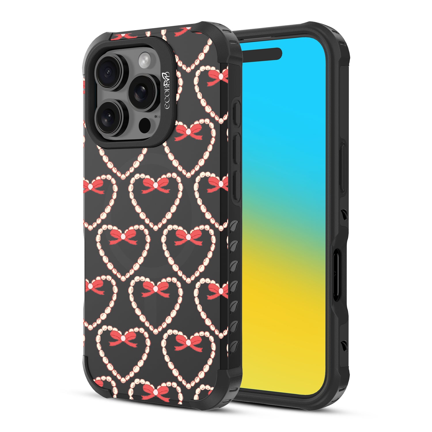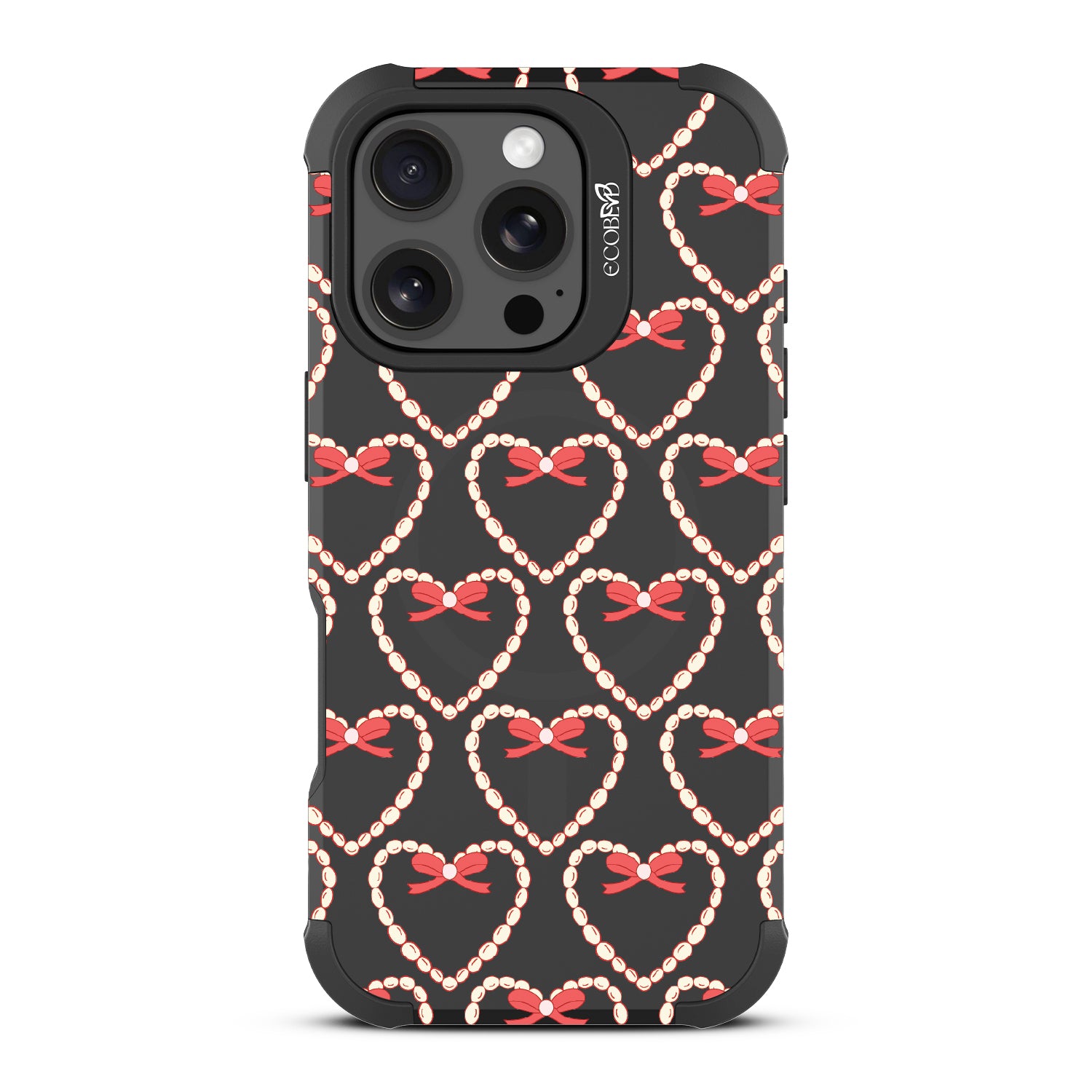 Tug at your Heart Strings with this beautifully crafted design on Reforge rugged iPhone 16 Pro phone case, featuring delicate pearls and coquettish bows arranged in heart shapes. Let your phone strum the chords of elegance with this captivating pattern. Each heart-shaped detail will make your style sing in love songs.
