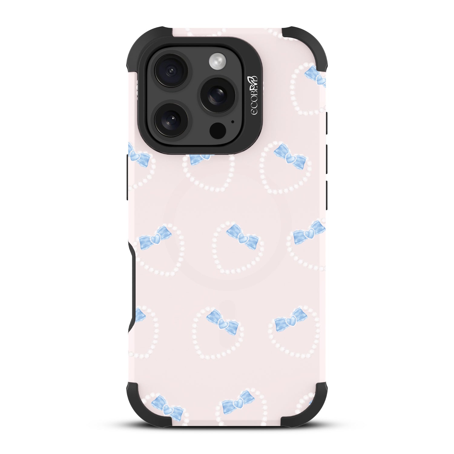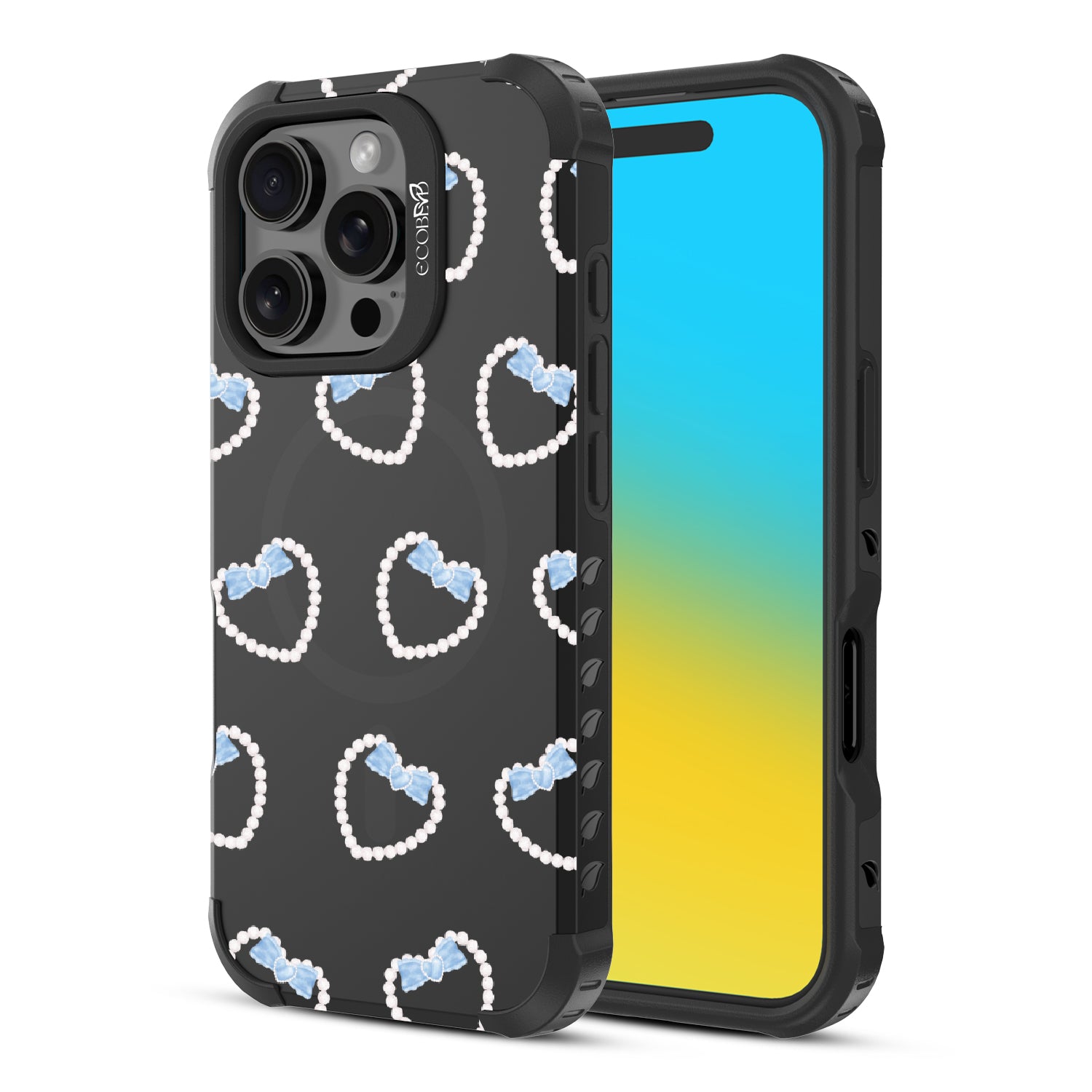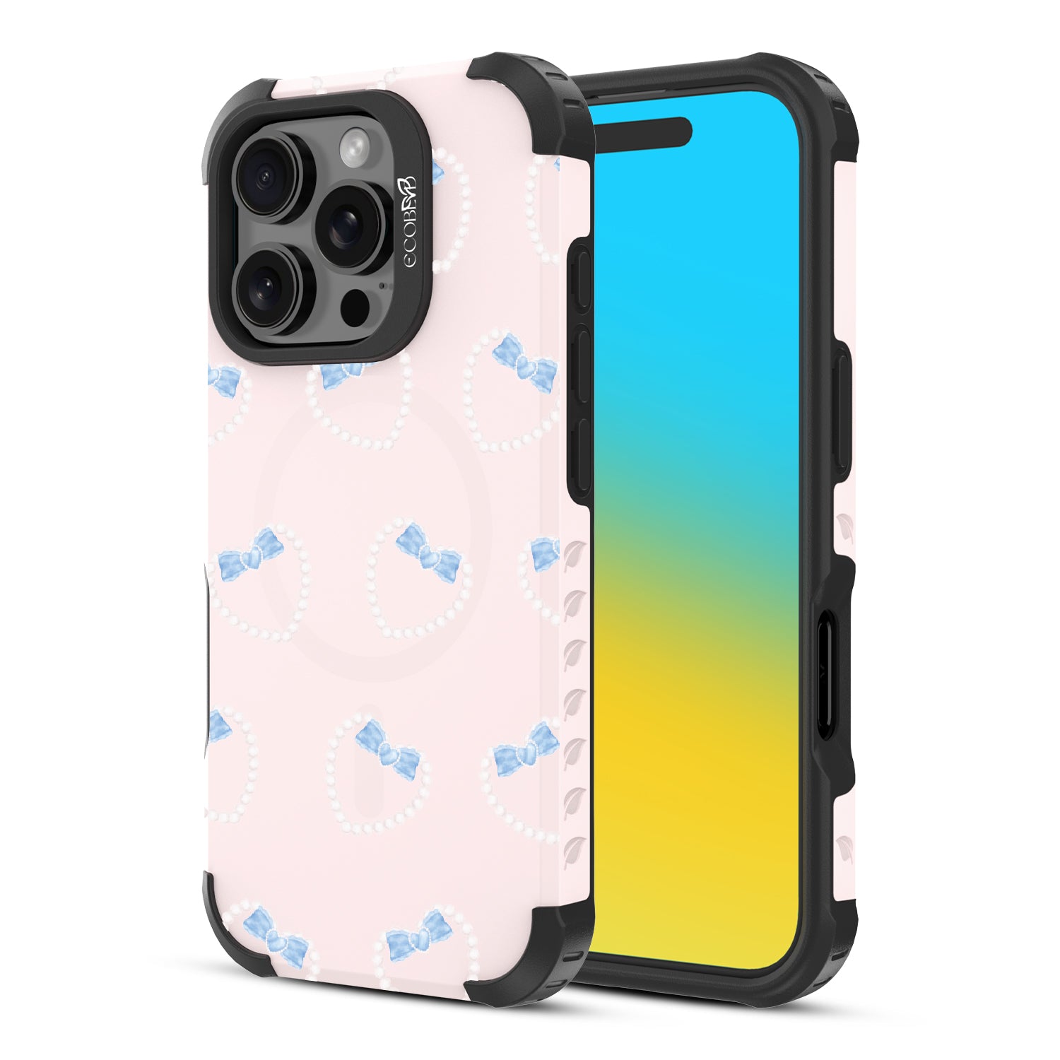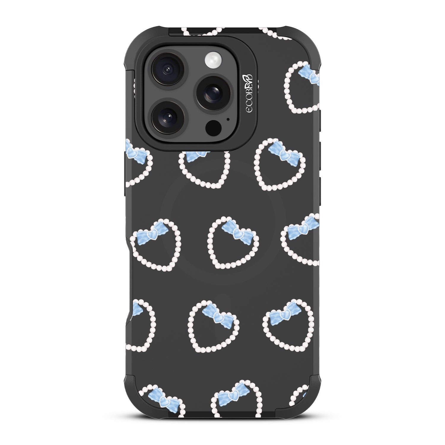 Pure bliss is found in the details, so find yours in the Pearl Bliss design on our Reforge rugged iPhone 16 Pro phone case. Luminous pearls and delicate blue bows weave together in intricate heart shapes, crafting an irresistibly dreamy look that captivates. Every detail is meticulously crafted to make those around you want more and more.