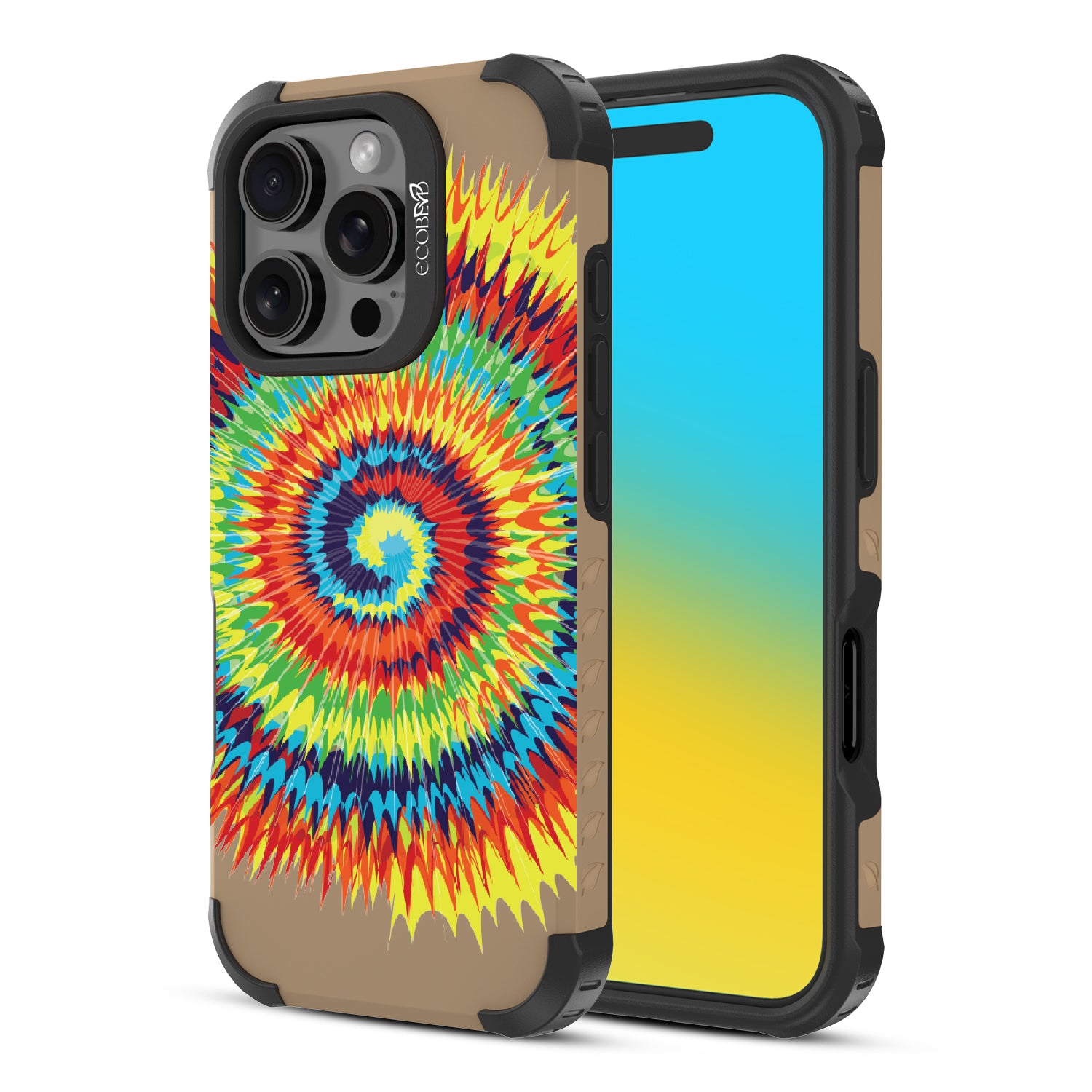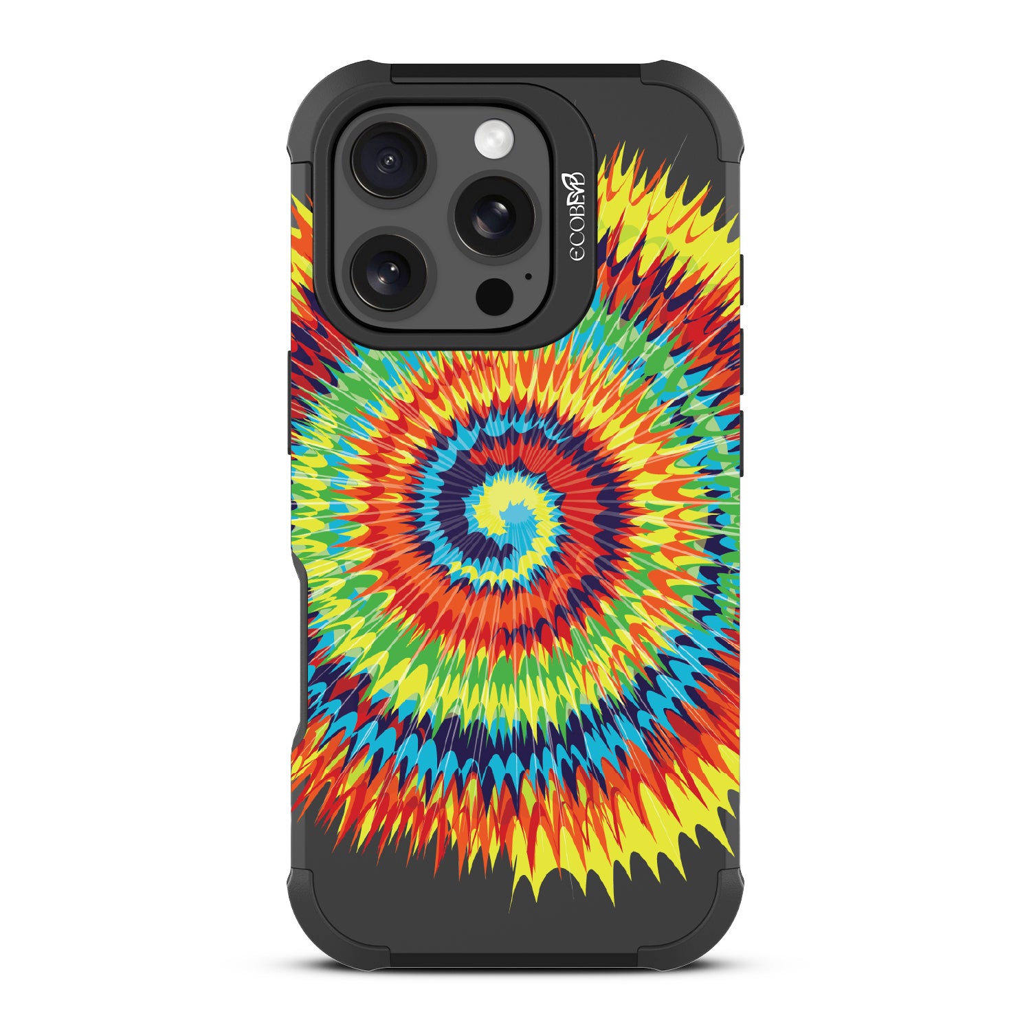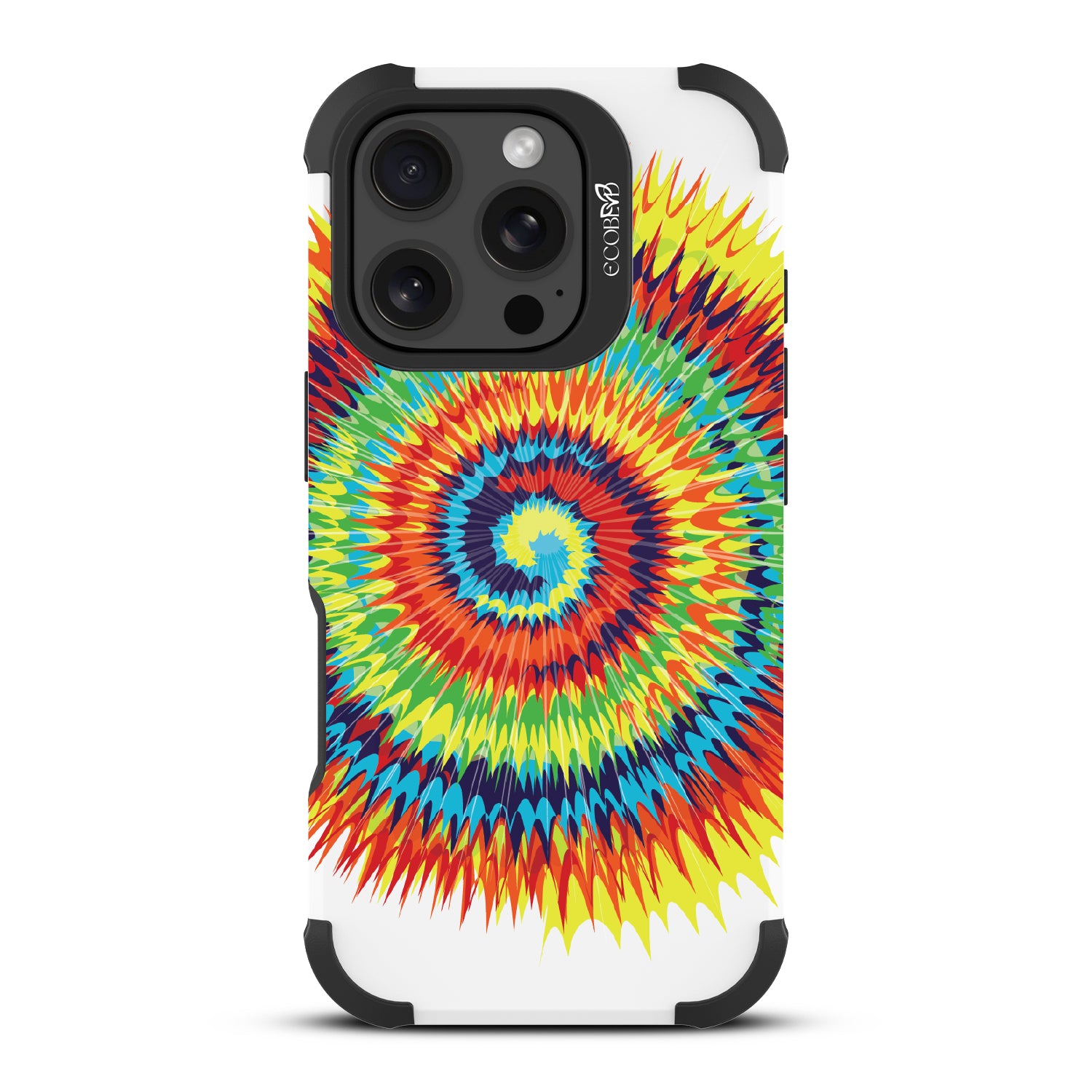 Bringing back the summer days of backyard BBQs, beach days, and fun in the sun, the Tie Dye design on our Reforge rugged iPhone 16 Pro phone case features a retro rainbow swirl pattern giving your iPhone 13 an eye-catching twist.