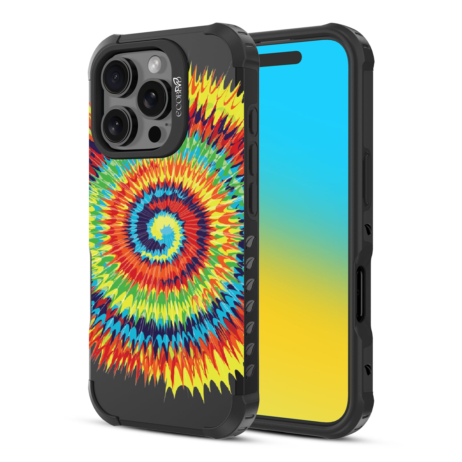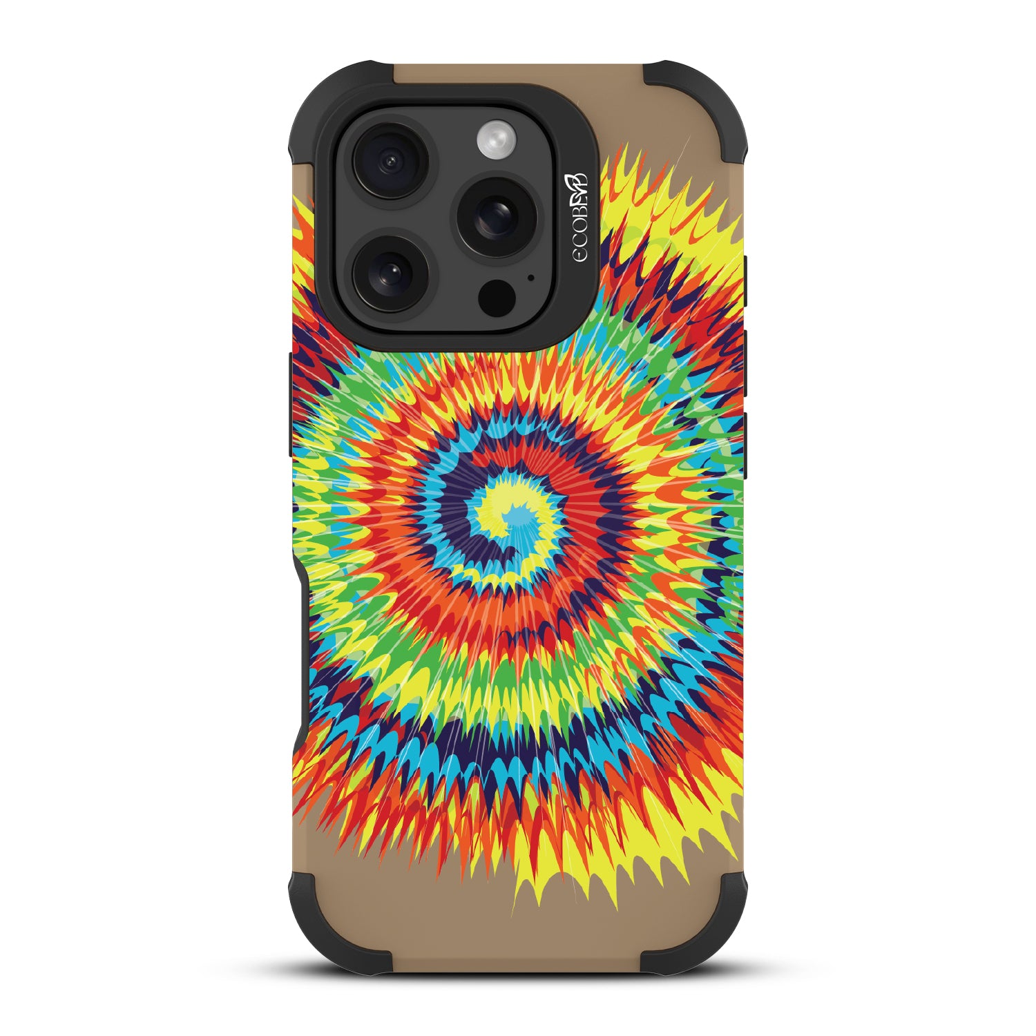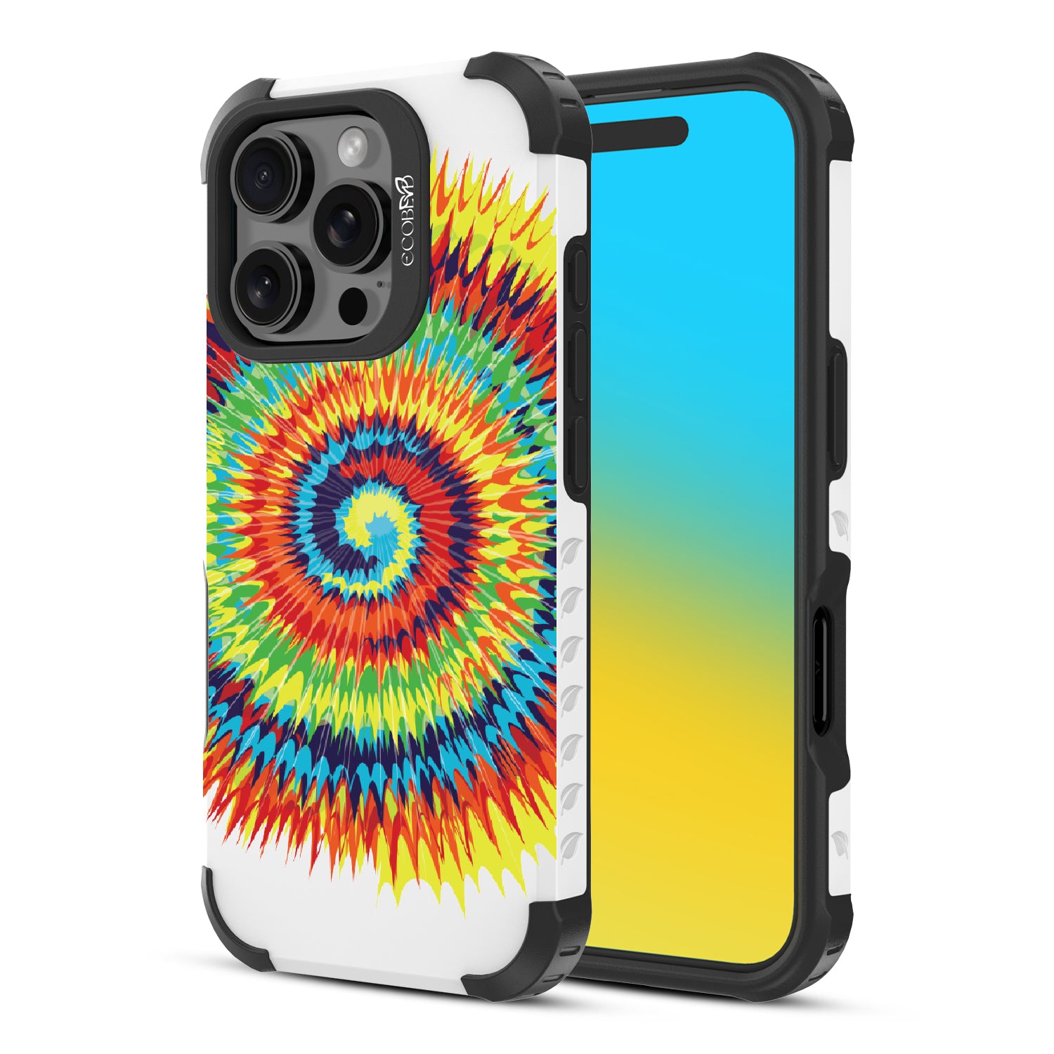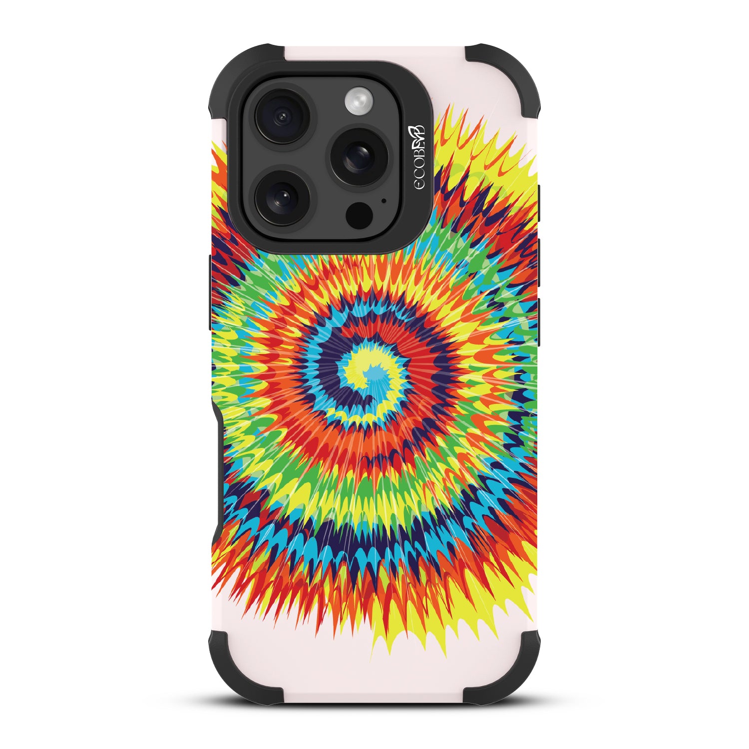 Bringing back the summer days of backyard BBQs, beach days, and fun in the sun, the Tie Dye design on our Reforge rugged iPhone 16 Pro phone case features a retro rainbow swirl pattern giving your iPhone 13 an eye-catching twist.