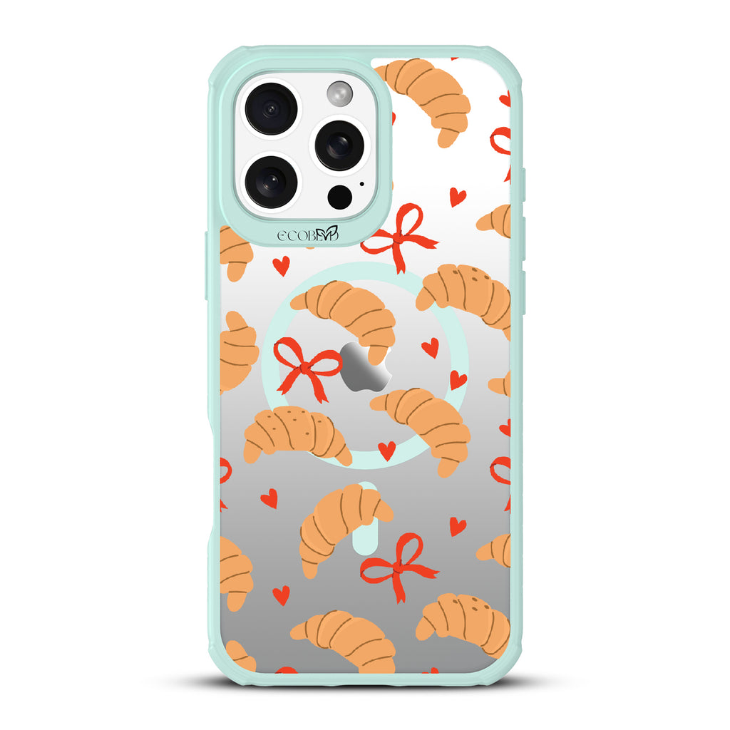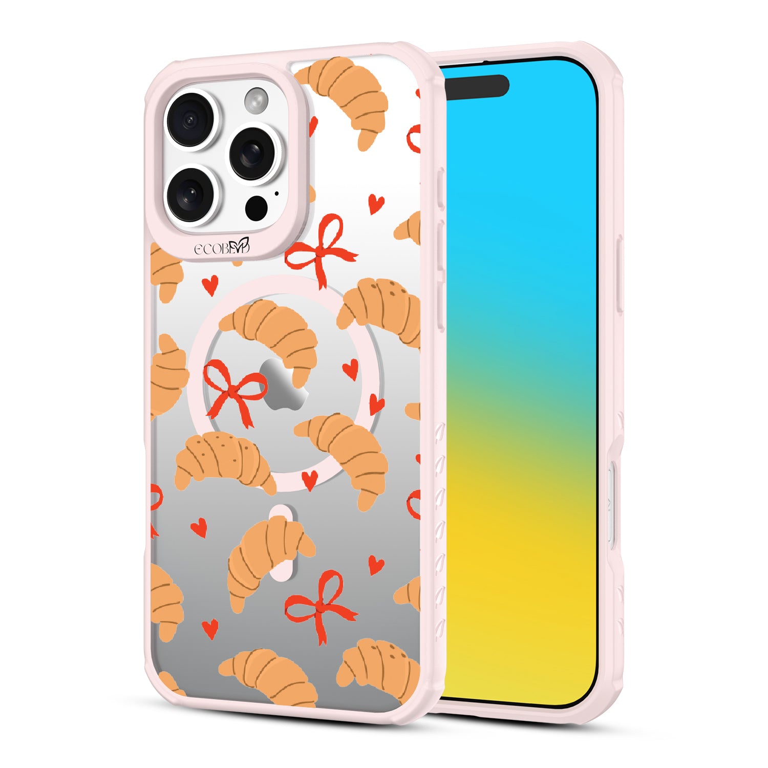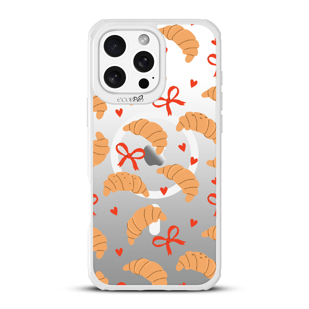 Good taste deserves the perfect recipe like the Croissant Couture design on our Revive clear iPhone 16 Pro Max case! Softly folded croissants, tied with dainty red bows and sprinkled with sweet hearts, evoke the lightness and care of a true delicacy.