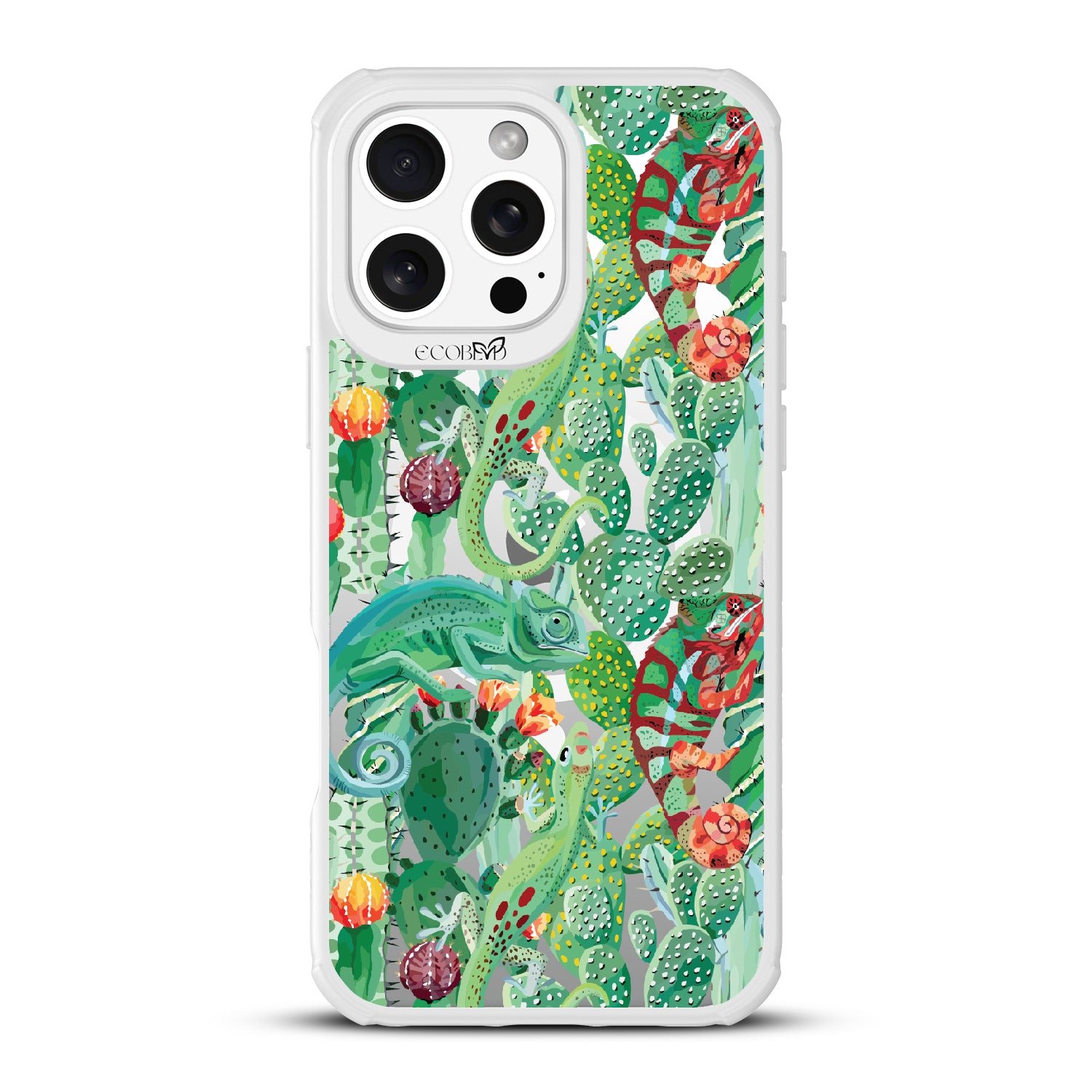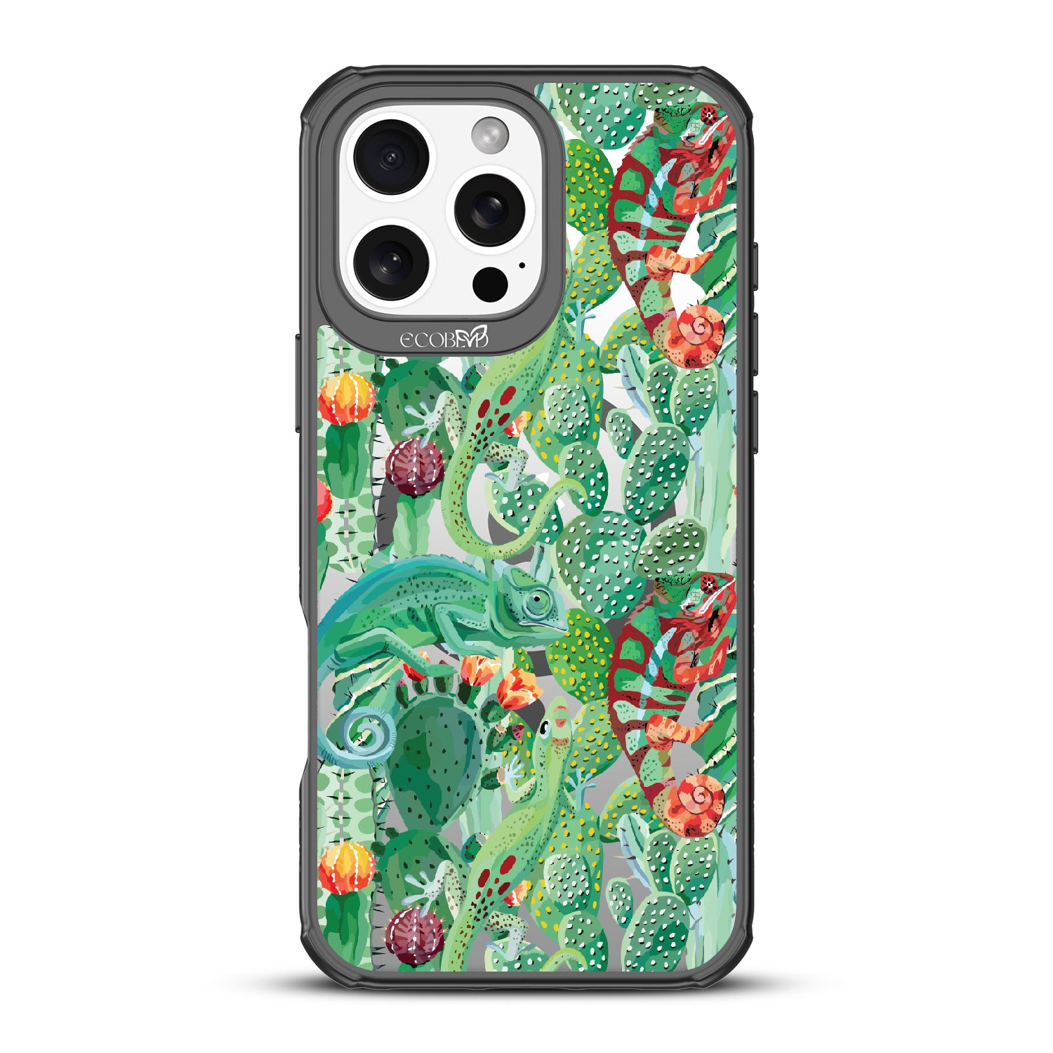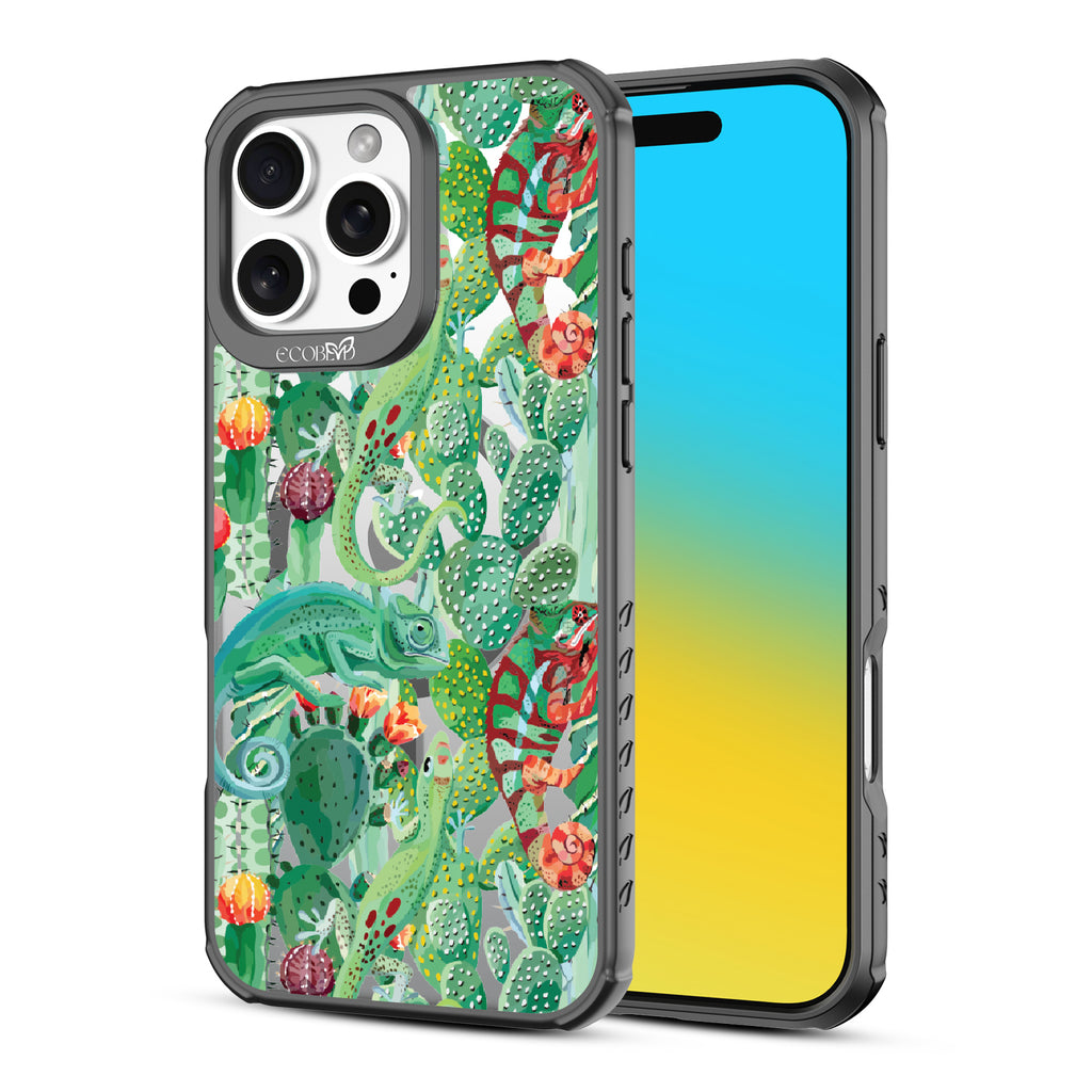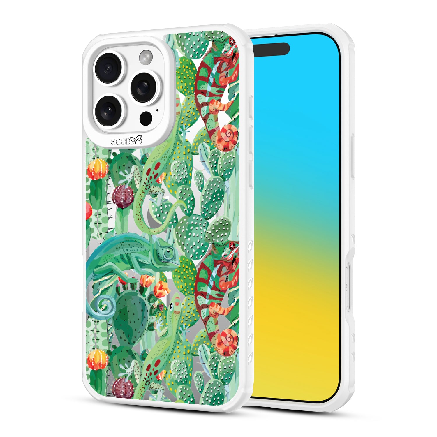 Embrace the captivating artistry of nature's hidden wonders with In Plain Sight, an exclusive design crafted for the Revive clear iPhone 16 Pro Max phone case. Immerse yourself in impeccable style and protection while supporting ocean conservation efforts, as you embark on a wild journey with this captivating phone case. This design shows that sometimes, the most beautiful things are hiding In Plain Sight with a playful nod to the chameleons' camouflage abilities and their effortless blend into the colorful cactus landscape.