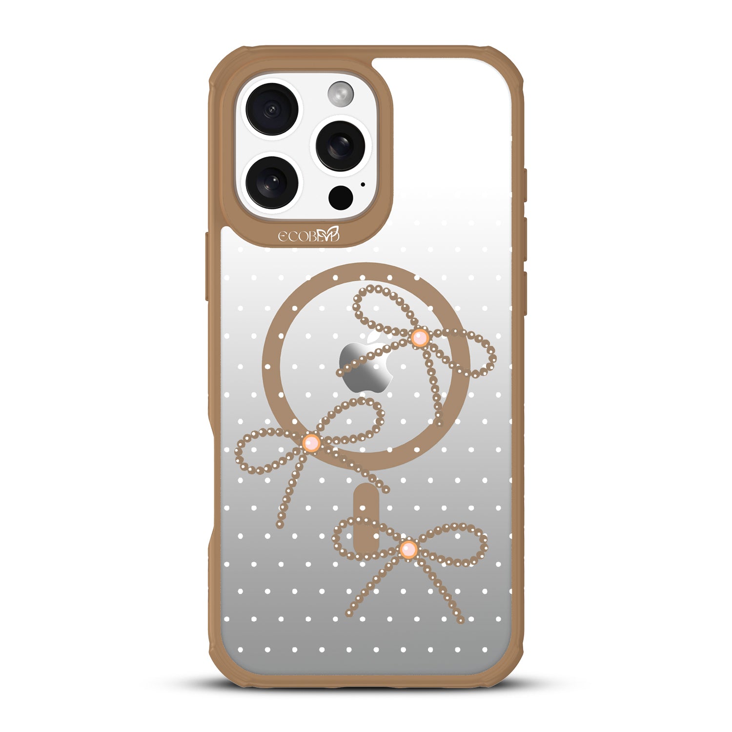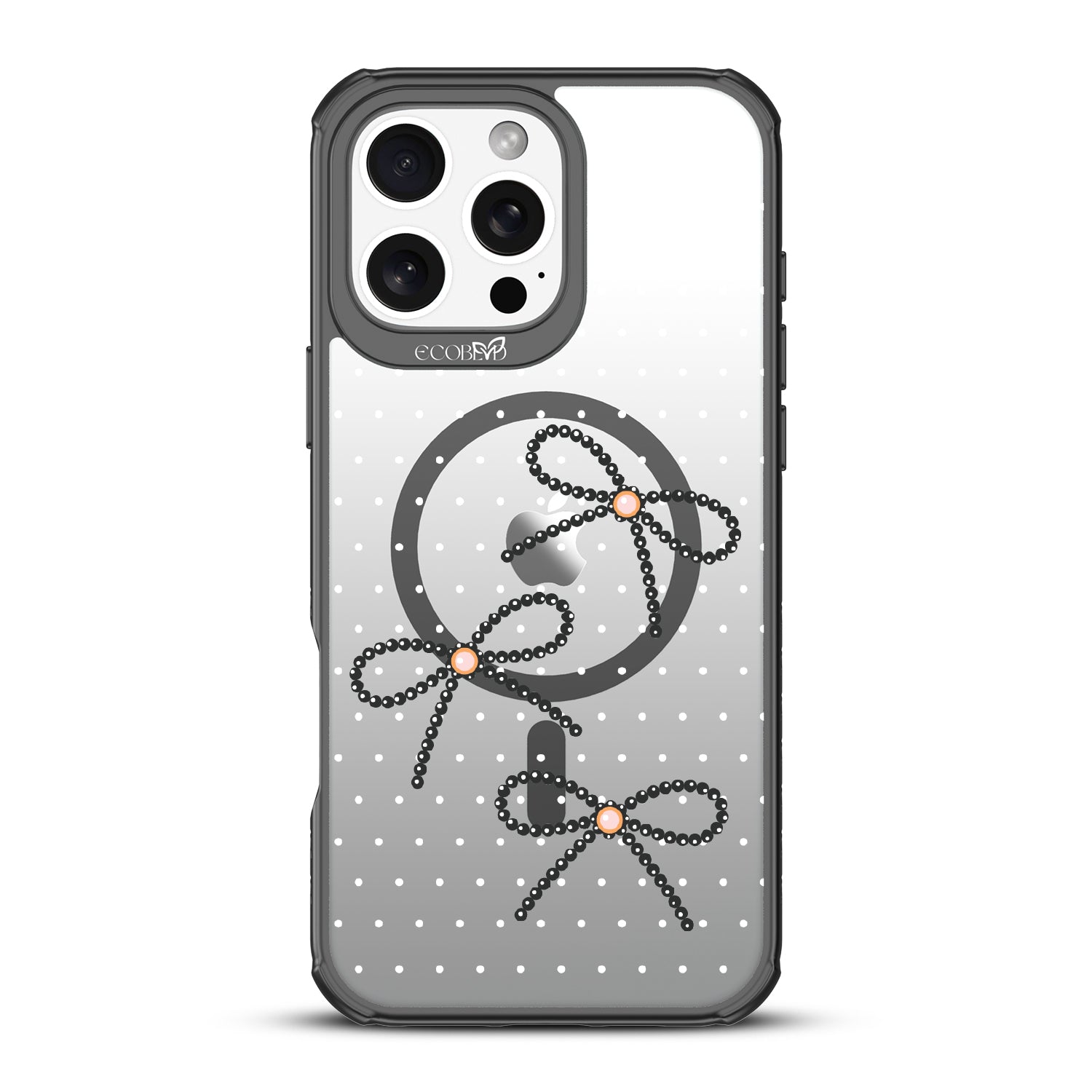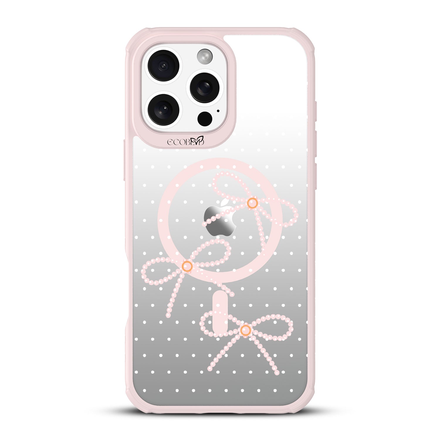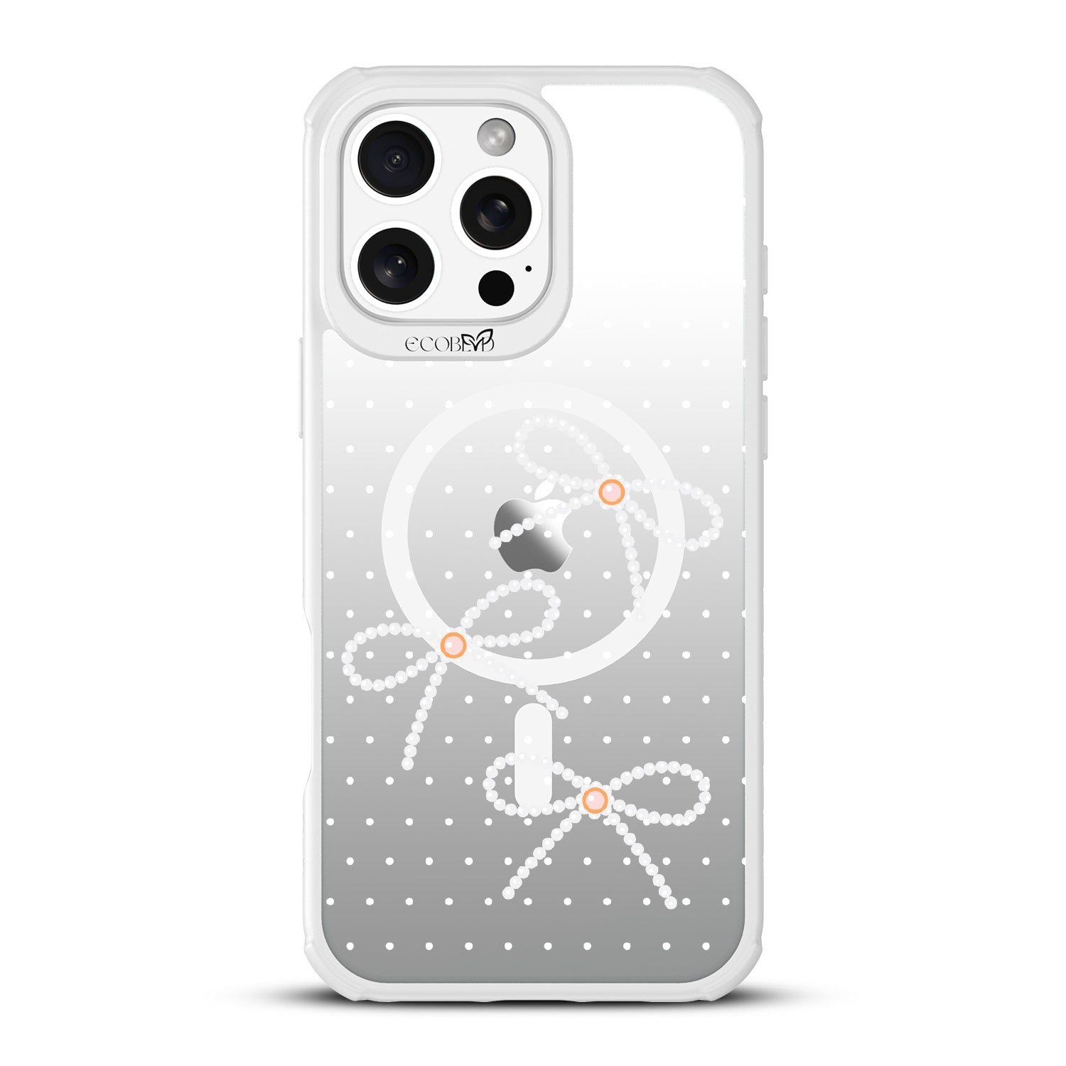Knot to be outdone, the Knot So Little design on our Revive clear iPhone 16 Pro Max phone case brings big style in small doses. Featuring pearls tied into dainty bows, this design adds a sophisticated touch to your phone. Show off your love for the little things with this elegant look.