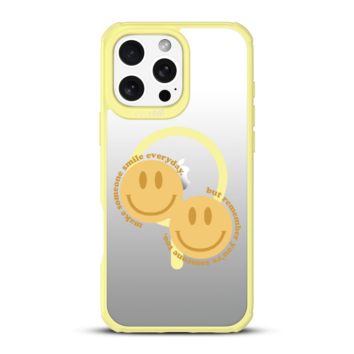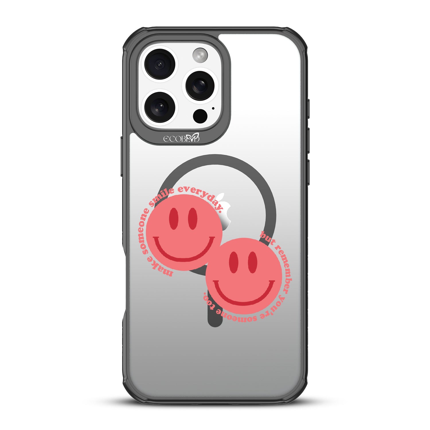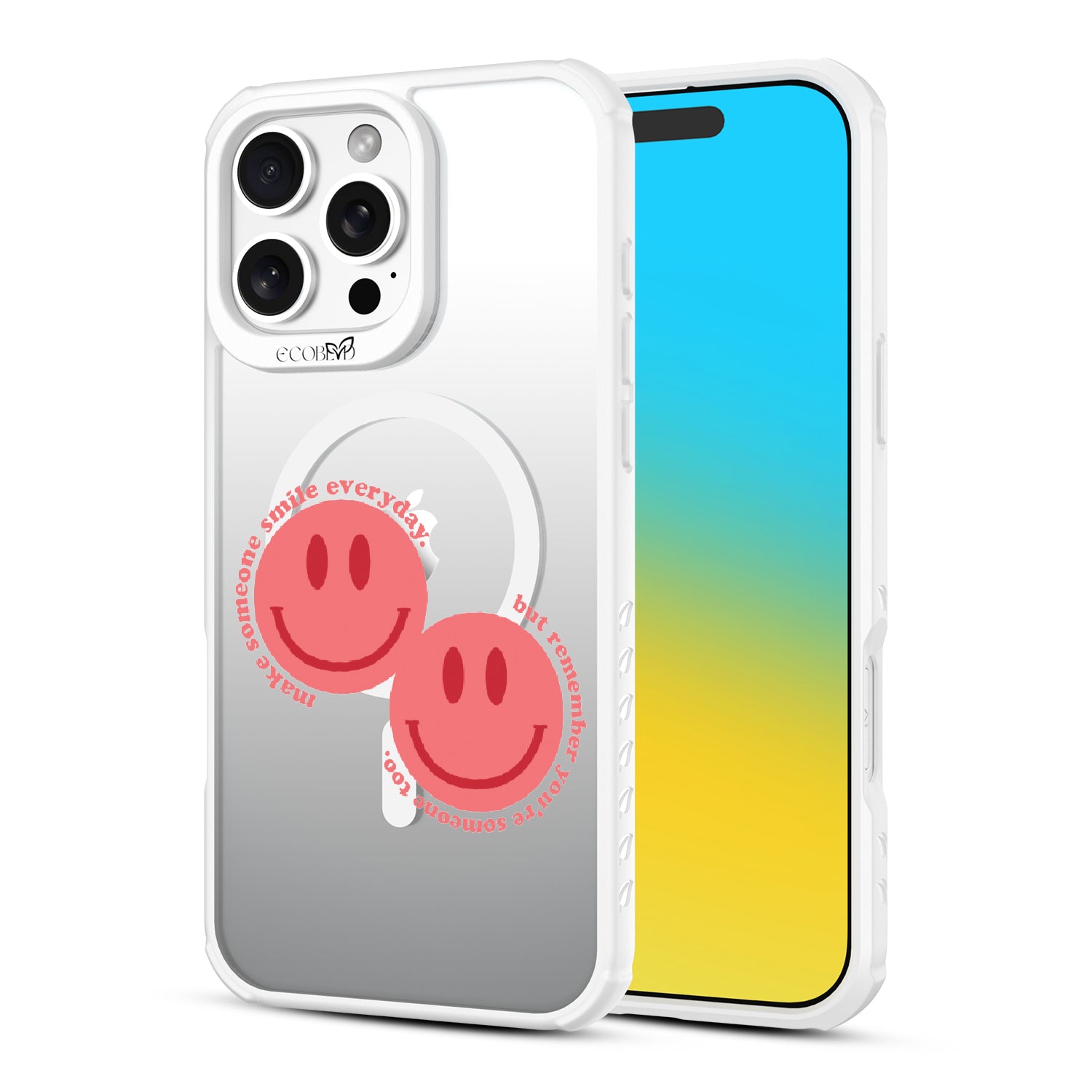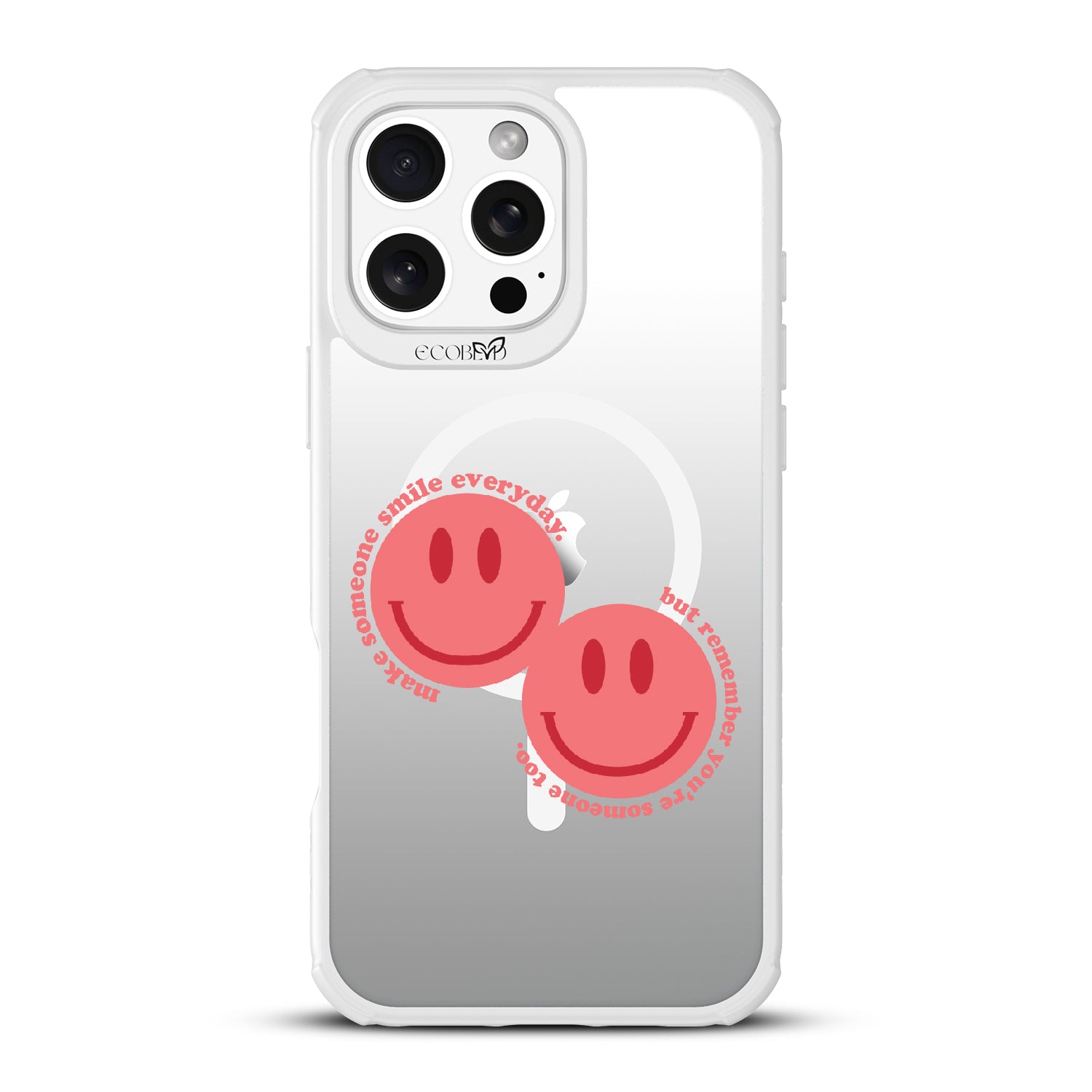 Spread happiness with the Make Someone Smile design on our Revive clear iPhone 16 Pro Max phone case. Featuring two cheerful smiley faces, this design prompts you to be a source of joy for others. While you make someone else smile, recognize that you too are deserving of moments filled with happiness.