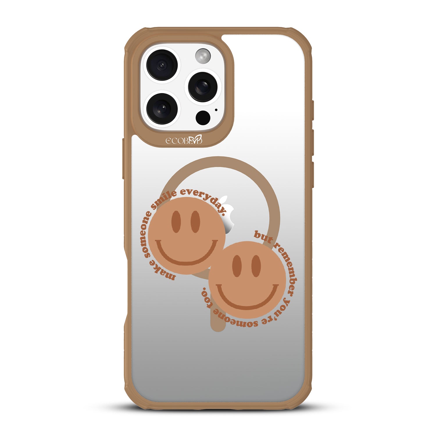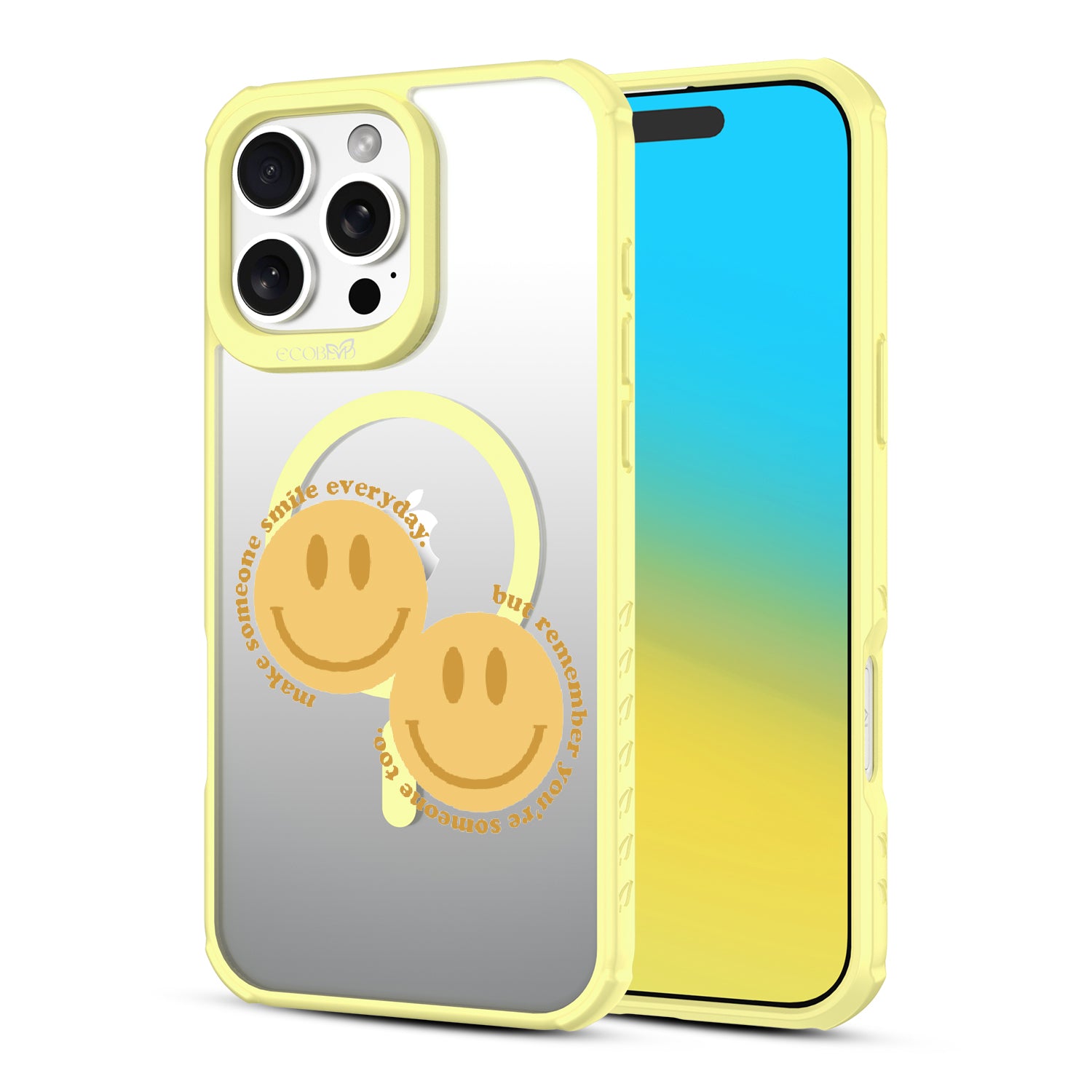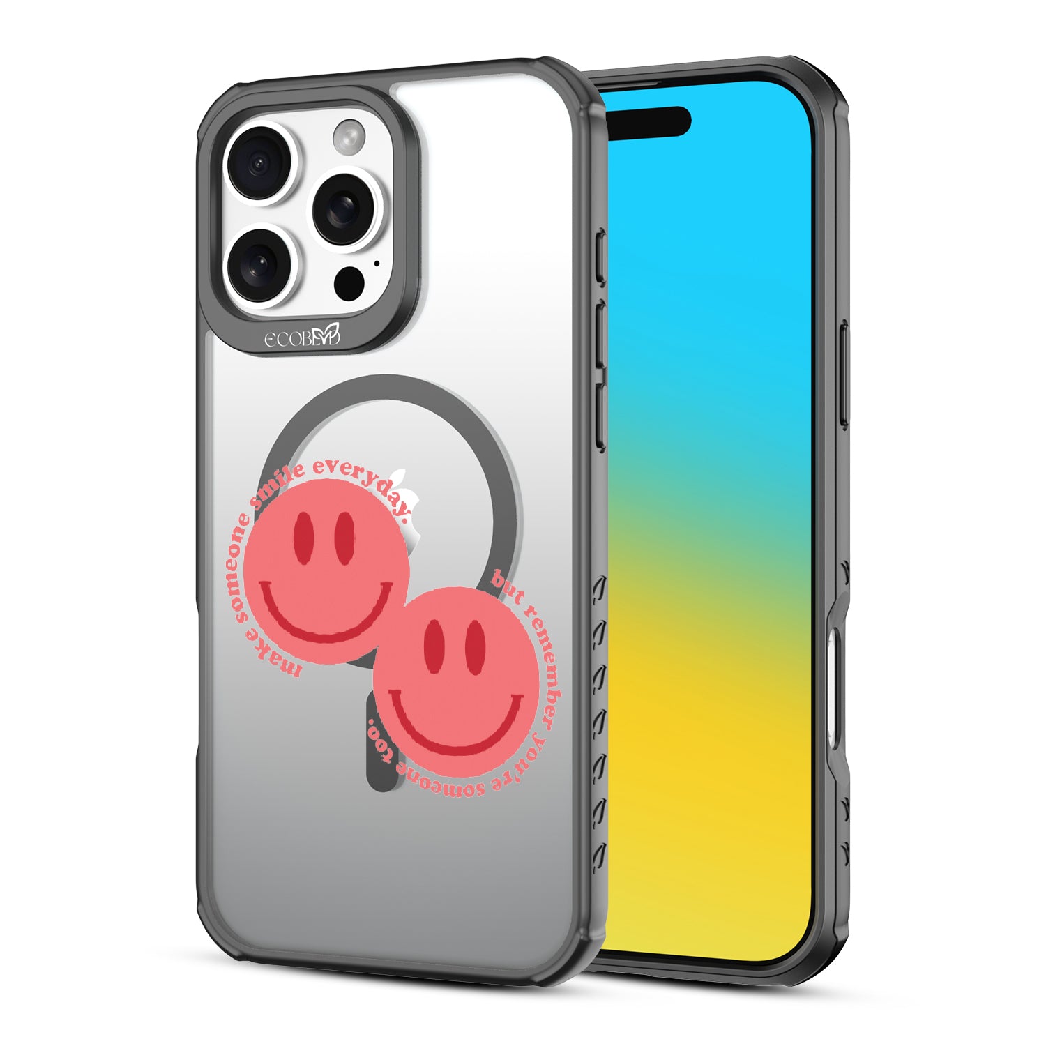 Spread happiness with the Make Someone Smile design on our Revive clear iPhone 16 Pro Max phone case. Featuring two cheerful smiley faces, this design prompts you to be a source of joy for others. While you make someone else smile, recognize that you too are deserving of moments filled with happiness.