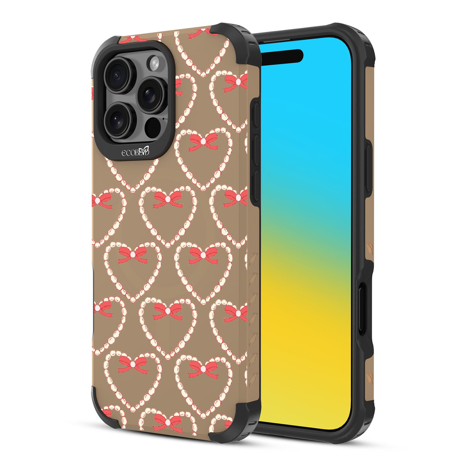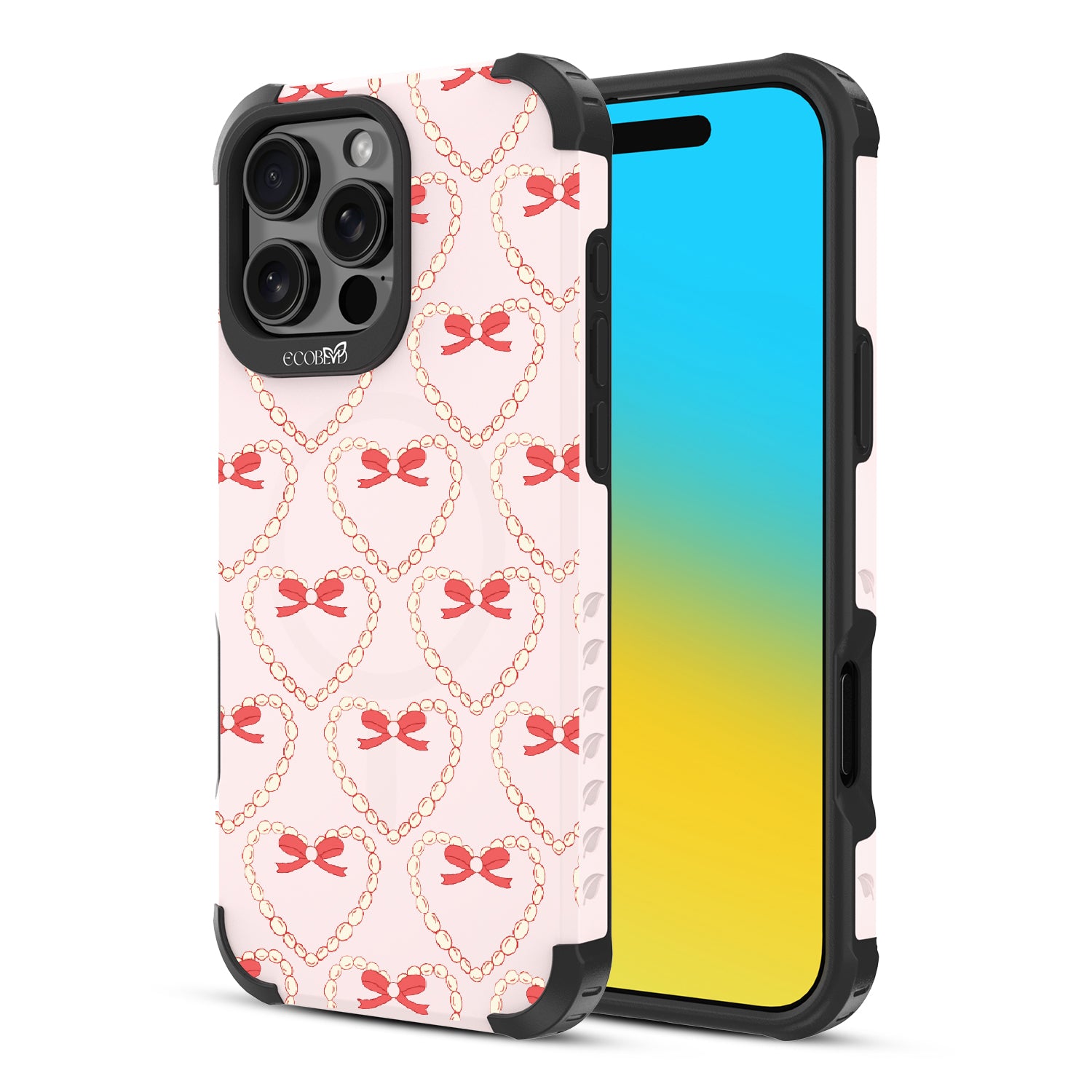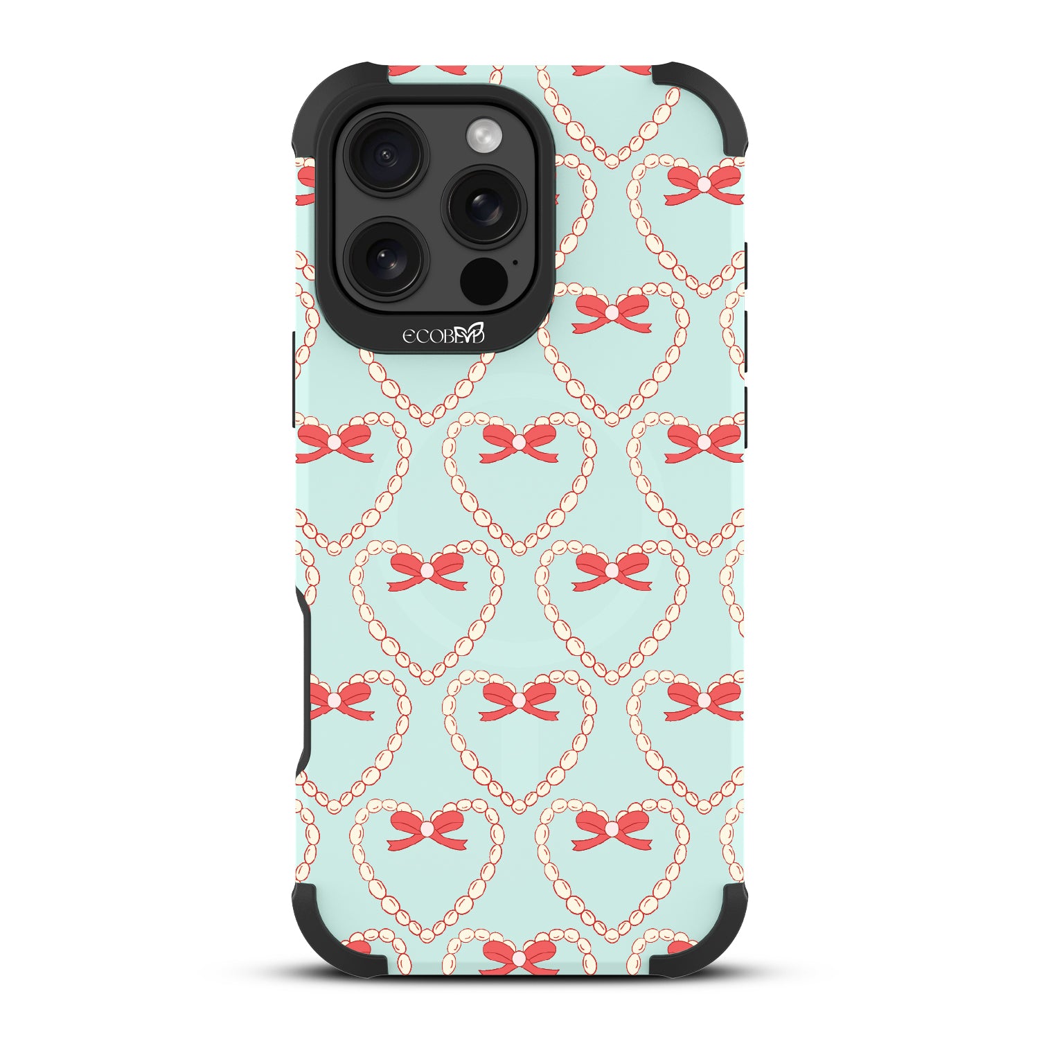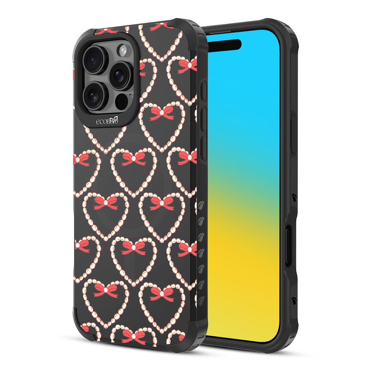 Tug at your Heart Strings with this beautifully crafted design on Reforge rugged iPhone 16 Pro Max phone case, featuring delicate pearls and coquettish bows arranged in heart shapes. Let your phone strum the chords of elegance with this captivating pattern. Each heart-shaped detail will make your style sing in love songs.