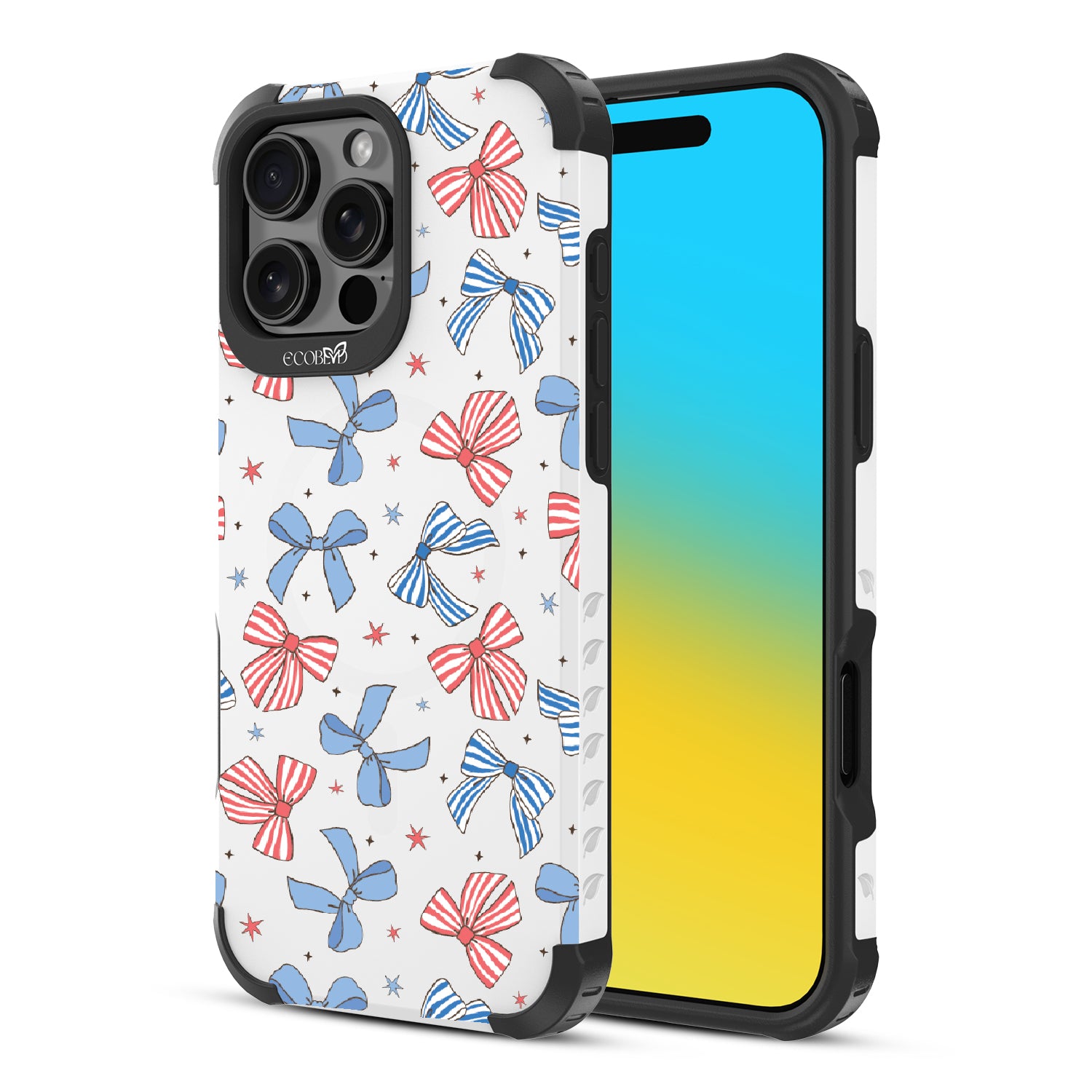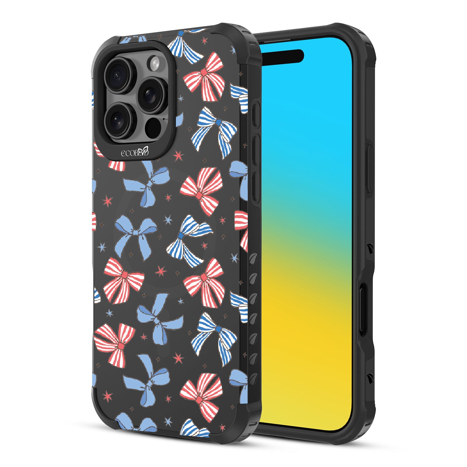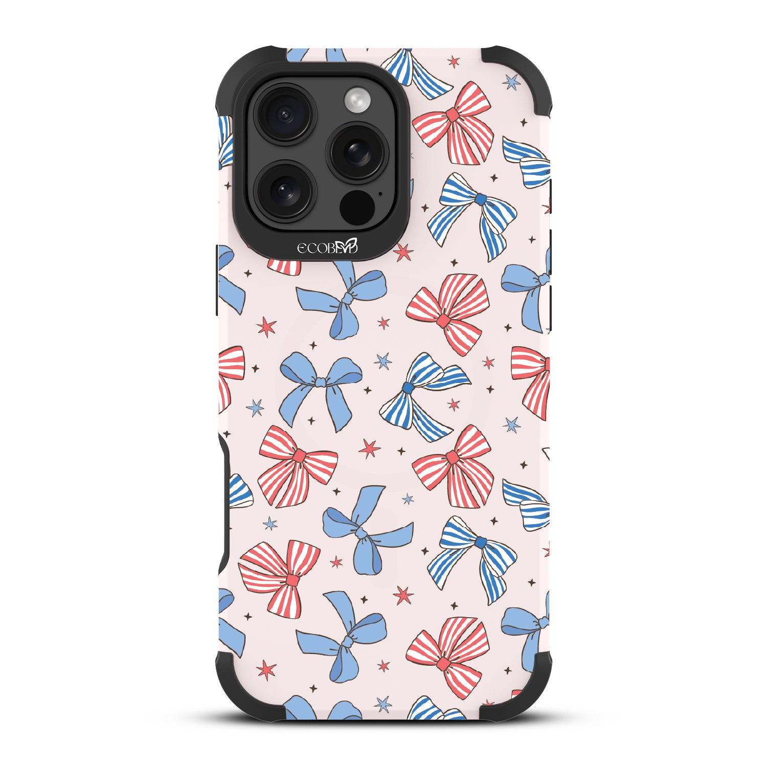 America the bow-tiful! The Miss Americana design on our Reforge rugged iPhone 16 Pro Max phone case crowns your phone with patriotic flair. With red, white, and blue bows, this coquette phone case design turns your phone into the belle of the Americana ball.