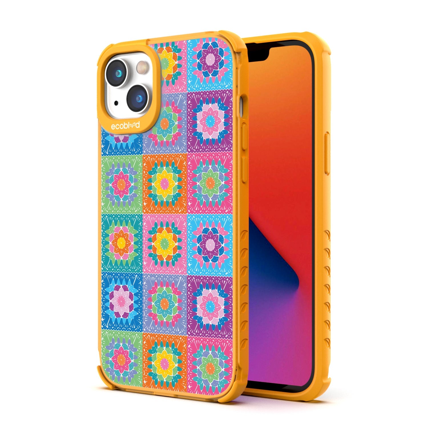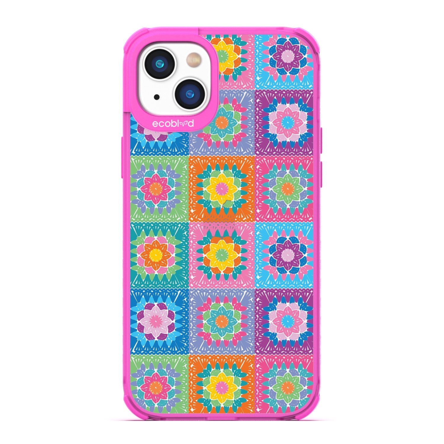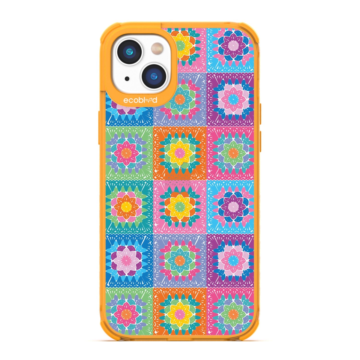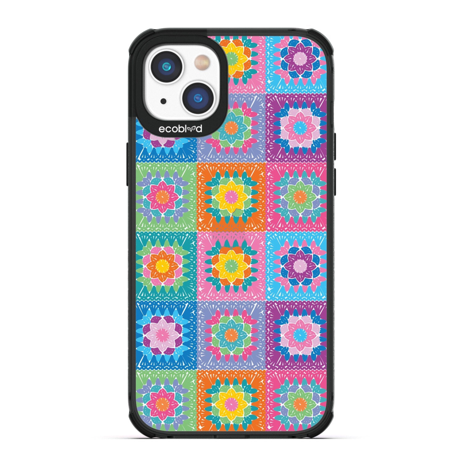 Let the All Squared Away design on our Laguna clear iPhone 16eiPhone 14, and iPhone 13 case be your constant companion for Spring Break and music fests, giving you a warm and inviting look with its quilt-like design of vintage granny squares and intricate flowers in five bright colorways: Midnight Black, Cascade Blue, Foliage Green, Illuminating Yellow, and Wildflower Pink.