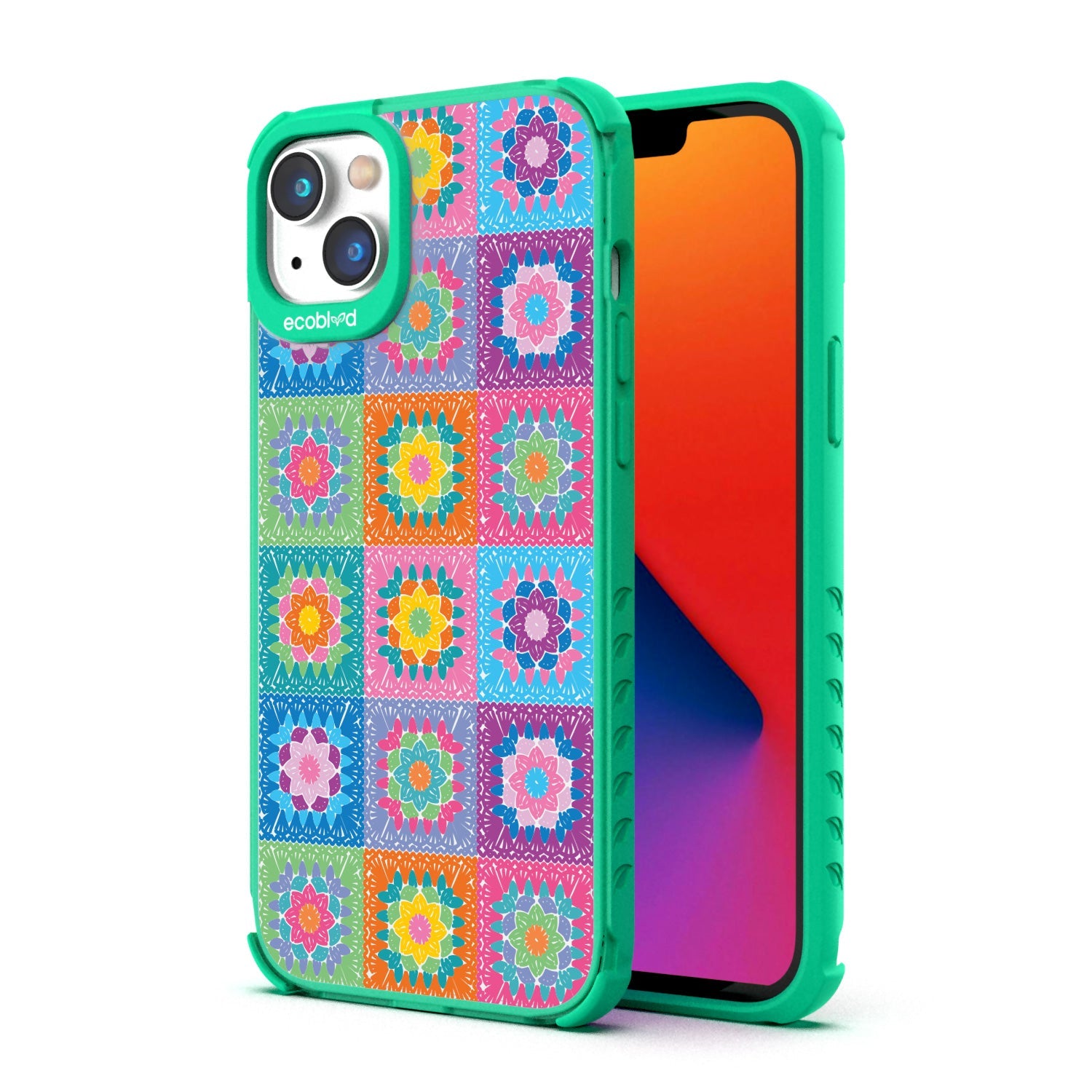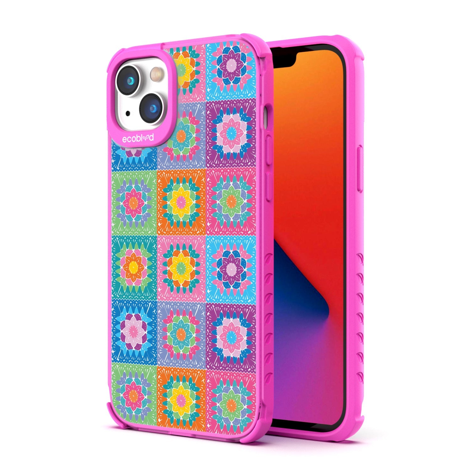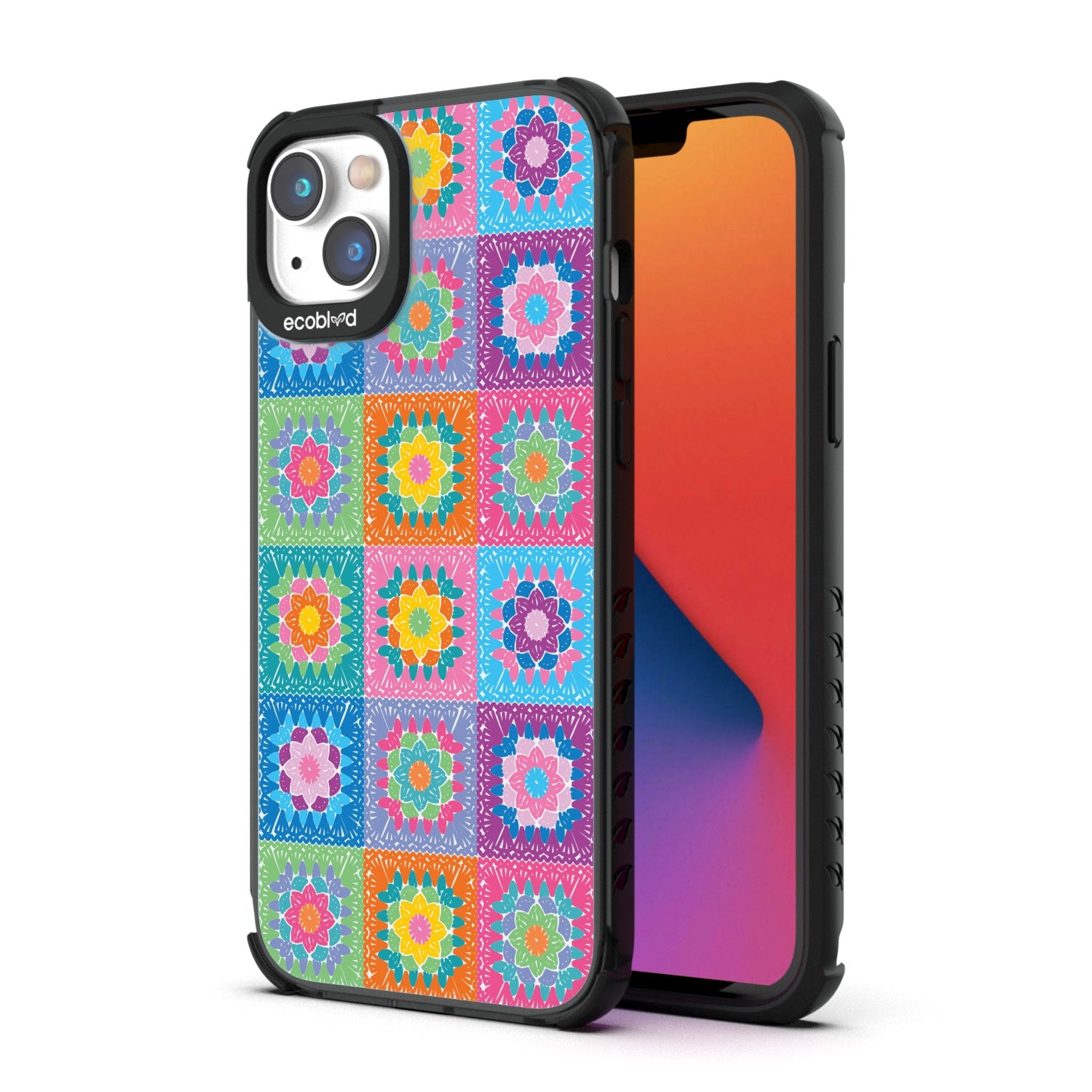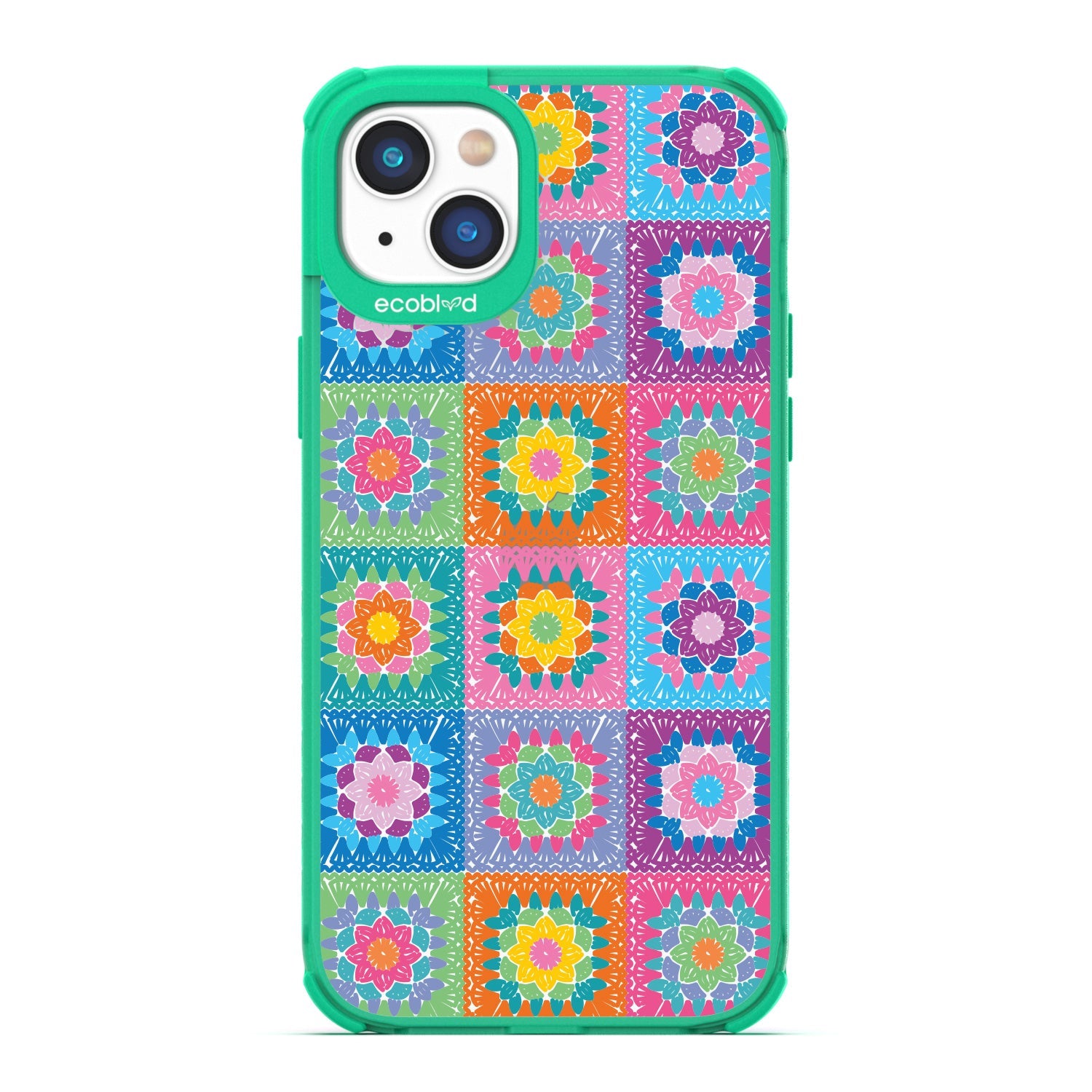Let the All Squared Away design on our Laguna clear iPhone 16eiPhone 14, and iPhone 13 case be your constant companion for Spring Break and music fests, giving you a warm and inviting look with its quilt-like design of vintage granny squares and intricate flowers in five bright colorways: Midnight Black, Cascade Blue, Foliage Green, Illuminating Yellow, and Wildflower Pink.