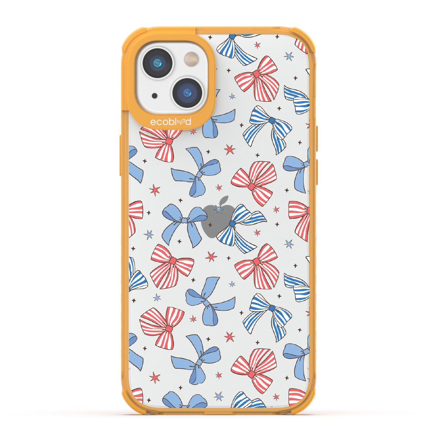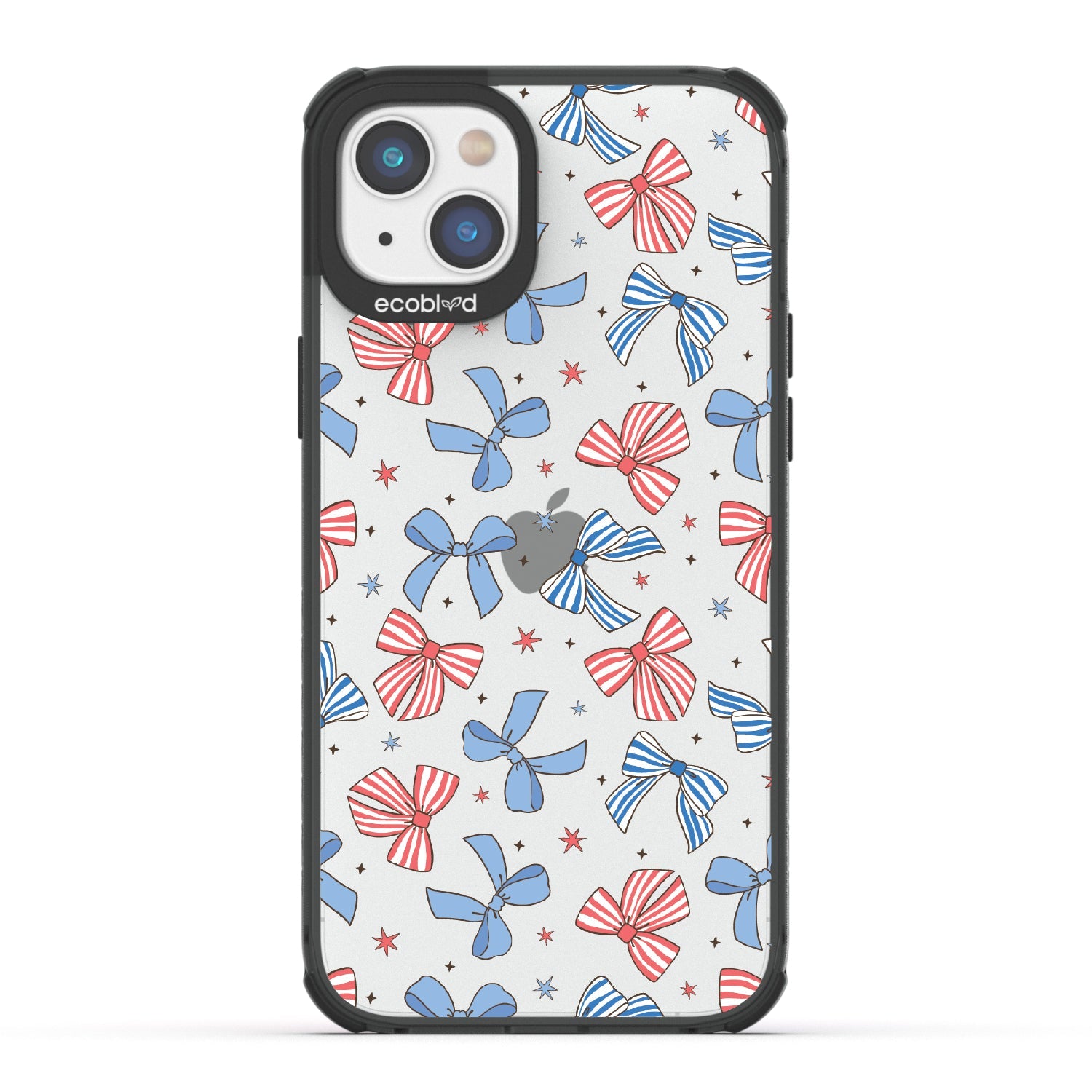 America the bow-tiful! The Miss Americana design on our Laguna clear iPhone 16e, iPhone 14, and iPhone 13 phone case crowns your phone with patriotic flair. With red, white, and blue bows, this coquette phone case design turns your phone into the belle of the Americana ball.