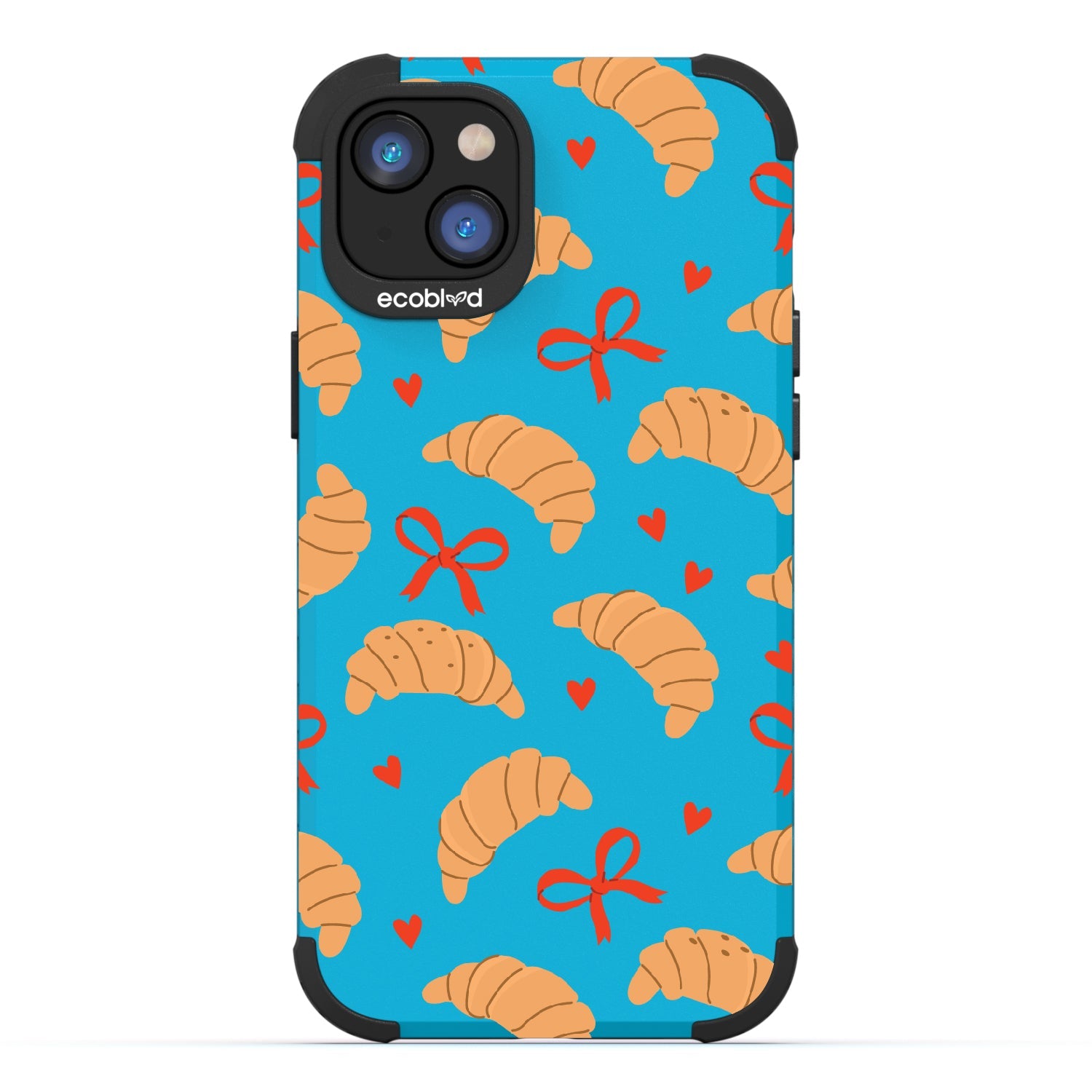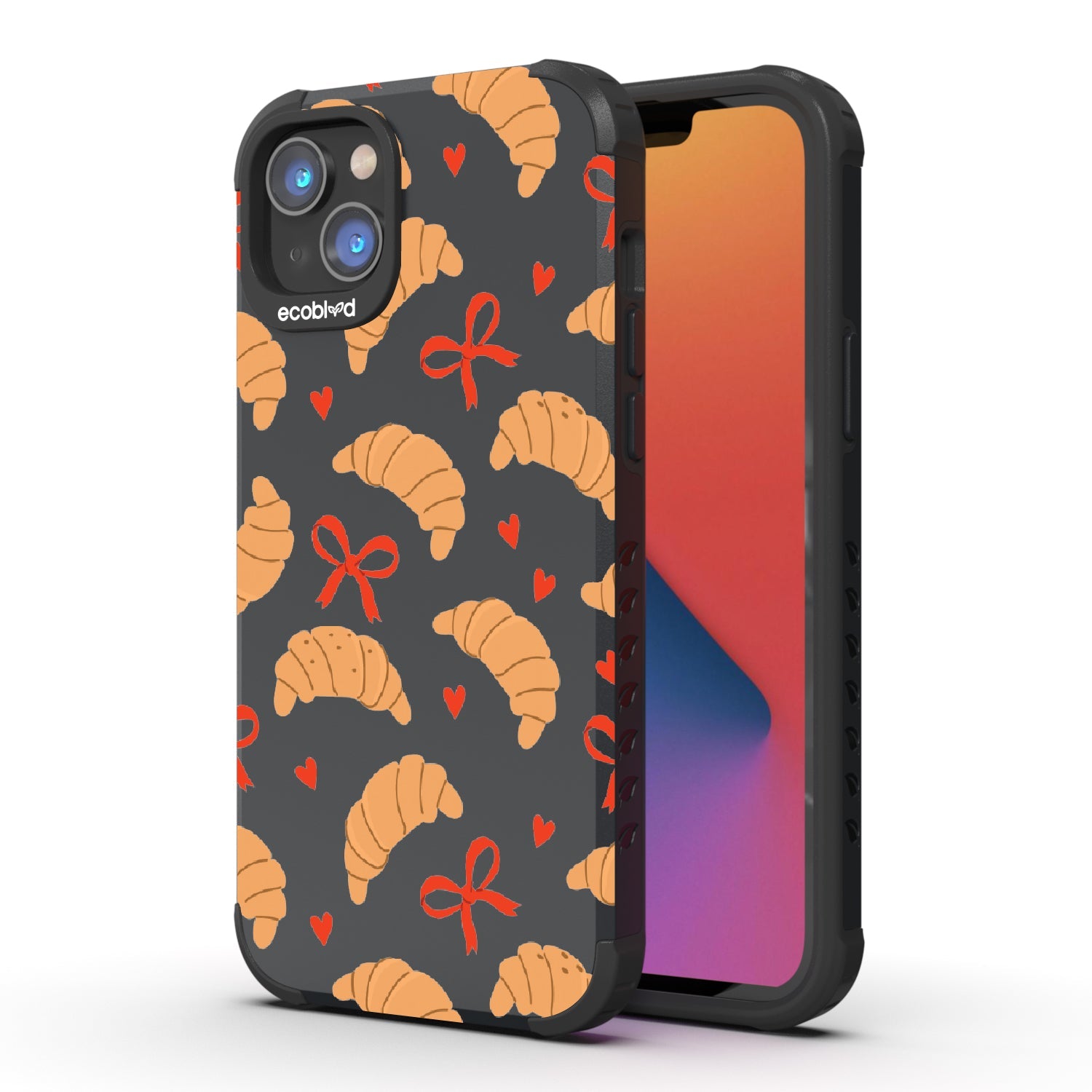 Good taste deserves the perfect recipe like the Croissant Couture design on our Mojave rugged and compostable iPhone 16e, iPhone 14, and iPhone 13 case! Softly folded croissants, tied with dainty red bows and sprinkled with sweet hearts, evoke the lightness and care of a true delicacy.