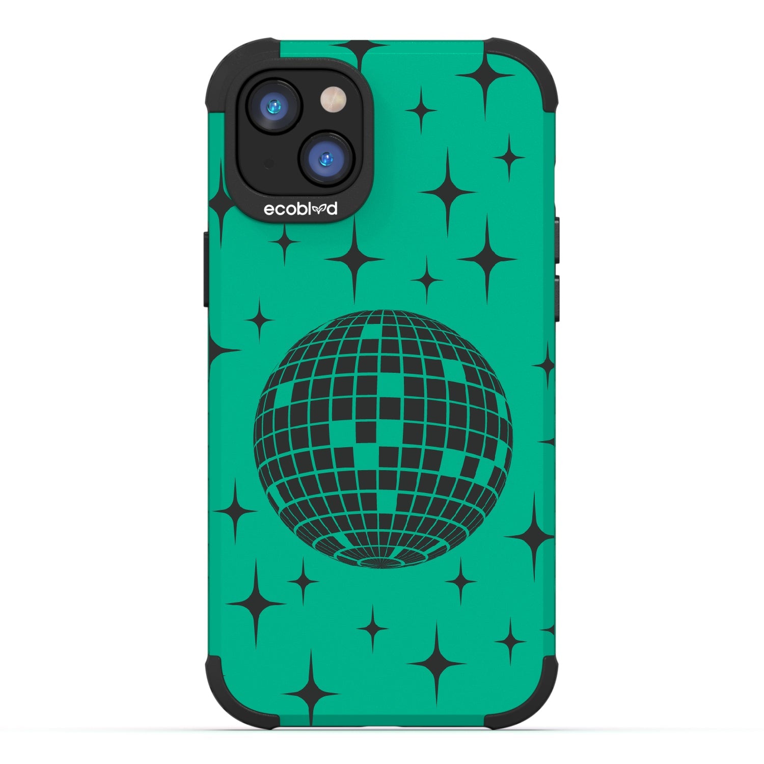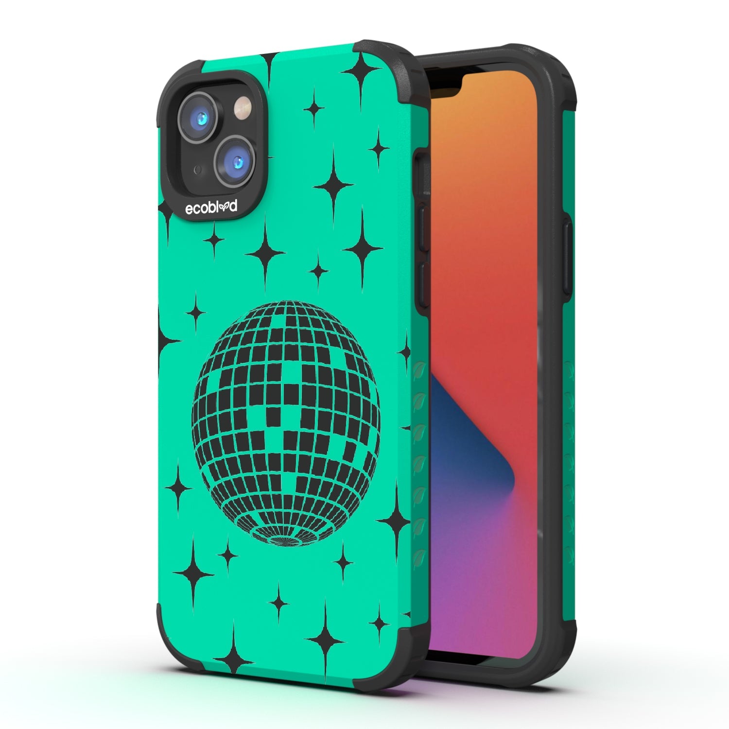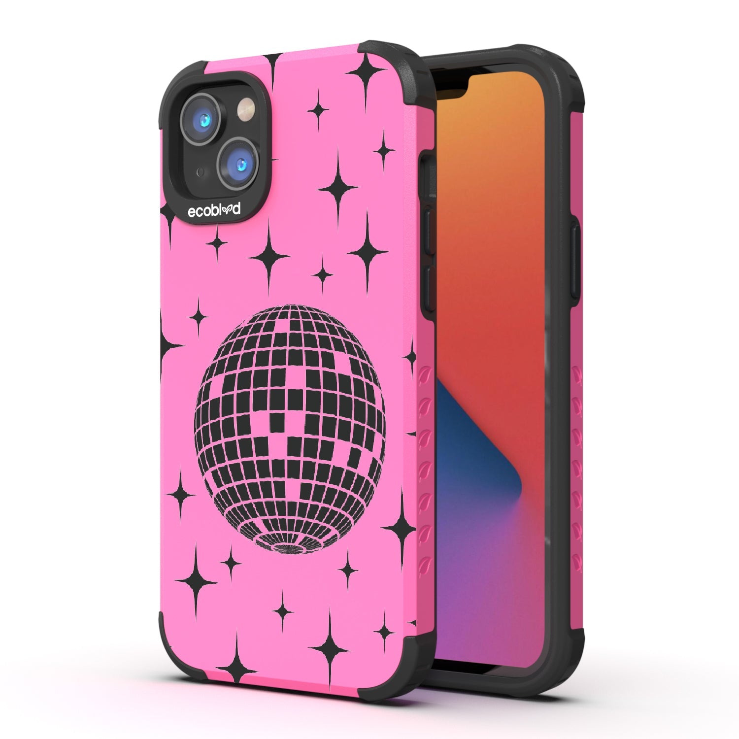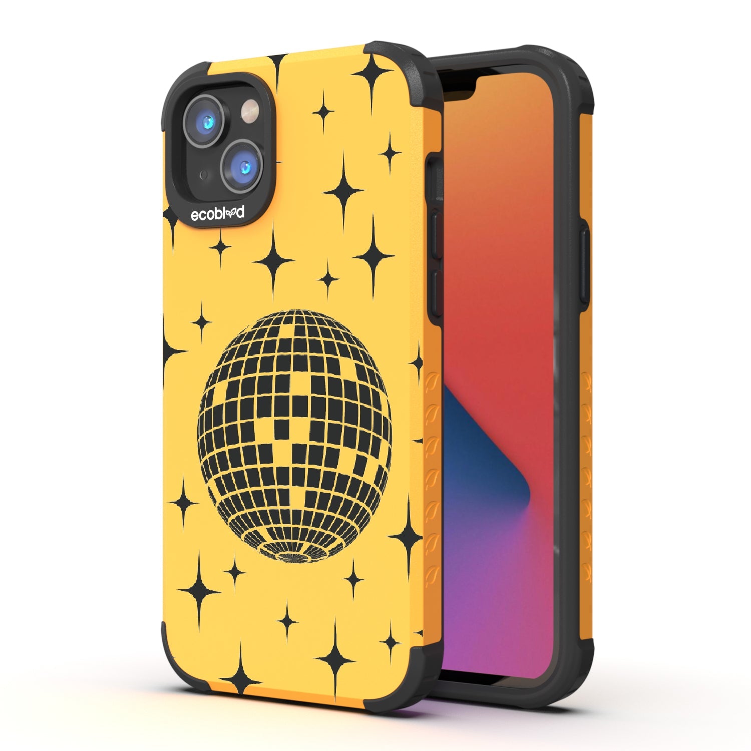 Let it all hang footloose as you hit the dancefloor with the Disco With The Flow design on our Mojave rugged and compostable iPhone 16e, iPhone 14, and iPhone 13 case and its mirrorball that reflects your smartphone in five groovy colors: Midnight Black, Cascade Blue, Foliage Green, Illuminating Yellow, and Wildflower Pink.