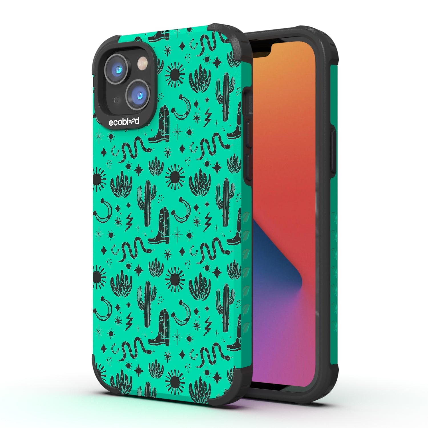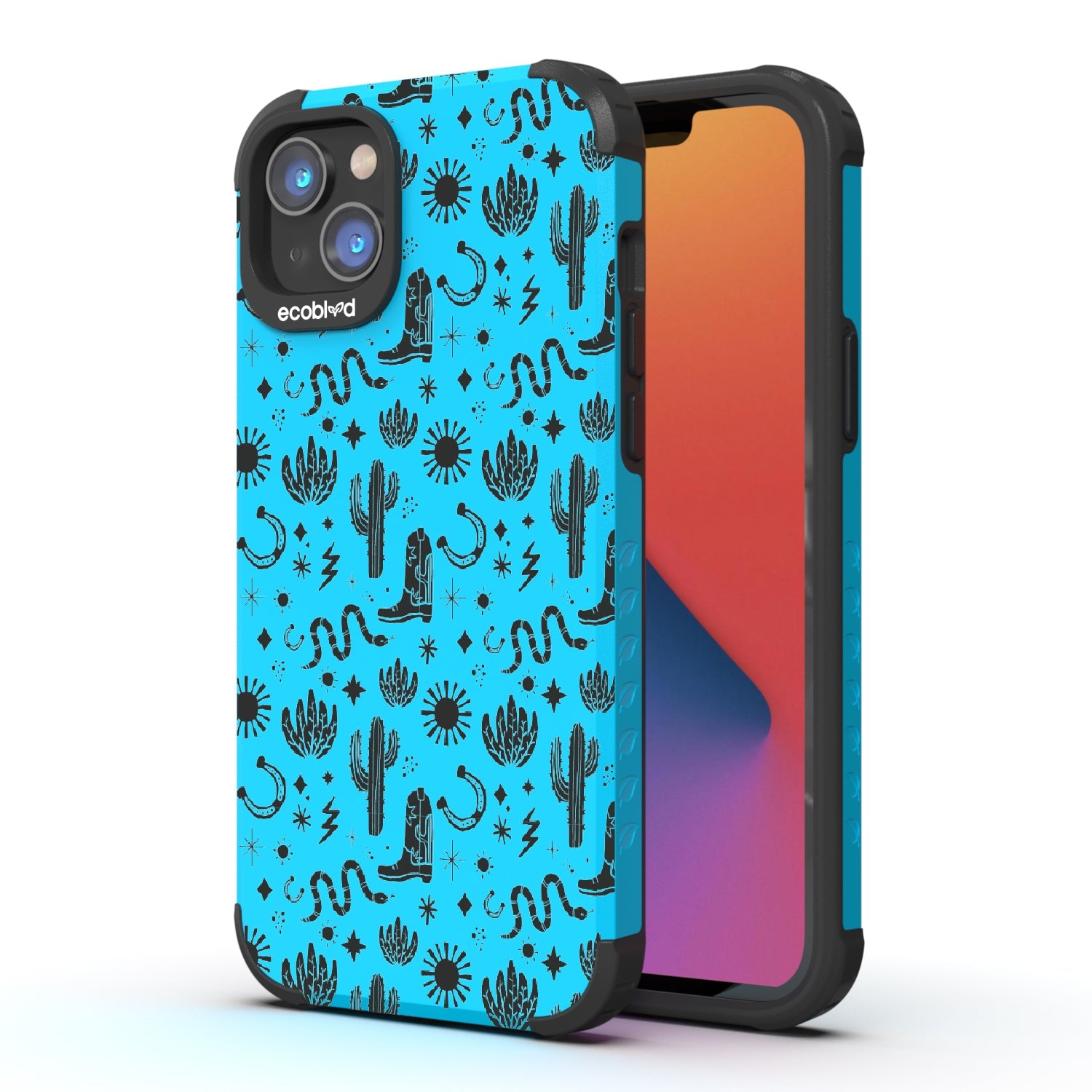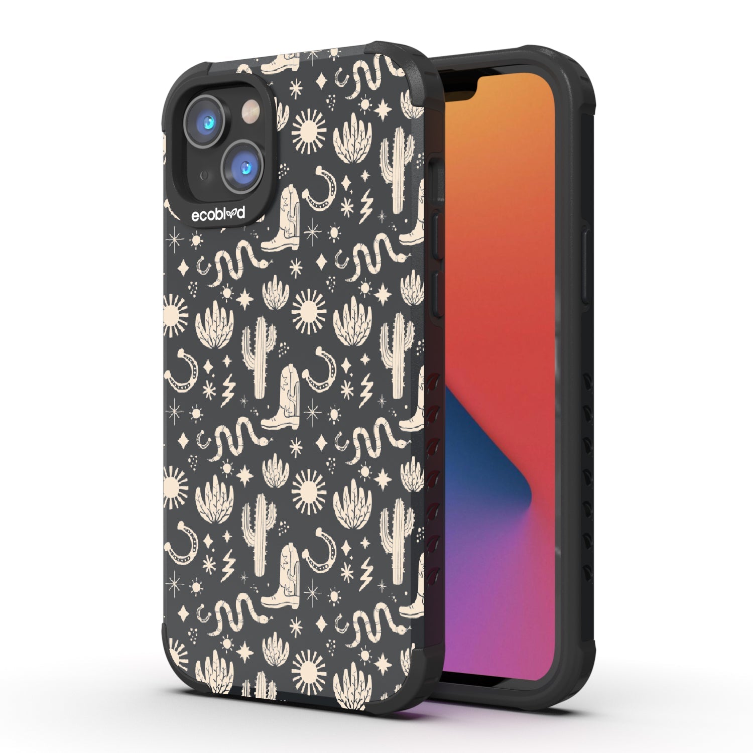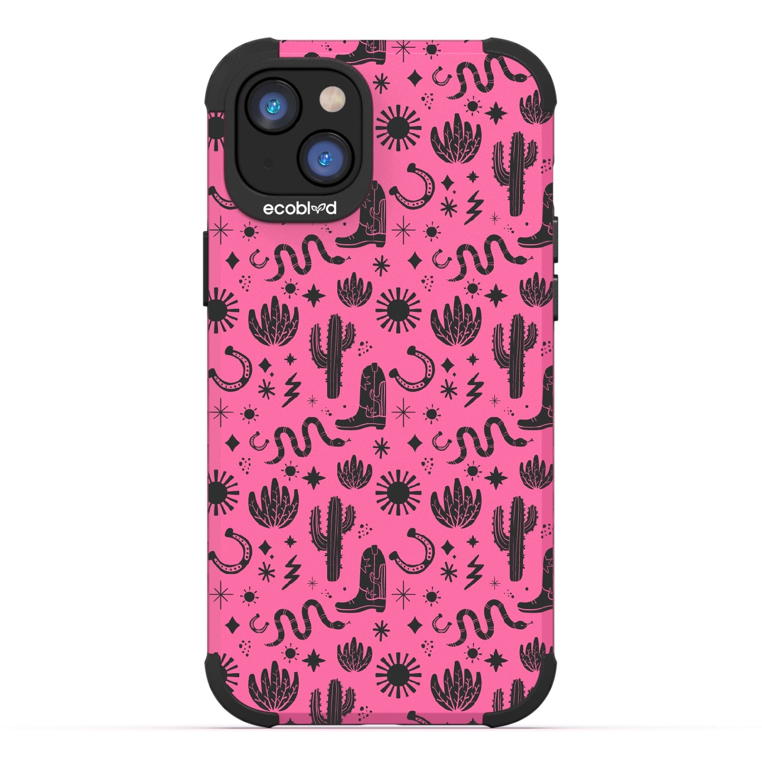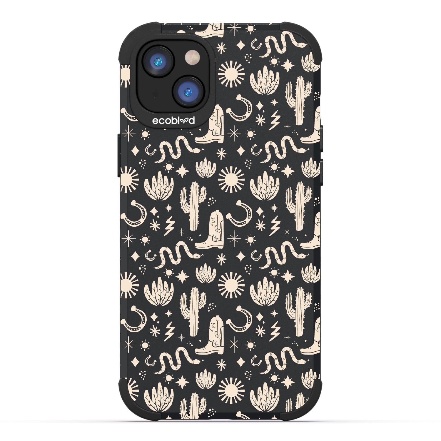 Saddle up your phone with the Mojave Collection's exclusive Wild West design on our rugged and compostable iPhone 16e, iPhone 14, and iPhone 13 case, where cacti, cowboy boots, horseshoes, suns, and lightning bolts join forces for a rodeo of rugged charm. Wrangle your protection with Western flair and take on the untamed spirit on every call and adventure. Yee-haw to desert dreams and the Wild West case, where rugged allure meets playful charm for your phone's wild frontiers!