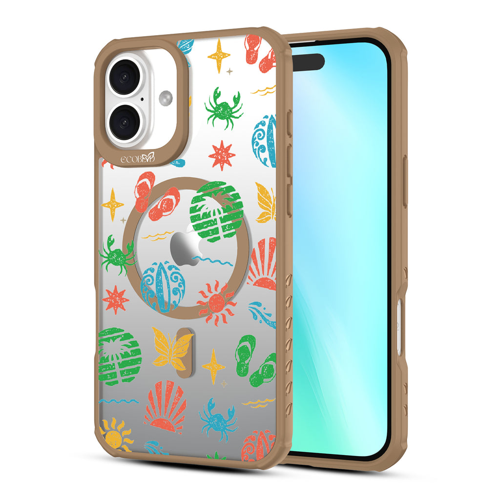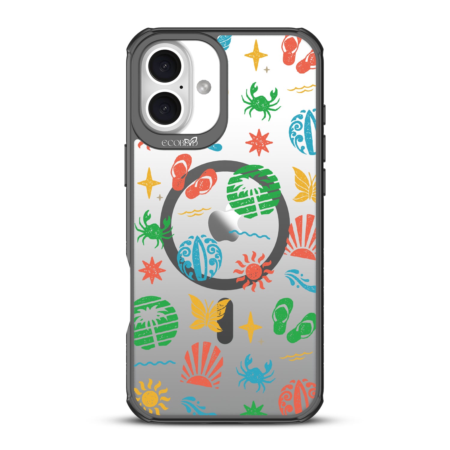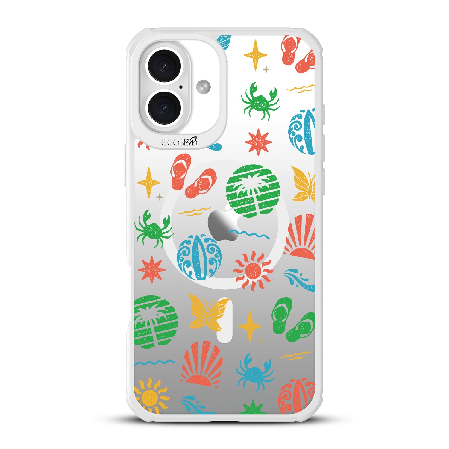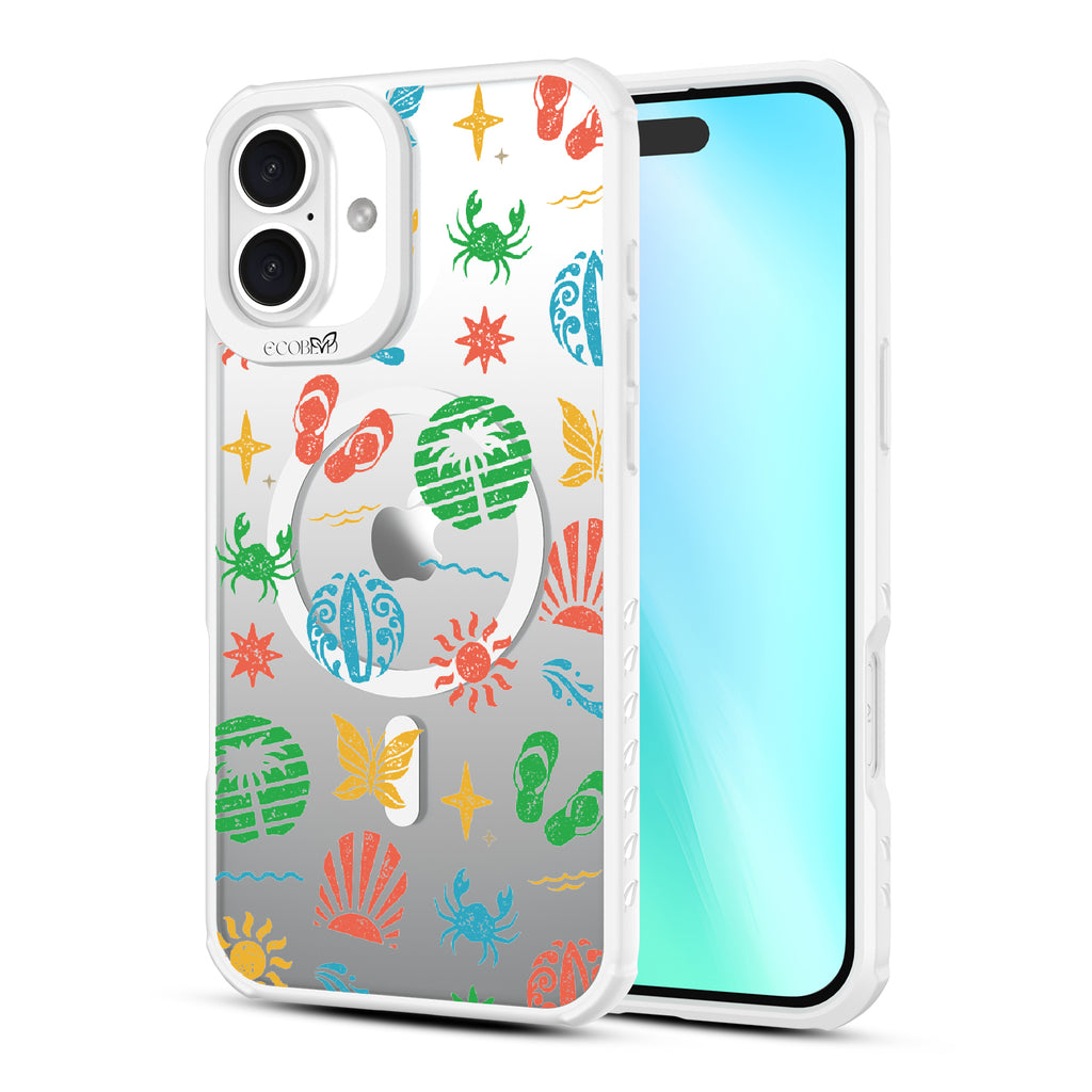 Get lost in a moment of escape with the Island Time design on our Revive clear iPhone 16 Plus phone case. Its surfboard stencil art featuring flip-flops, crabs, palm trees, the sun, stars, and waves invites you to slip into a laid-back state of mind. You'll be transported to a place where worries fade away and enjoying the present moment is all that matters. Let your phone be your passport to the carefree vibes.