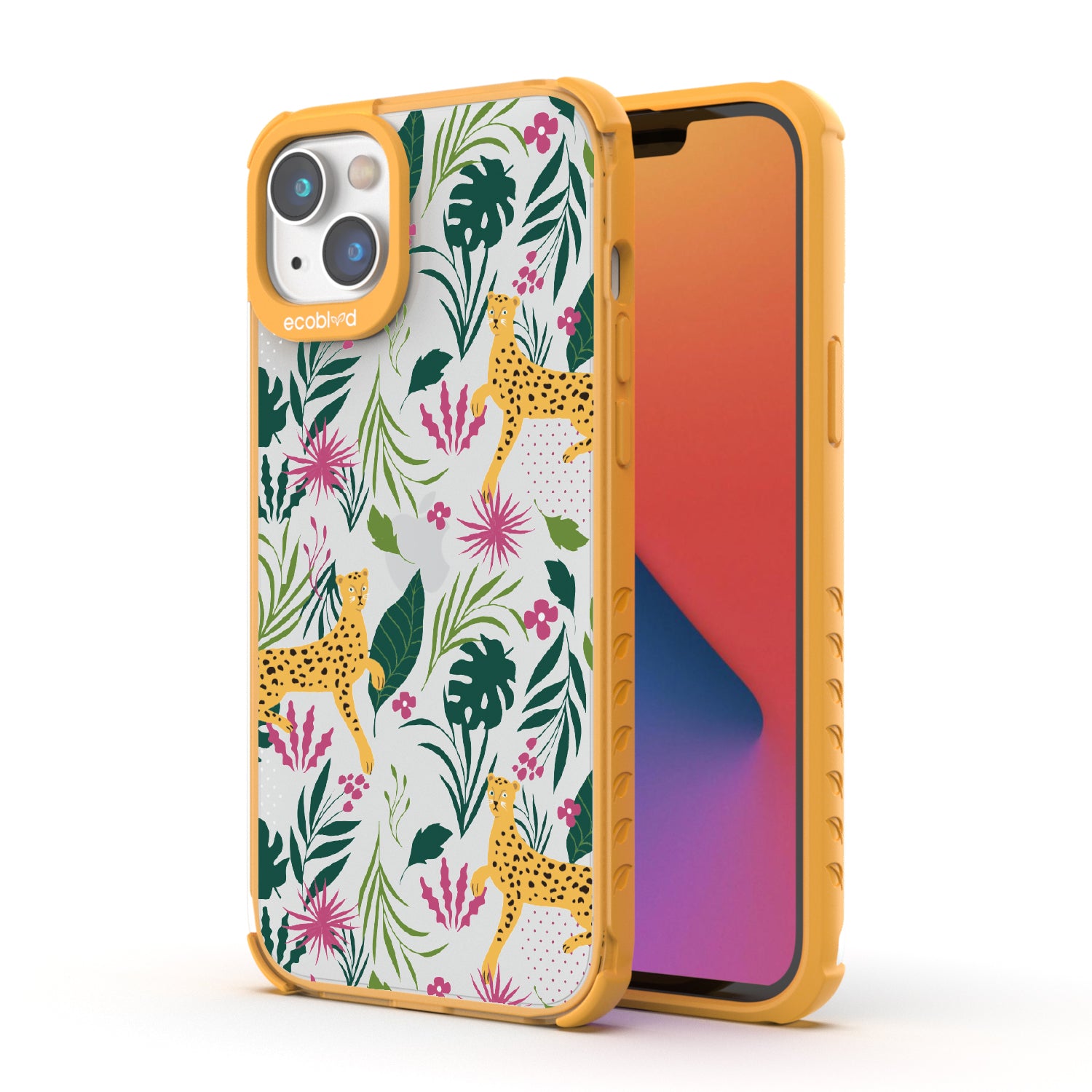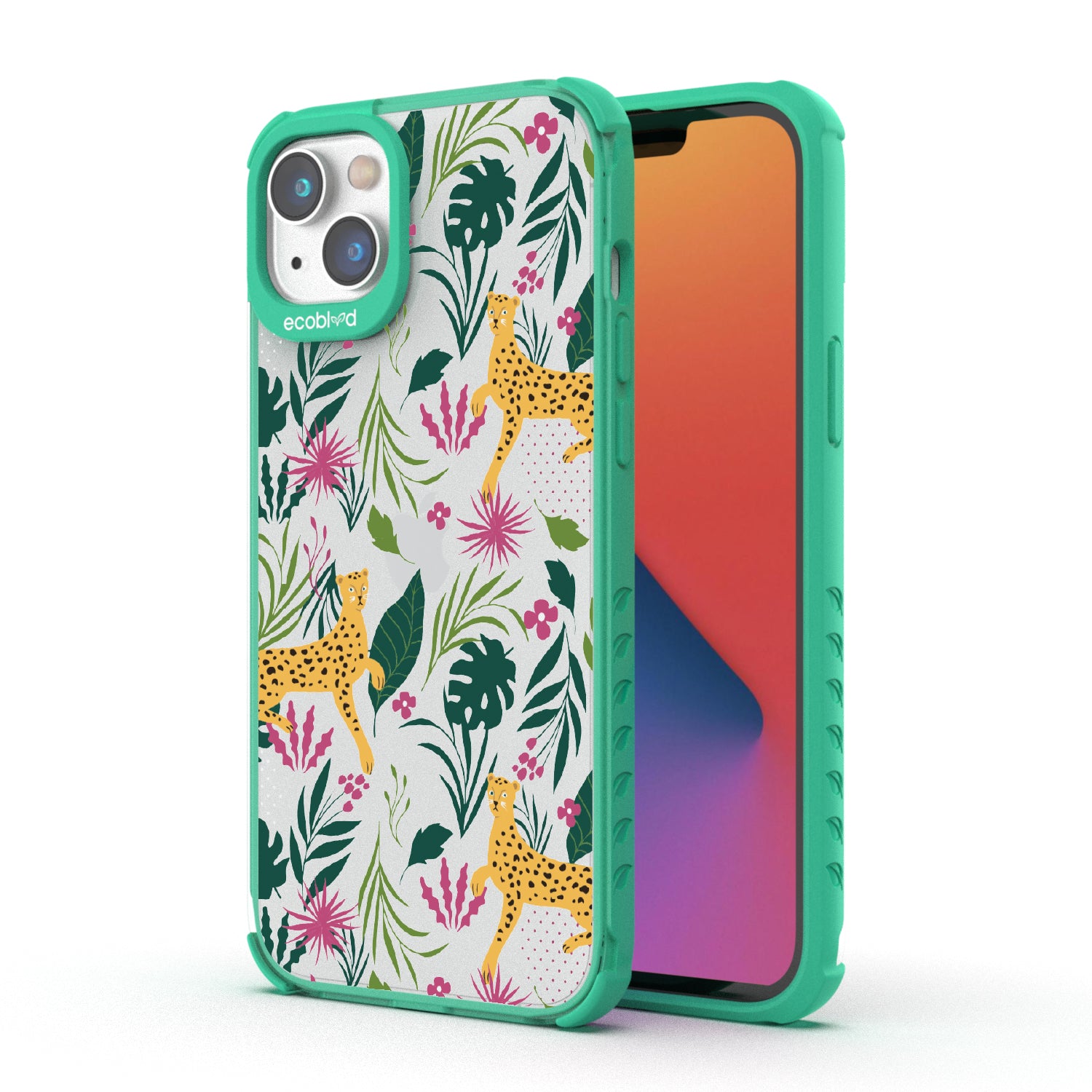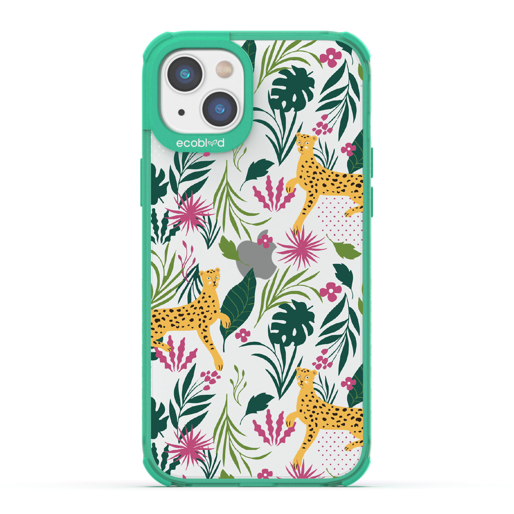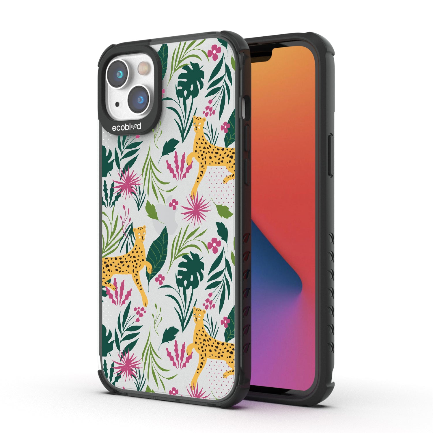 Ride the rhythm of the Jungle Boogie design, exclusively crafted for the Laguna clear iPhone 14 Plus phone case. Jungle Boogie is a phone case design that transports you to a lively, vibrant jungle scene where the natural vibe of the music is always playing. It's a representation of the lively, energetic, and playful spirit of the jungle, where everything is in motion, and the world is alive. The design features lush foliage, bright flowers, and a powerful cheetah that's always on the move, embodying the wild, untamed spirit of the jungle in four captivating colors: Midnight Black, Foliage Green, Illuminating Yellow, and Wildflower Pink.