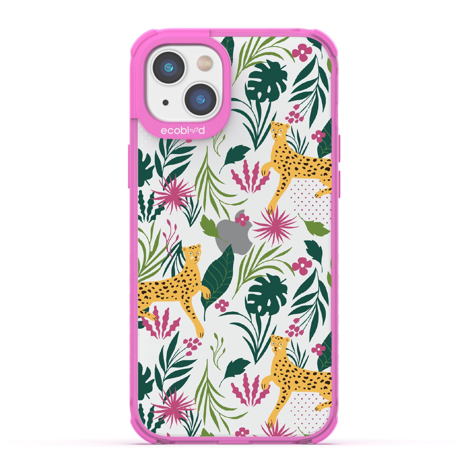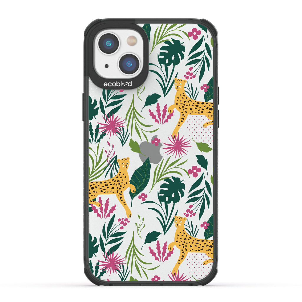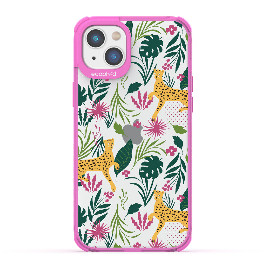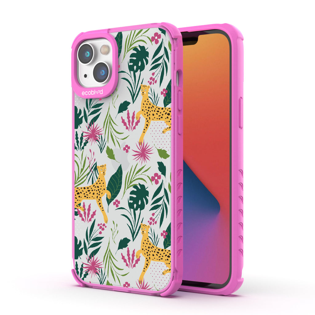 Ride the rhythm of the Jungle Boogie design, exclusively crafted for the Laguna clear iPhone 14 Plus phone case. Jungle Boogie is a phone case design that transports you to a lively, vibrant jungle scene where the natural vibe of the music is always playing. It's a representation of the lively, energetic, and playful spirit of the jungle, where everything is in motion, and the world is alive. The design features lush foliage, bright flowers, and a powerful cheetah that's always on the move, embodying the wild, untamed spirit of the jungle in four captivating colors: Midnight Black, Foliage Green, Illuminating Yellow, and Wildflower Pink.