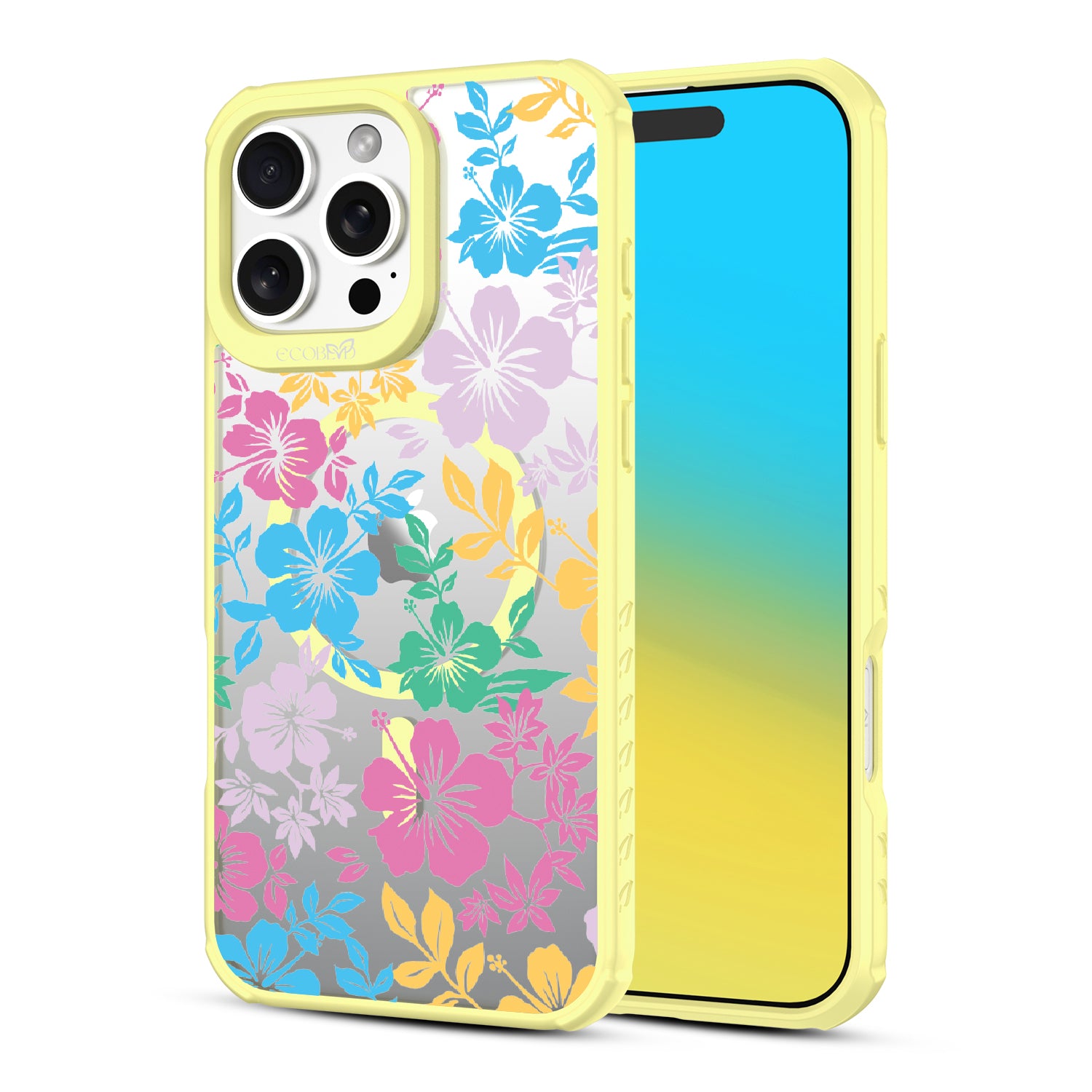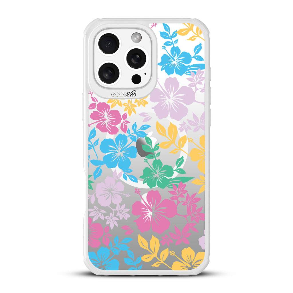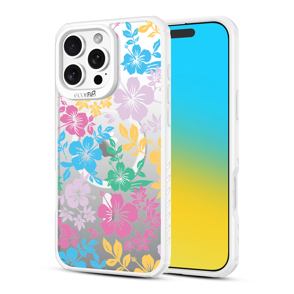 Experience the laid-back vibes of the tropics with our Lei'd Back design on our Revive clear iPhone 16 Pro Max phone case, a colorful homage to the vibrant beauty of Hawaiian leis. his design showcases an array of tropical hibiscus flowers in yellow, pink, green, and blue, reminiscent of traditional lei arrangements. Enjoy the relaxed lifestyle of an island as you escape to the spirit of aloha.
