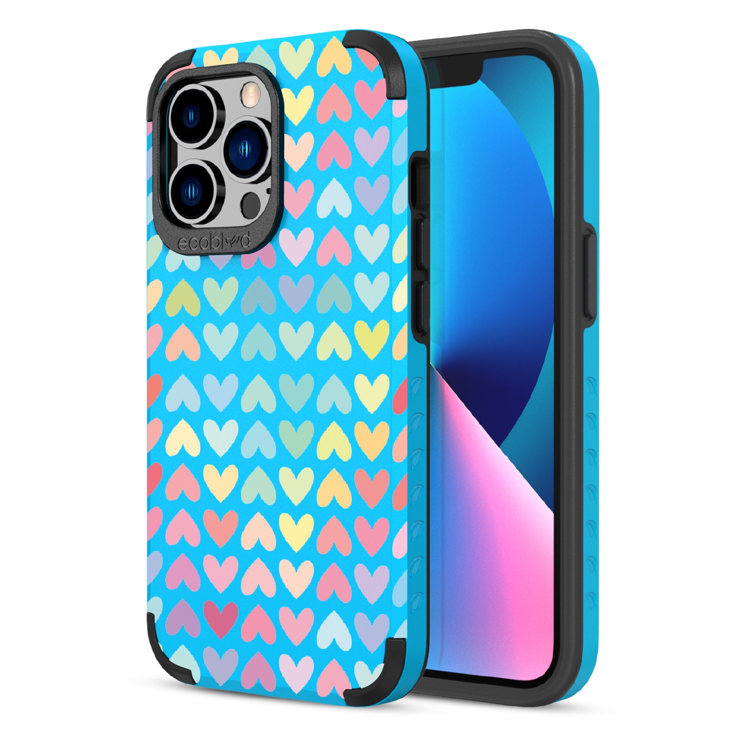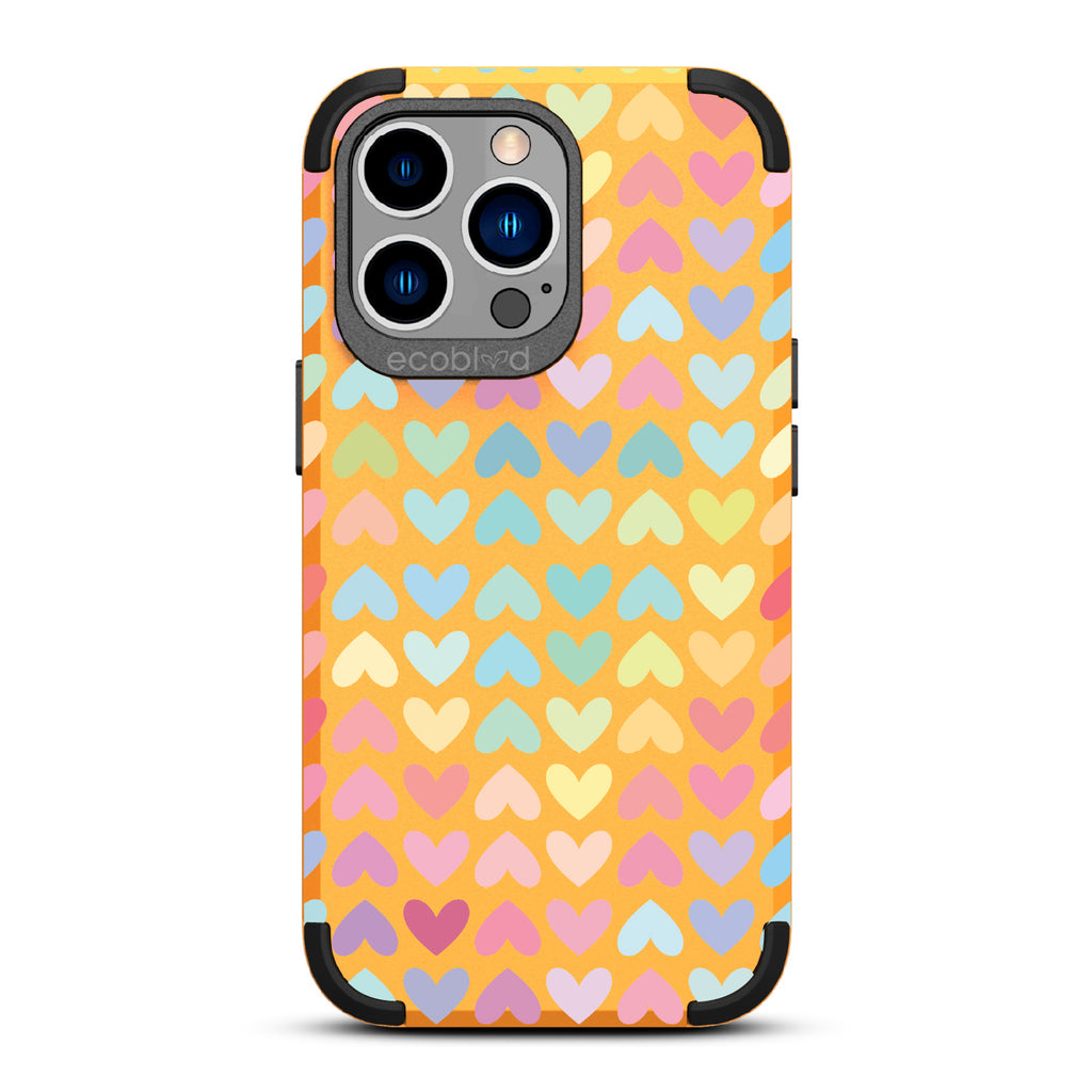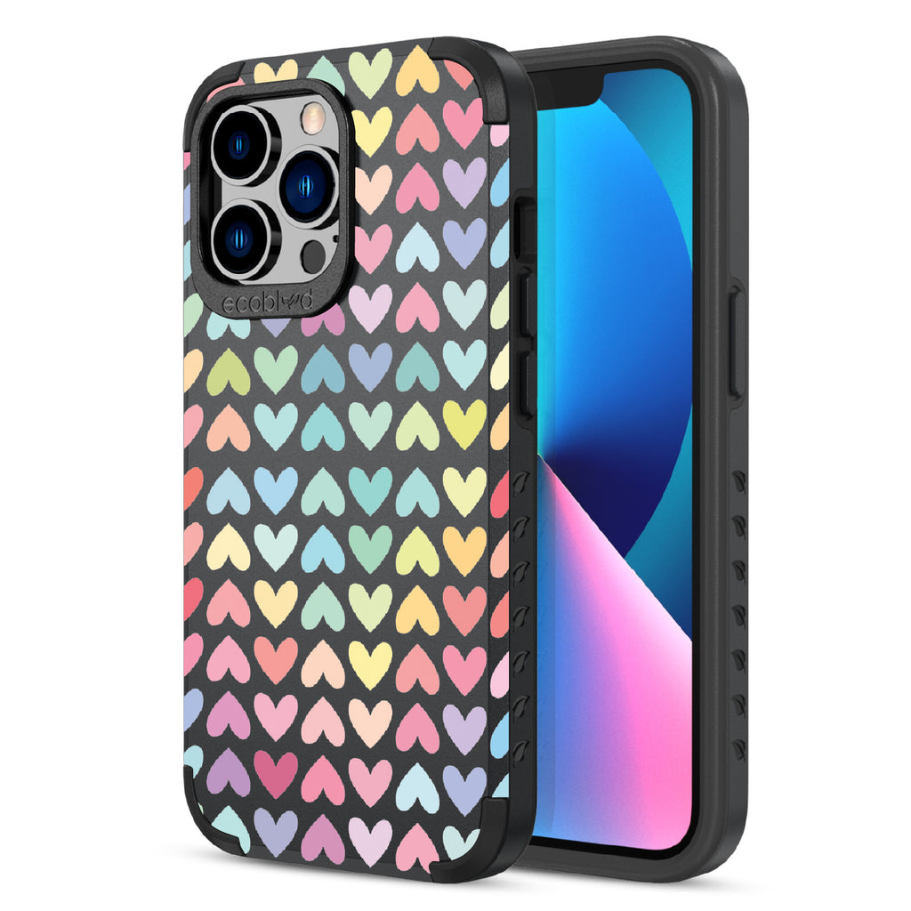 Let your phone and style spread love and equality with the rainbow hearts of the Love Is Love design on our Mojave rugged and compostable iPhone 13 Pro phone case. Choose from five vibrant color options: Midnight Black, Cascade Blue, Foliage Green, Illuminating Yellow, and Wildflower Pink.
