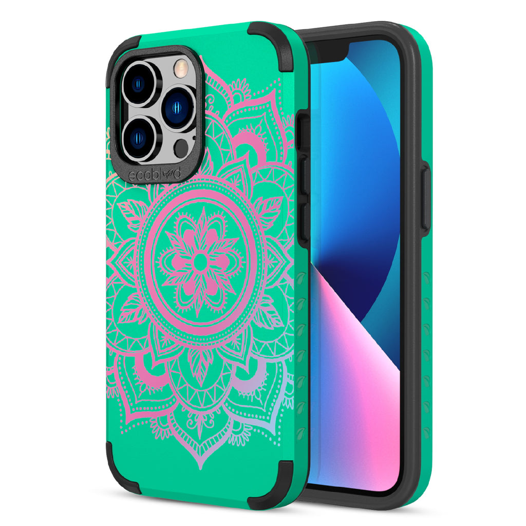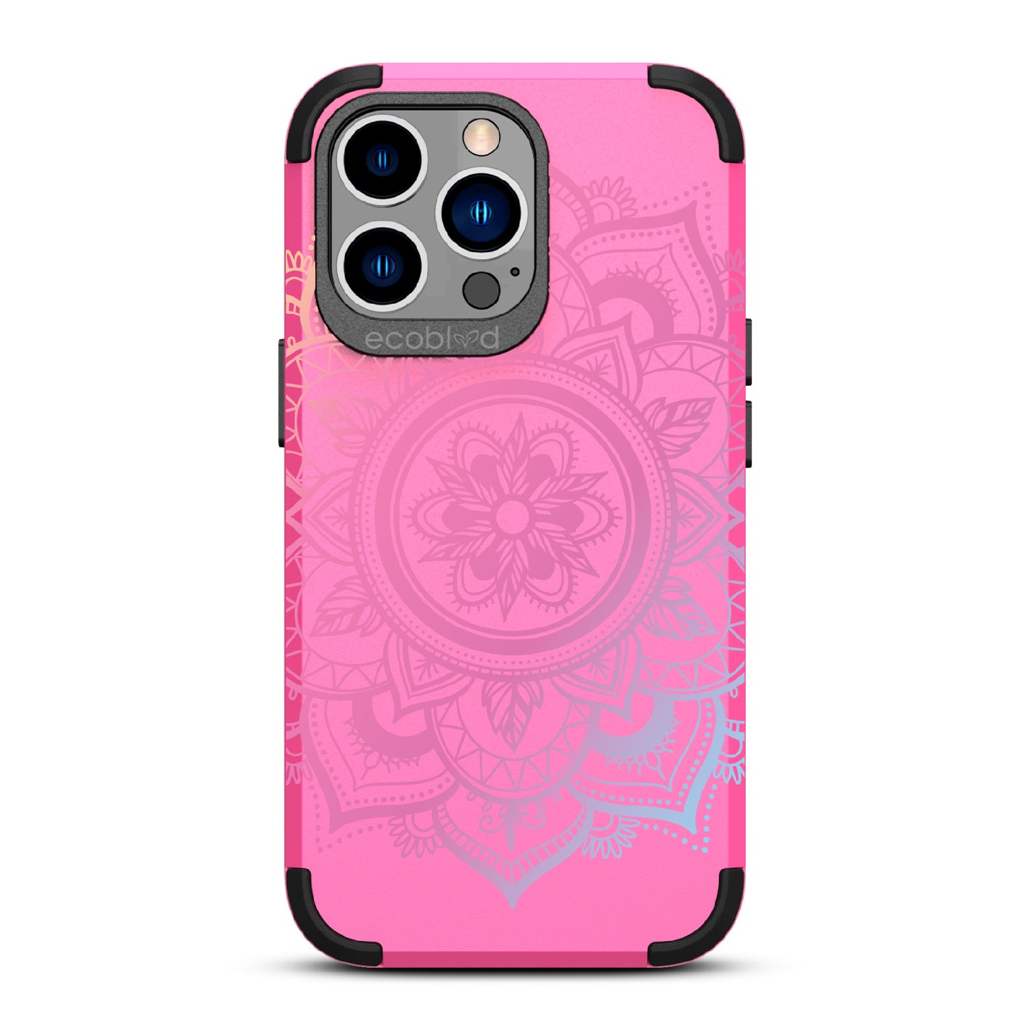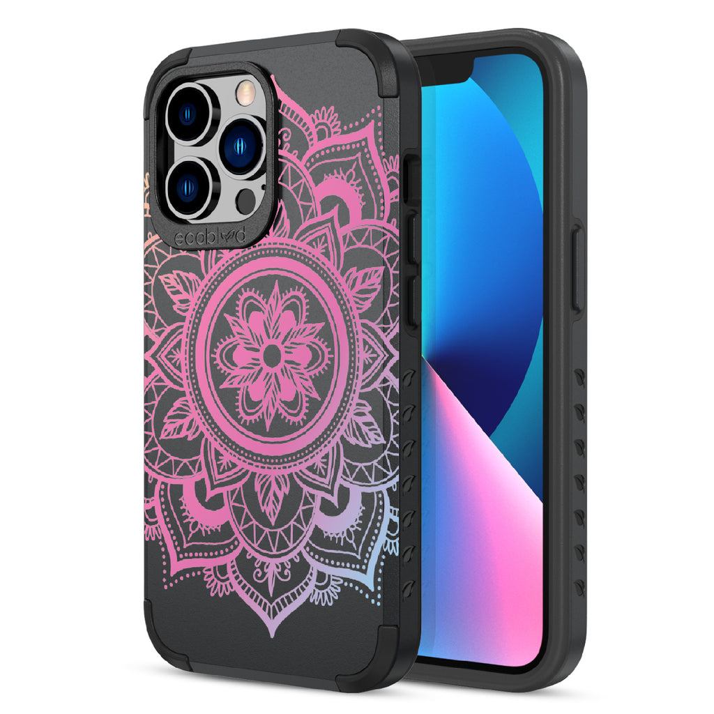 Get closer to inner peace and let your spiritual side shine in the Mandala design on our Mojave rugged and compostable iPhone 13 Pro phone case as it centers your phone and style! Choose from five vibrant colors: Midnight Black, Cascade Blue, Foliage Green, Illuminating Yellow, and Wildflower Pink.