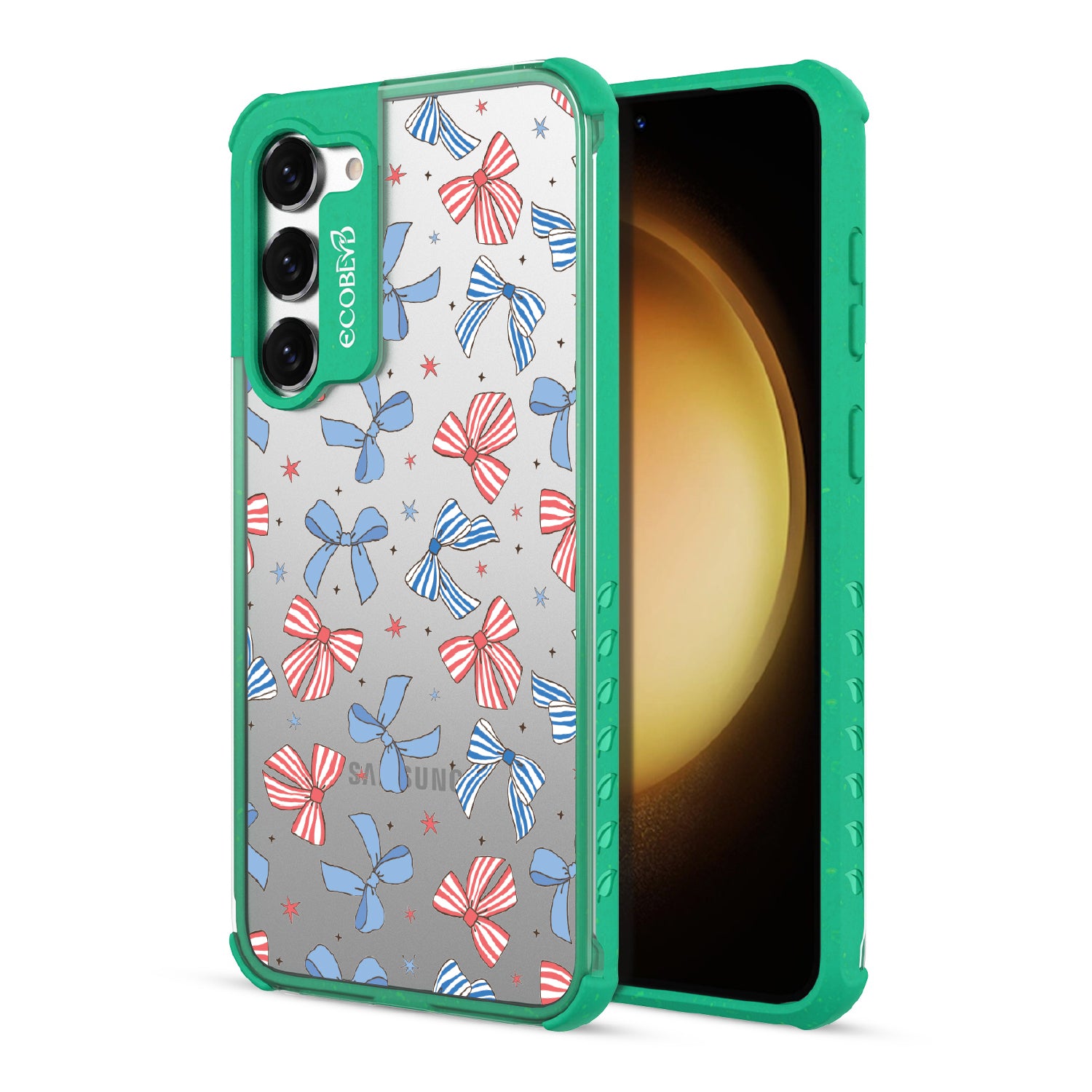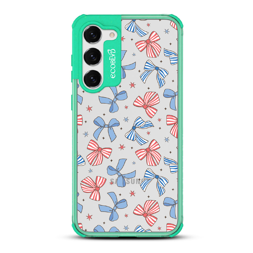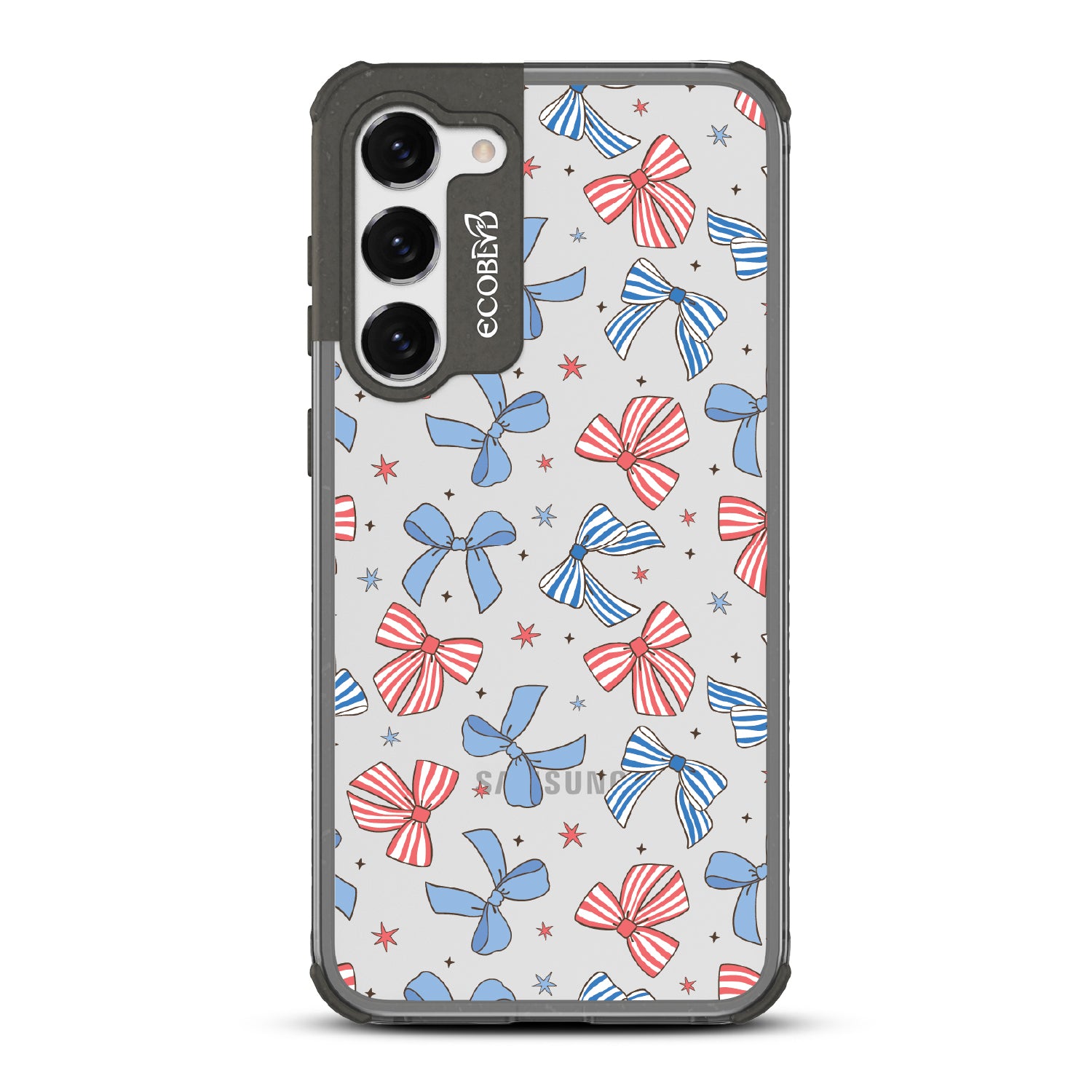 America the bow-tiful! The Miss Americana design on our Laguna clear Galaxy S23 Plus phone case crowns your phone with patriotic flair. With red, white, and blue bows, this coquette phone case design turns your phone into the belle of the Americana ball.