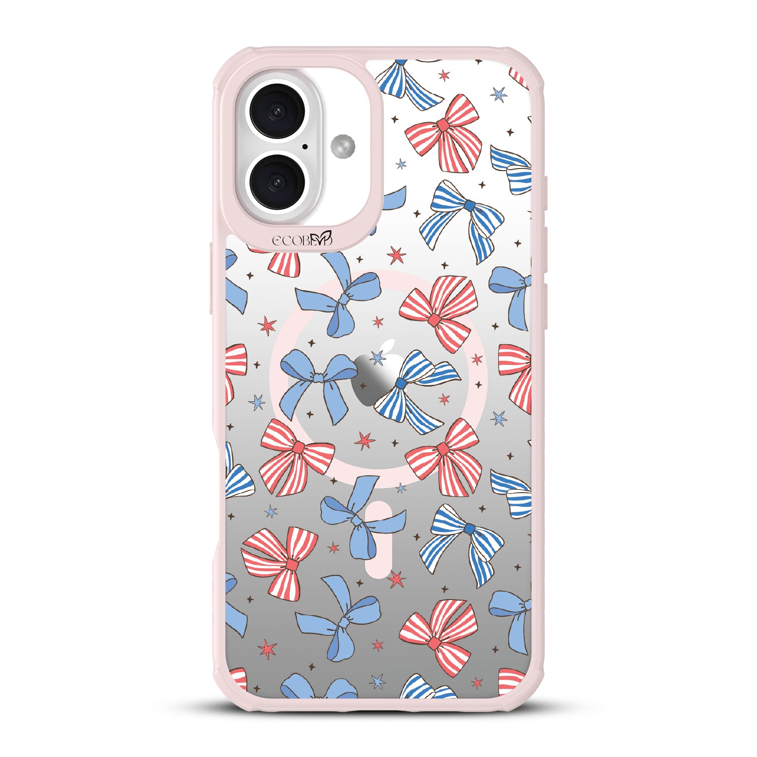 America the bow-tiful! The Miss Americana design on our Revive clear iPhone 16 Plus phone case crowns your phone with patriotic flair. With red, white, and blue bows, this coquette phone case design turns your phone into the belle of the Americana ball.