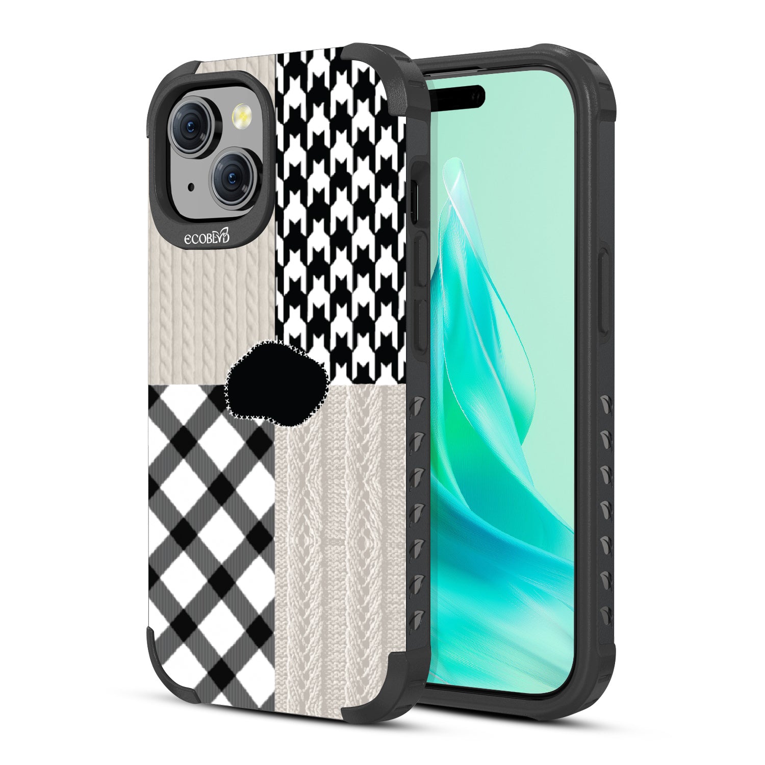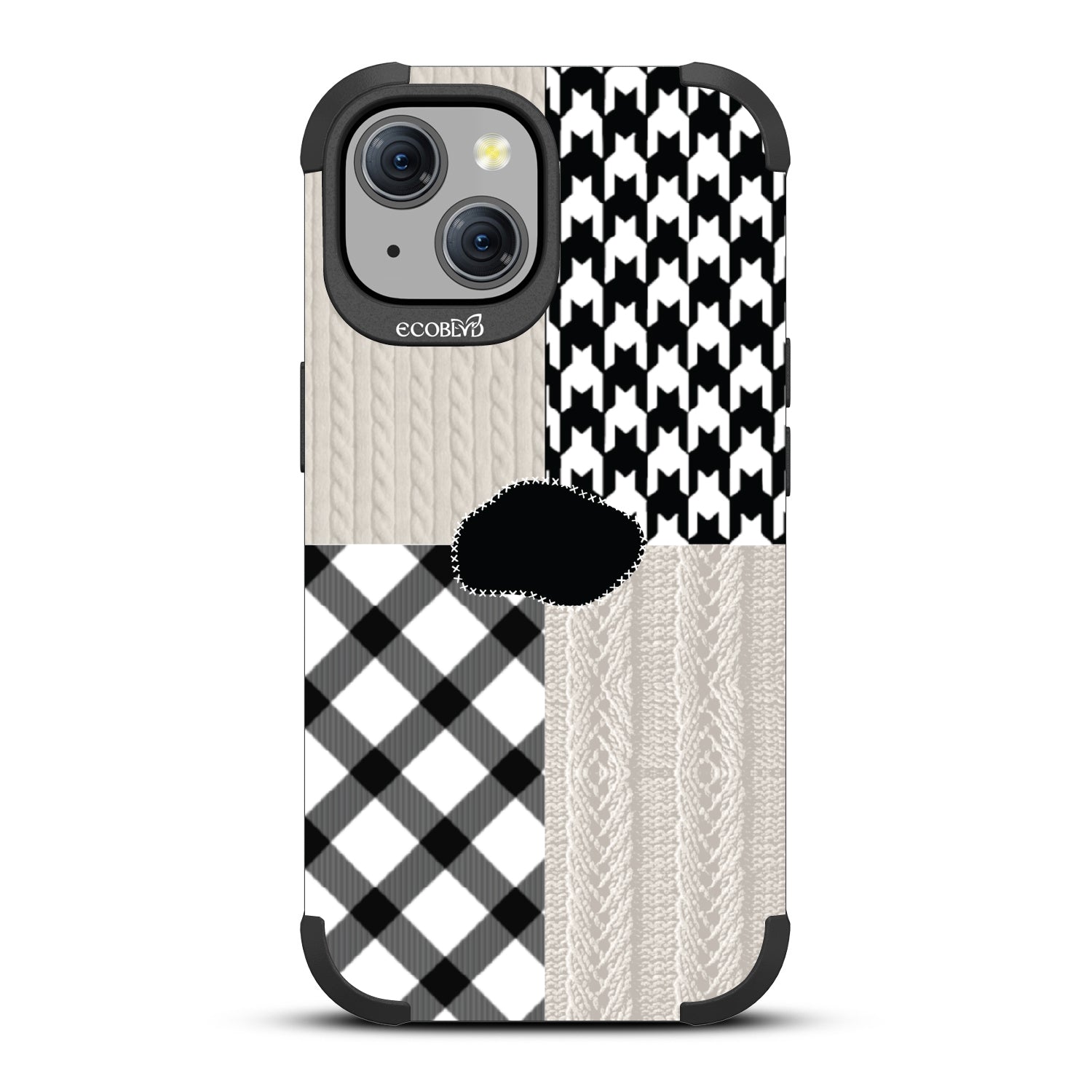 Mix and match your phone's style with the Pattern Play design on our Mojave rugged and compostable iPhone 15 MagSafe case. It's where cozy cable knit meets classic houndstooth, plaid dances with more cable knit, and the black uneven patch is the unexpected twist that makes your phone's look uniquely fabulous.