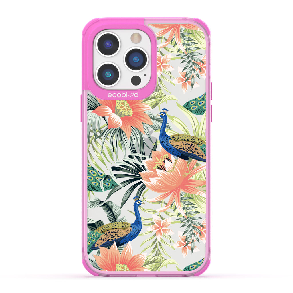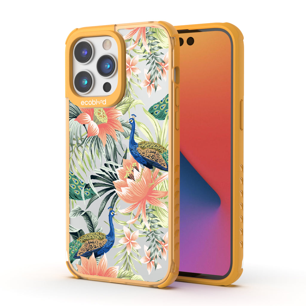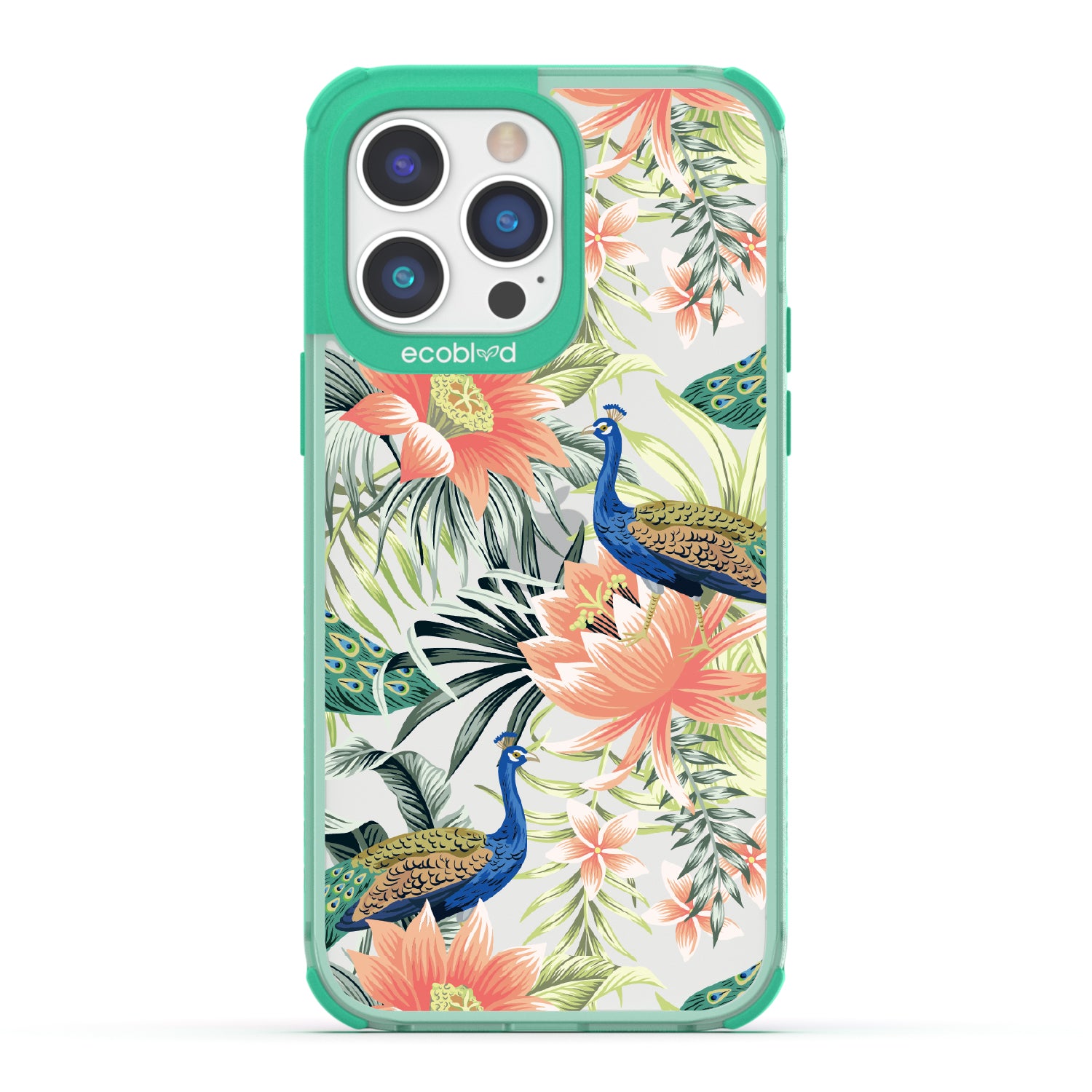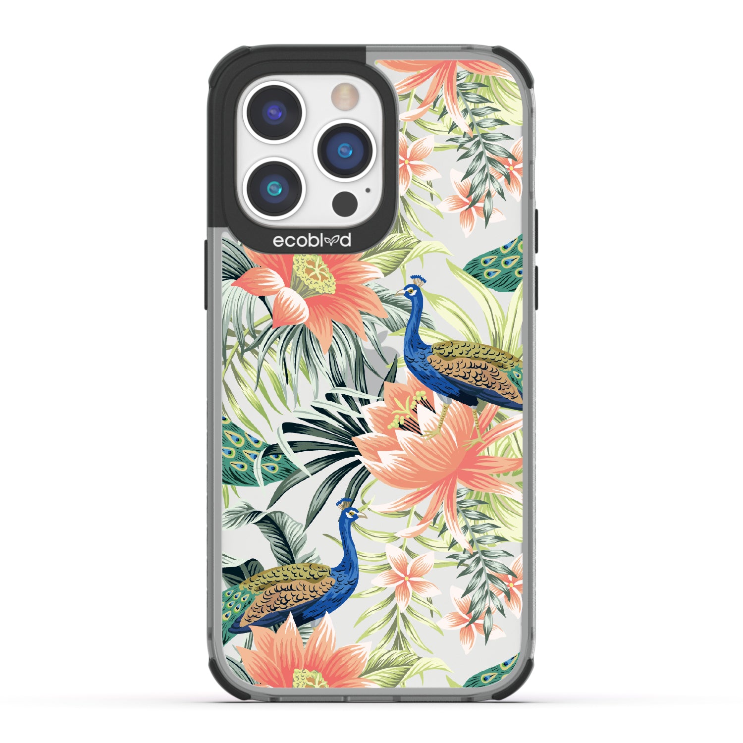 Immerse yourself in a sanctuary of regality and luxury, where the resplendent display of the peacock takes center stage on the Peacock Palace design, an exclusive design crafted for the Laguna clear iPhone 14 Pro case. Embrace the lavish colors and intricate patterns that adorn the peacock's majestic presence while supporting ocean conservation efforts. Peacock Palace is like a royal court of vibrant colors and exotic birds, a place where the peacock's lavish display can be fully appreciated in all its glory. The tropical fauna that surrounds it is like the lush gardens that adorn the palace walls, adding to its majestic charm in five captivating colors: Midnight Black, Cascade Blue, Foilage Green, Illuminating Yellow, and Wildflower Pink. So let Peacock Palace help you explore new horizons, express your true self with confidence, and revel in the luxurious beauty that surrounds you!