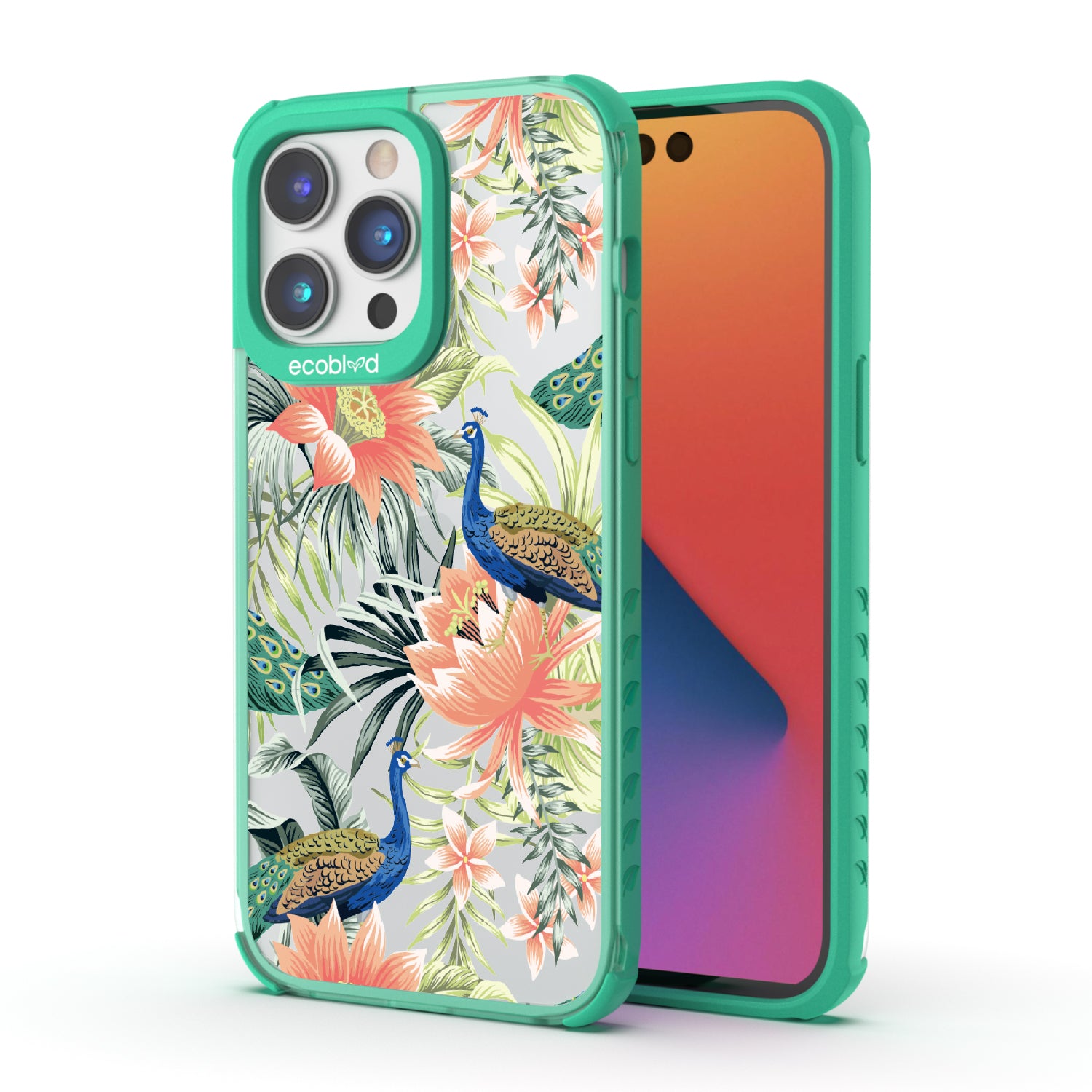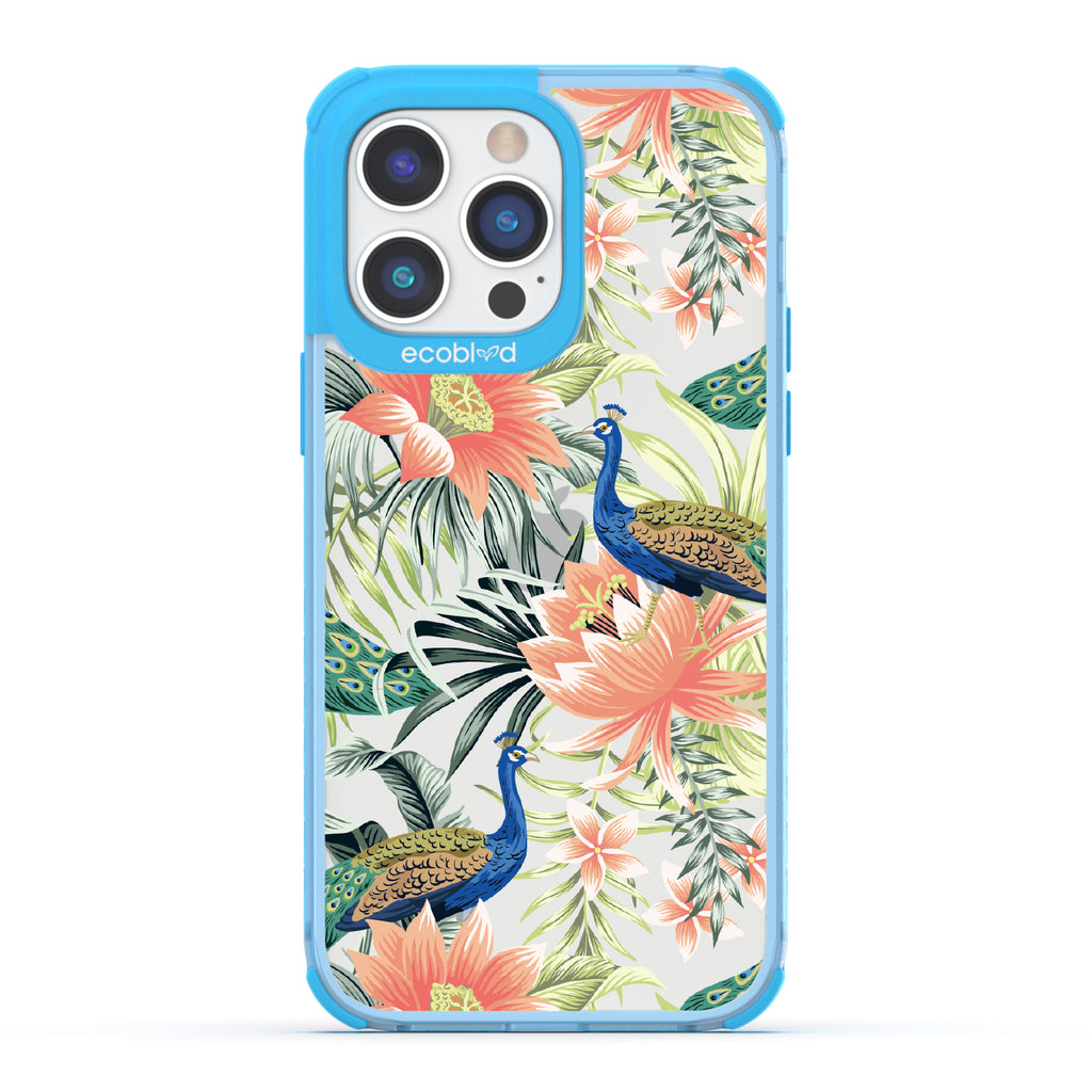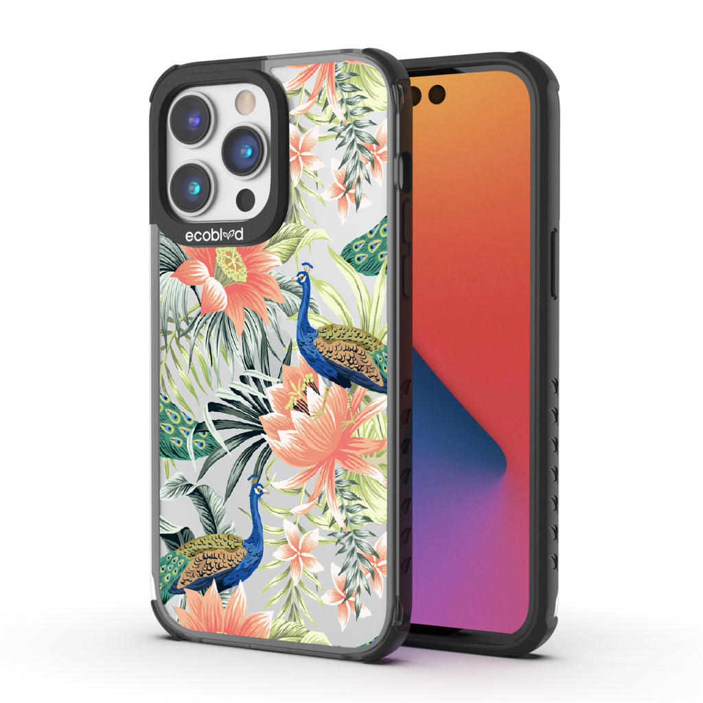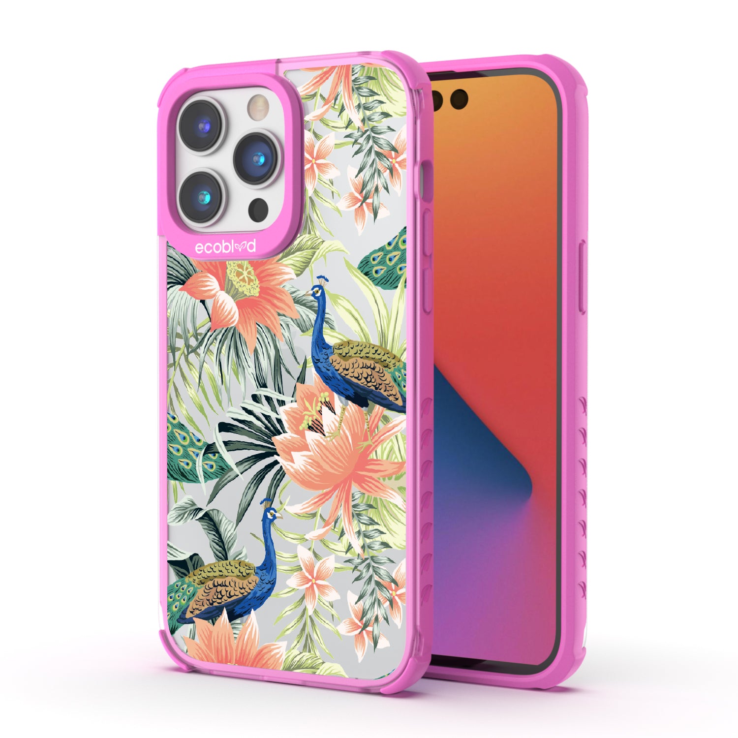 Immerse yourself in a sanctuary of regality and luxury, where the resplendent display of the peacock takes center stage on the Peacock Palace design, an exclusive design crafted for the Laguna clear iPhone 14 Pro case. Embrace the lavish colors and intricate patterns that adorn the peacock's majestic presence while supporting ocean conservation efforts. Peacock Palace is like a royal court of vibrant colors and exotic birds, a place where the peacock's lavish display can be fully appreciated in all its glory. The tropical fauna that surrounds it is like the lush gardens that adorn the palace walls, adding to its majestic charm in five captivating colors: Midnight Black, Cascade Blue, Foilage Green, Illuminating Yellow, and Wildflower Pink. So let Peacock Palace help you explore new horizons, express your true self with confidence, and revel in the luxurious beauty that surrounds you!