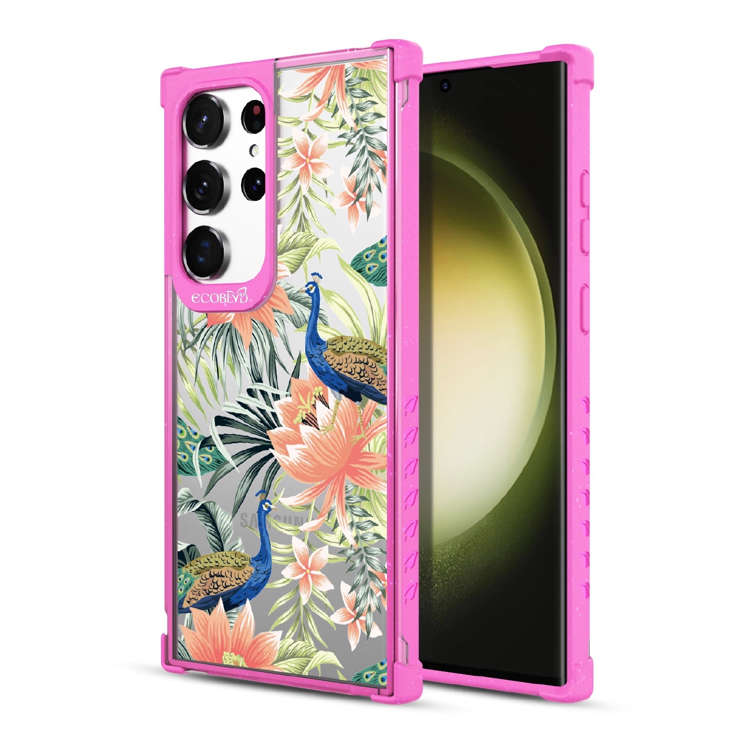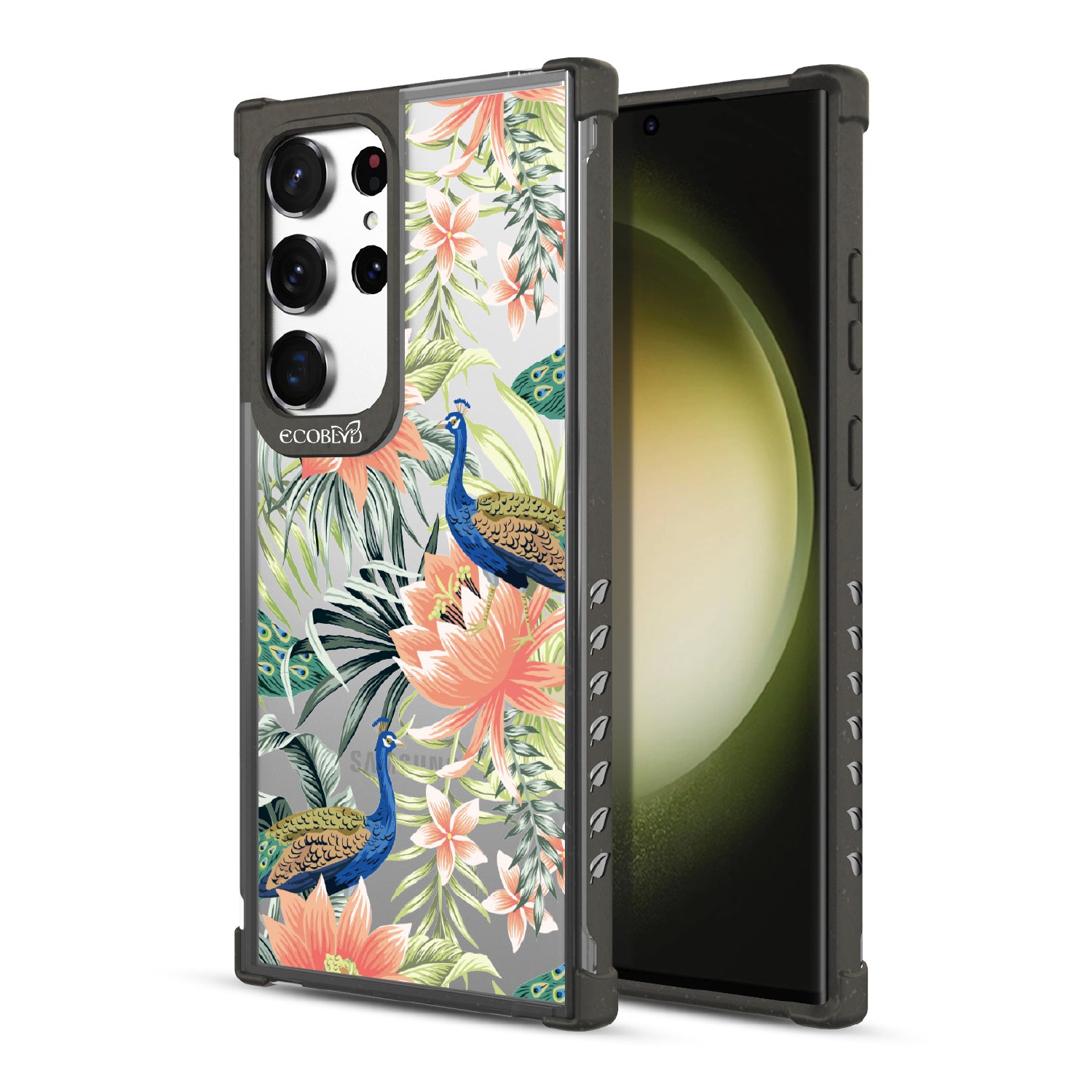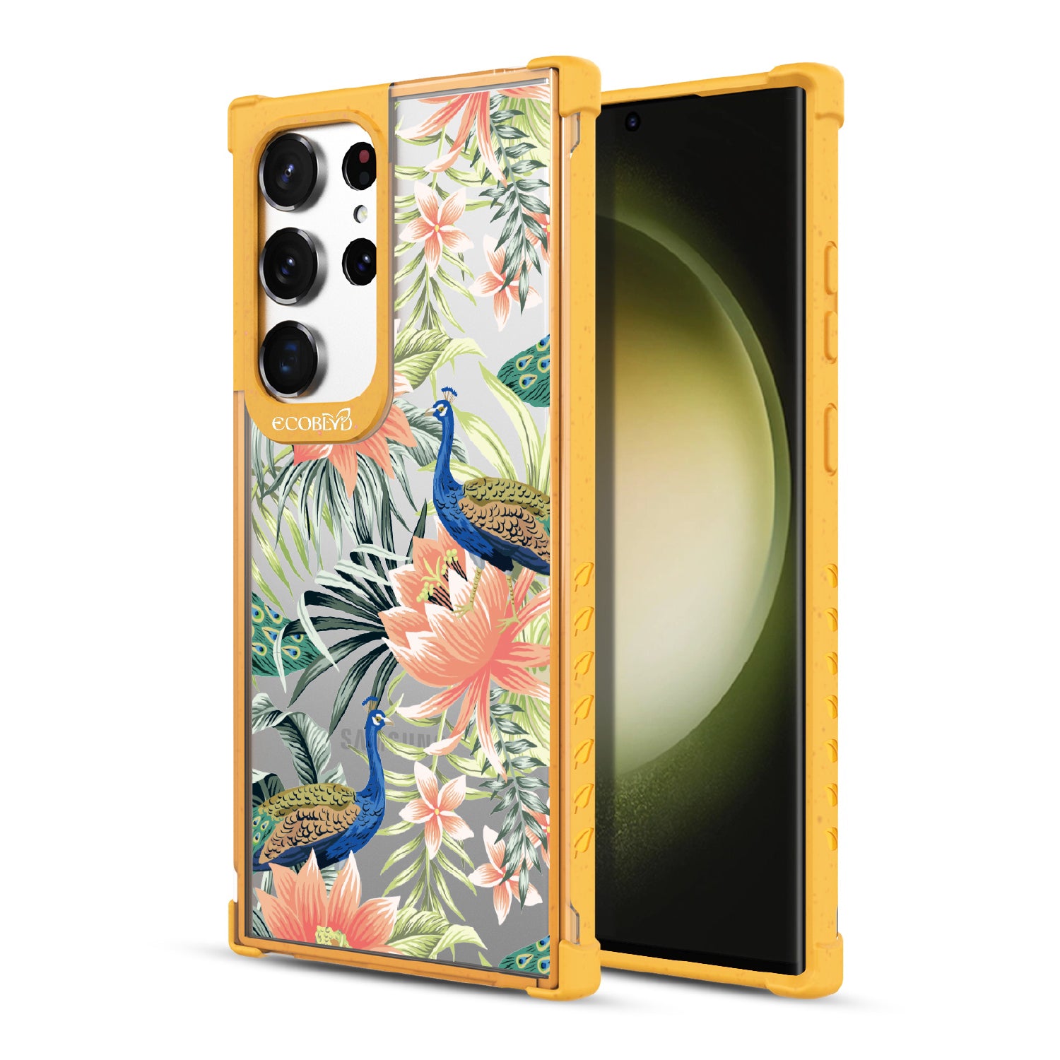Immerse yourself in a sanctuary of regality and luxury, where the resplendent display of the peacock takes center stage on the Peacock Palace design, an exclusive design crafted for the Laguna clear Galaxy S23 Ultra case. Embrace the lavish colors and intricate patterns that adorn the peacock's majestic presence while supporting ocean conservation efforts. Peacock Palace is like a royal court of vibrant colors and exotic birds, a place where the peacock's lavish display can be fully appreciated in all its glory. The tropical fauna that surrounds it is like the lush gardens that adorn the palace walls, adding to its majestic charm in five captivating colors: Midnight Black, Cascade Blue, Foilage Green, Illuminating Yellow, and Wildflower Pink. So let Peacock Palace help you explore new horizons, express your true self with confidence, and revel in the luxurious beauty that surrounds you!