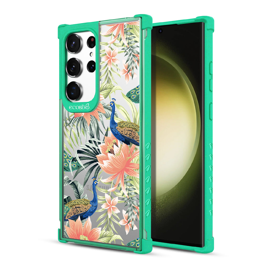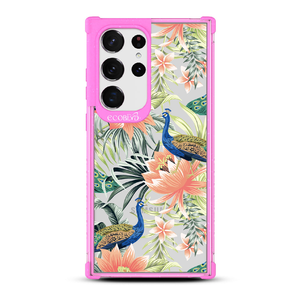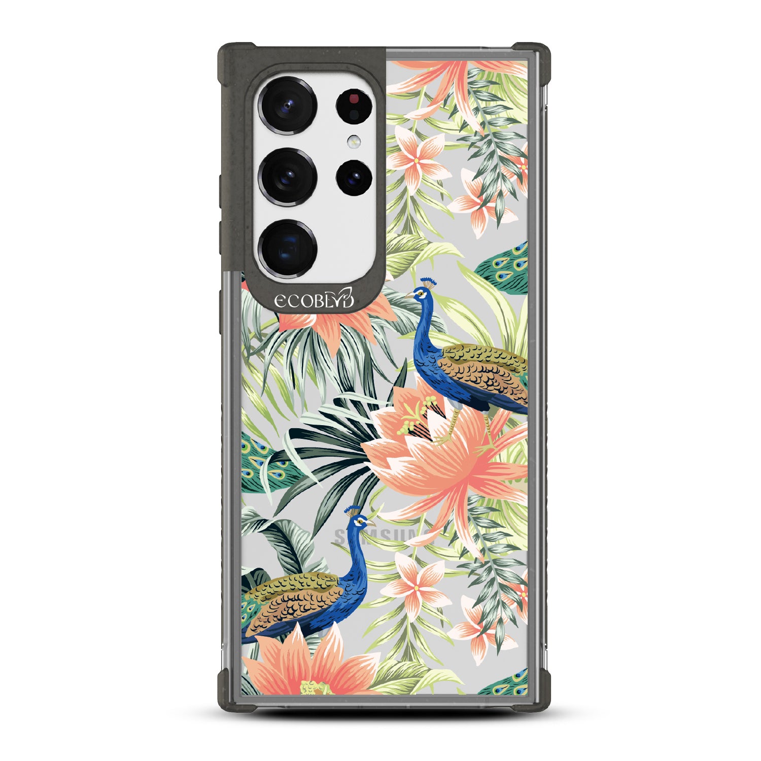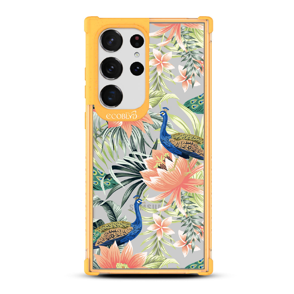 Immerse yourself in a sanctuary of regality and luxury, where the resplendent display of the peacock takes center stage on the Peacock Palace design, an exclusive design crafted for the Laguna clear Galaxy S23 Ultra case. Embrace the lavish colors and intricate patterns that adorn the peacock's majestic presence while supporting ocean conservation efforts. Peacock Palace is like a royal court of vibrant colors and exotic birds, a place where the peacock's lavish display can be fully appreciated in all its glory. The tropical fauna that surrounds it is like the lush gardens that adorn the palace walls, adding to its majestic charm in five captivating colors: Midnight Black, Cascade Blue, Foilage Green, Illuminating Yellow, and Wildflower Pink. So let Peacock Palace help you explore new horizons, express your true self with confidence, and revel in the luxurious beauty that surrounds you!